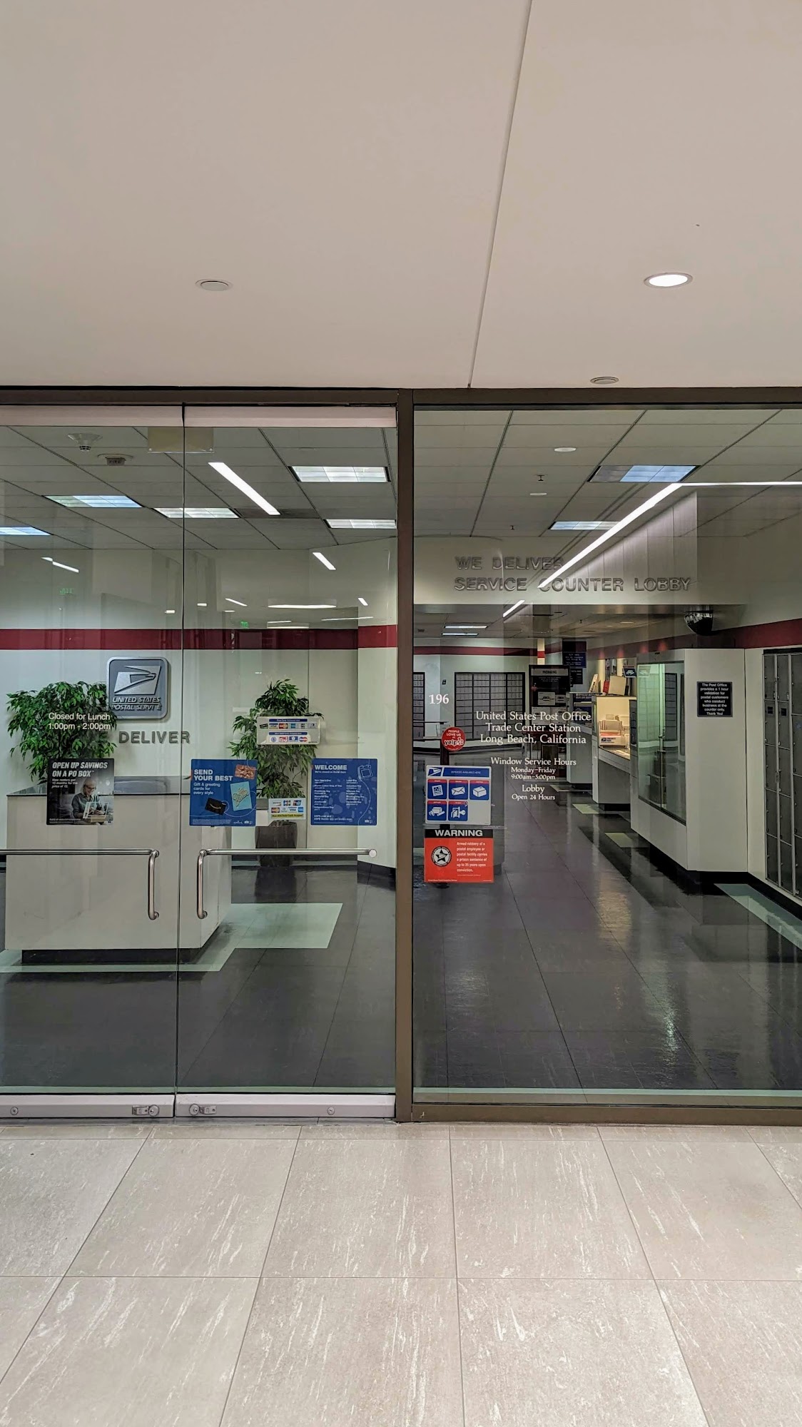 This is such a cool USPS Office location inside the big building first floor. One of the best I have ever came across. It is spotless clean. The staff are super friendly and were quick to help! Make sure to visit before 11:30am and after 2:00pm in case there are lunch times that interfere with office being closed.