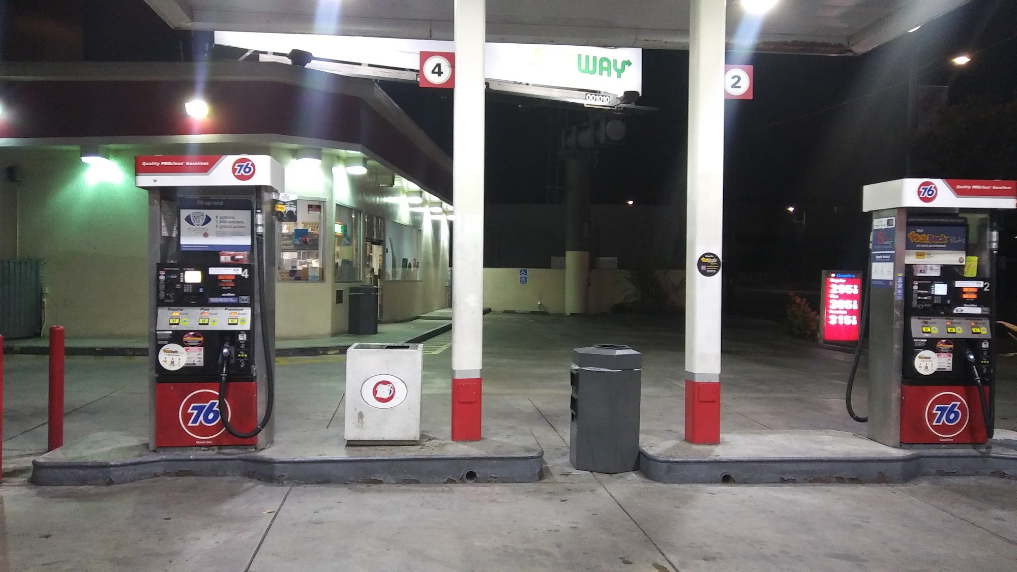 Twenty four hours open i went there 1.30 am it was open and also its so clean place and very close to freeway. if you need to gas you can stop by but there's no restrooms. Always priced at standard rates.