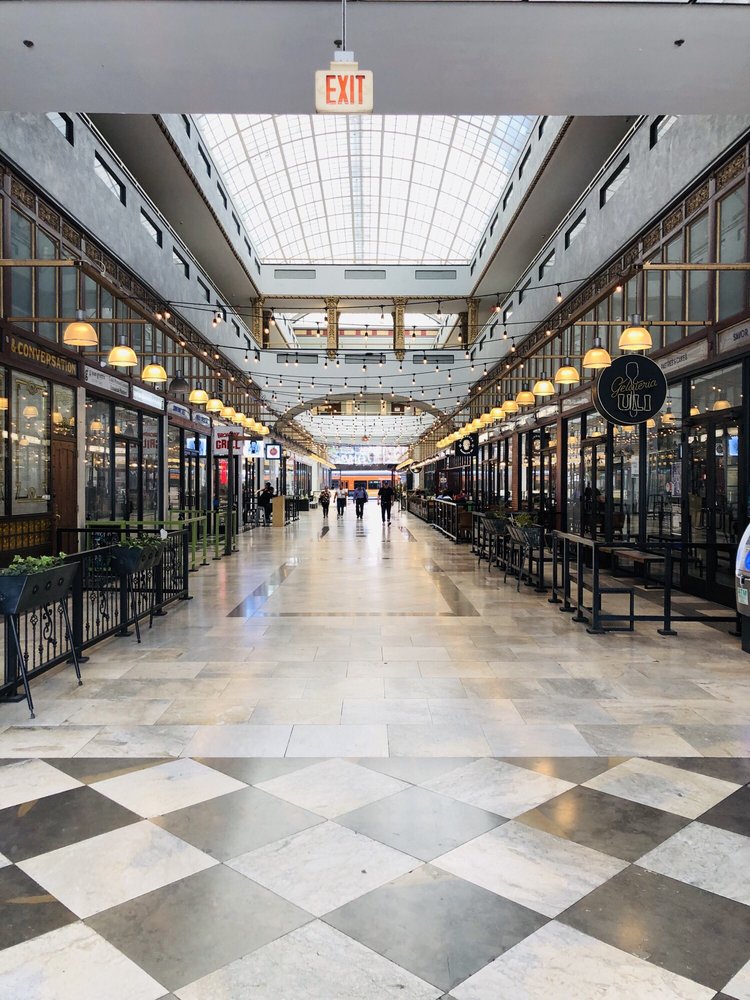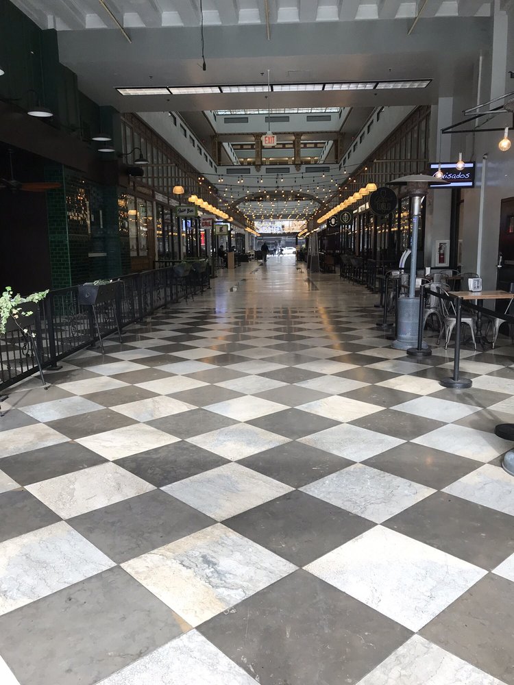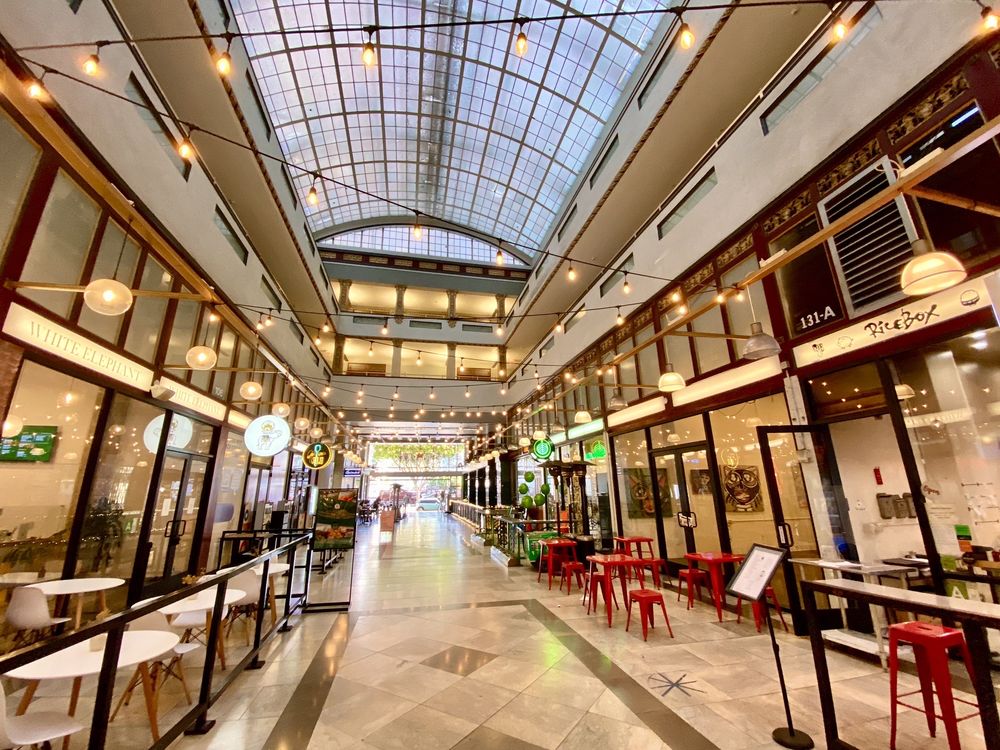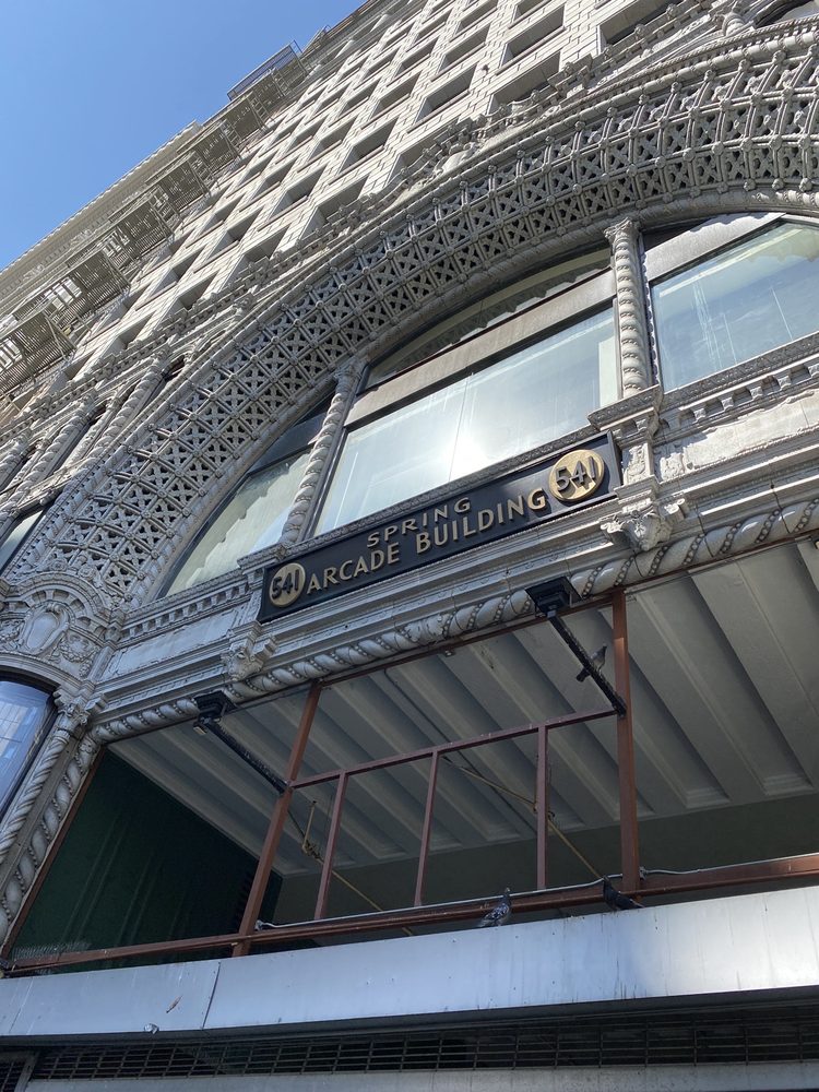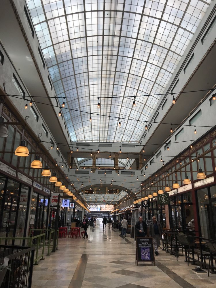 The Spring Arcade, built in 1924, is a unique two-tower building that spans the length of Spring Street to Broadway in the heart of the Historic Core of Downtown Los Angeles. Originally designed to maintain the ambiance of the former Mercantile Place, the Arcade features a grand, airy, arched arcade at ground level, with a glass-roofed skylight dome inspired by the grand 19th century shopping arcades of Paris and London. Inside, the multilevel arcade once hosted over five dozen shops, but now focuses on a handful of low-key eateries at a ground-level food court. The interior is clean and well-maintained, offering a variety of dining options, from Thai to New American, as well as an ice cream vending machine, all at different price points. The Spring Arcade is a beautiful historic building worth exploring, even if you're not looking to dine or shop. It's a great place to wander through while walking downtown, with the Spring Arcade Coffee House being a particular highlight, known for its lovely owner and delicious coffee, including a delicious hazelnut iced coffee.