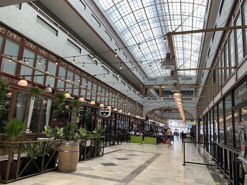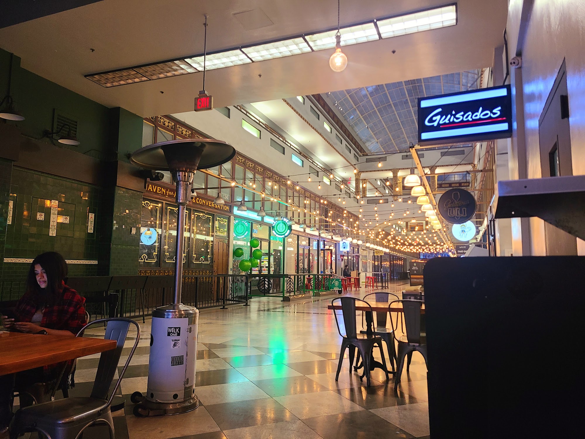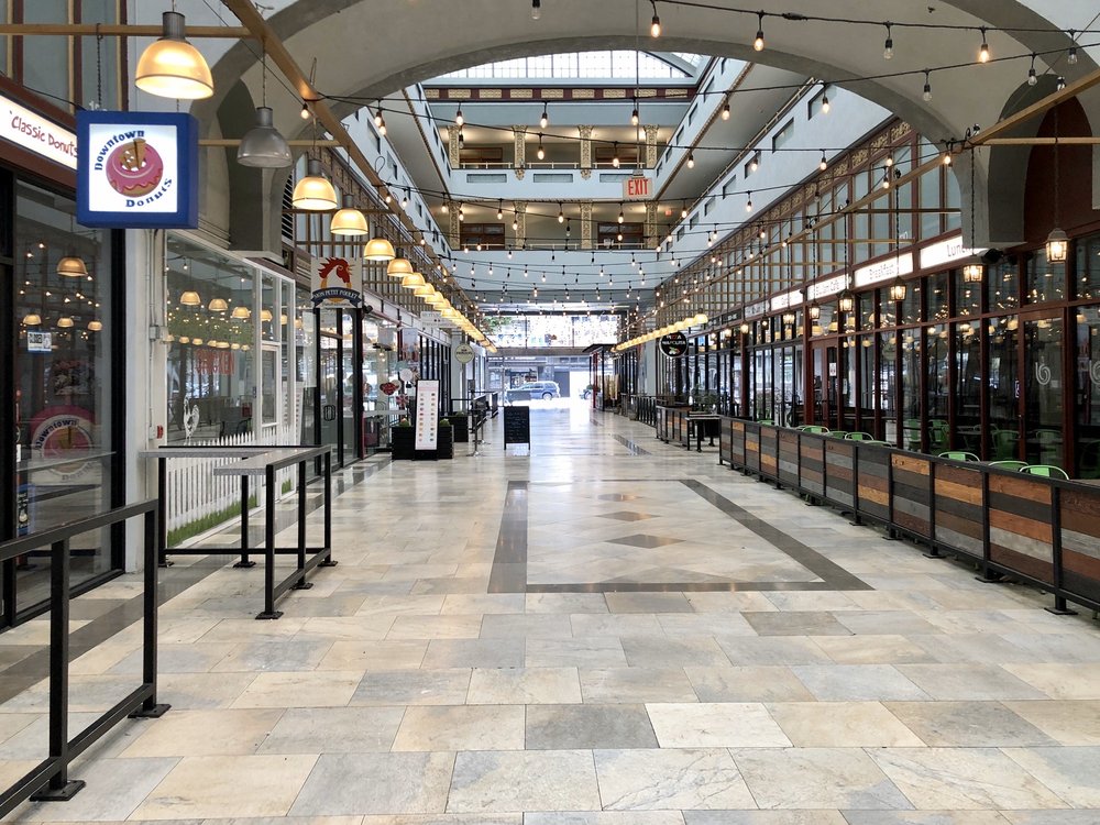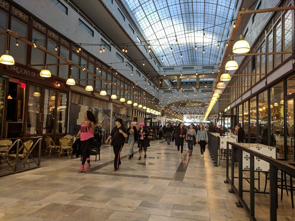 The Spring Arcade, built in 1924, is a unique two-tower building that spans the length of Spring Street to Broadway in the heart of the Historic Core of Downtown Los Angeles. Originally designed to maintain the ambiance of the former Mercantile Place, the Arcade features a grand, airy, arched arcade at ground level, with a glass-roofed skylight dome inspired by the grand 19th century shopping arcades of Paris and London. Inside, the multilevel arcade once hosted over five dozen shops, but now focuses on a handful of low-key eateries at a ground-level food court. The interior is clean and well-maintained, offering a variety of dining options, from Thai to New American, as well as an ice cream vending machine, all at different price points. The Spring Arcade is a beautiful historic building worth exploring, even if you're not looking to dine or shop. It's a great place to wander through while walking downtown, with the Spring Arcade Coffee House being a particular highlight, known for its lovely owner and delicious coffee, including a delicious hazelnut iced coffee.