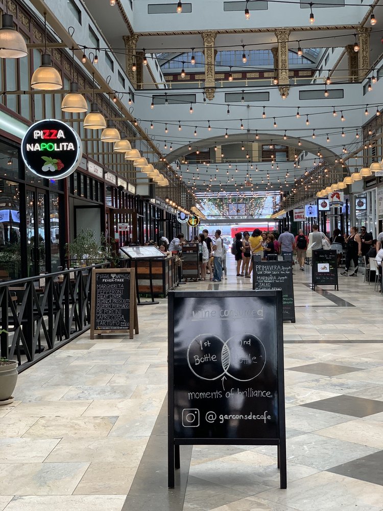 variety of restaurants, indoor leads to outdoor, outdoor parking spots available nearby, facilities are somewhat clean.