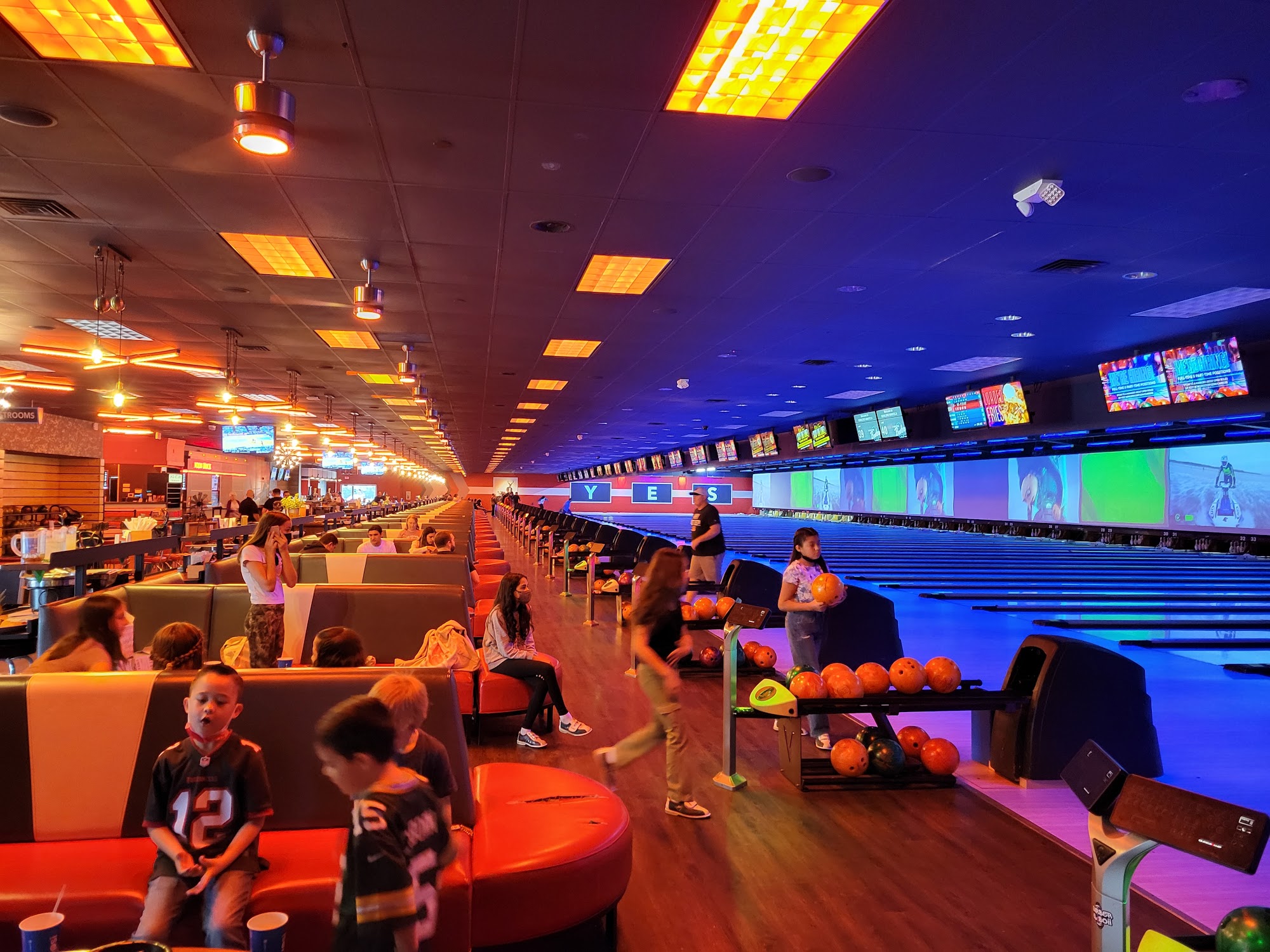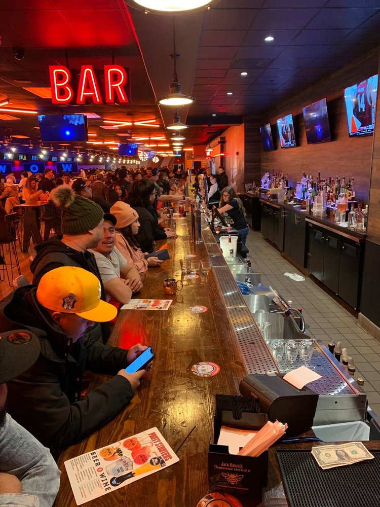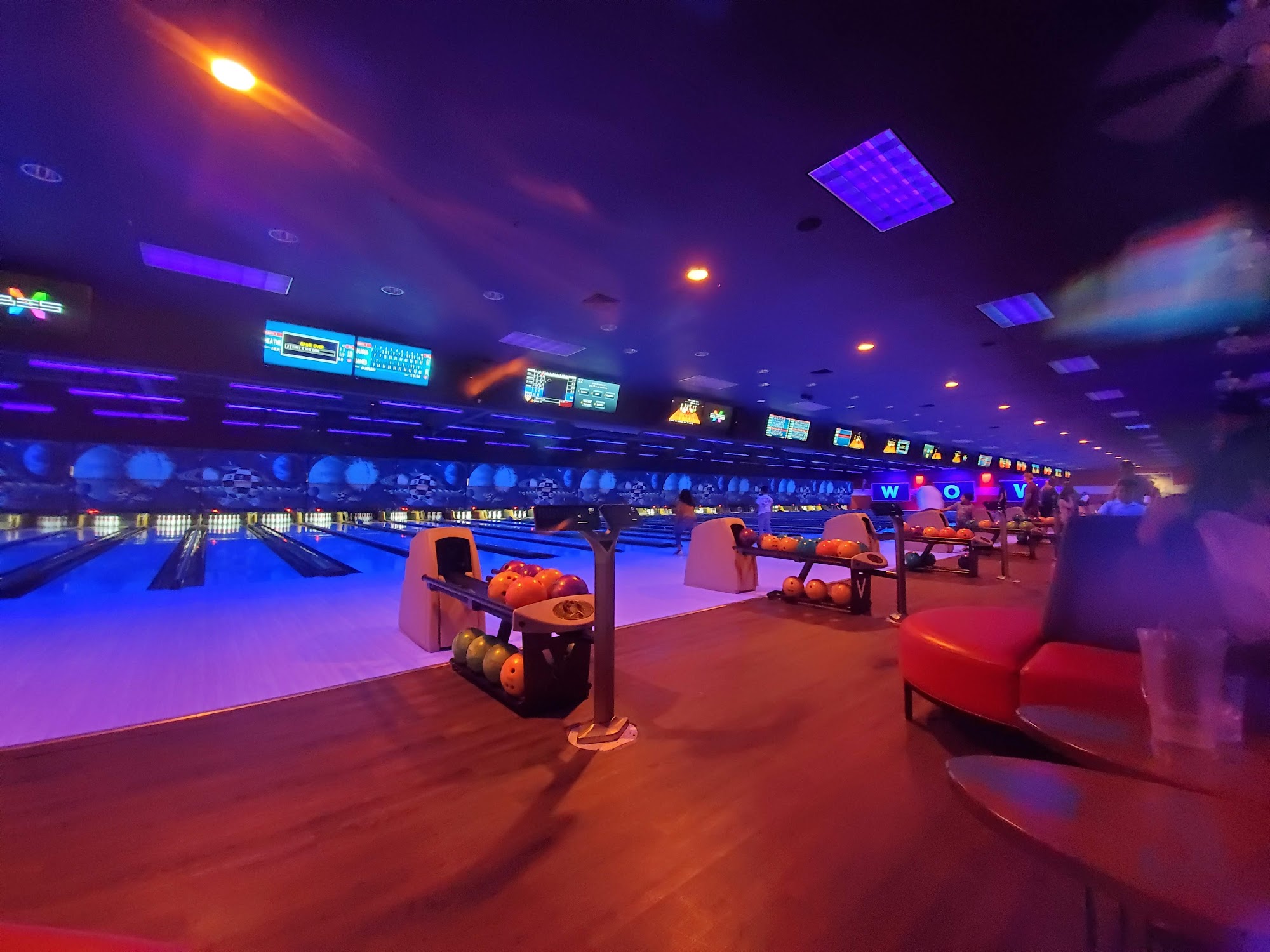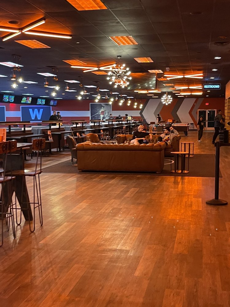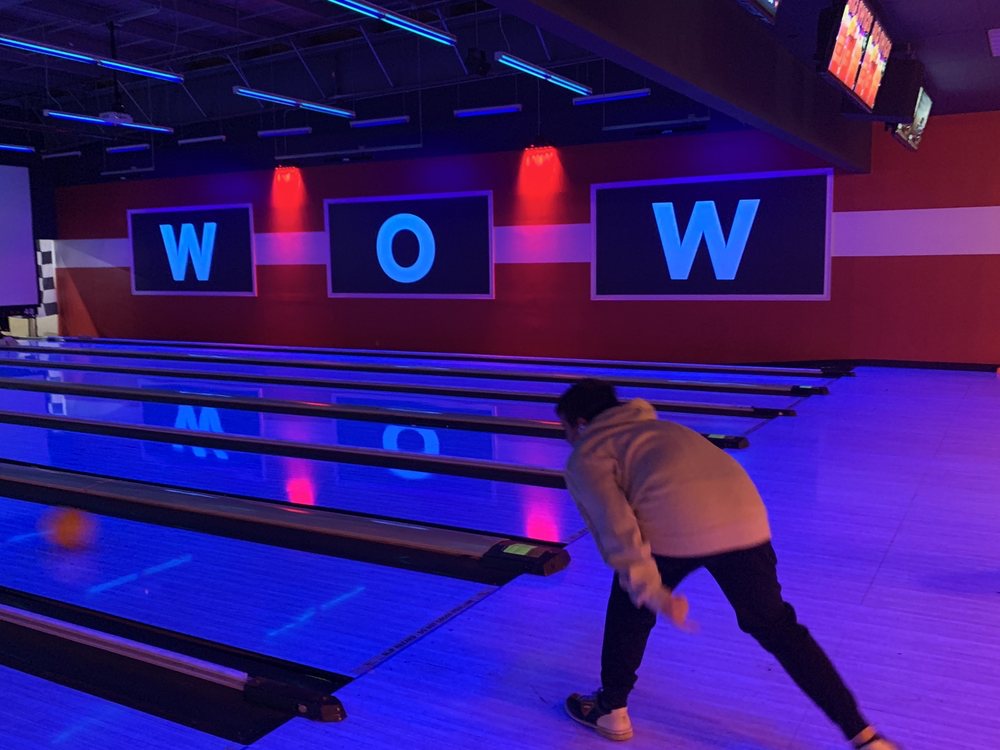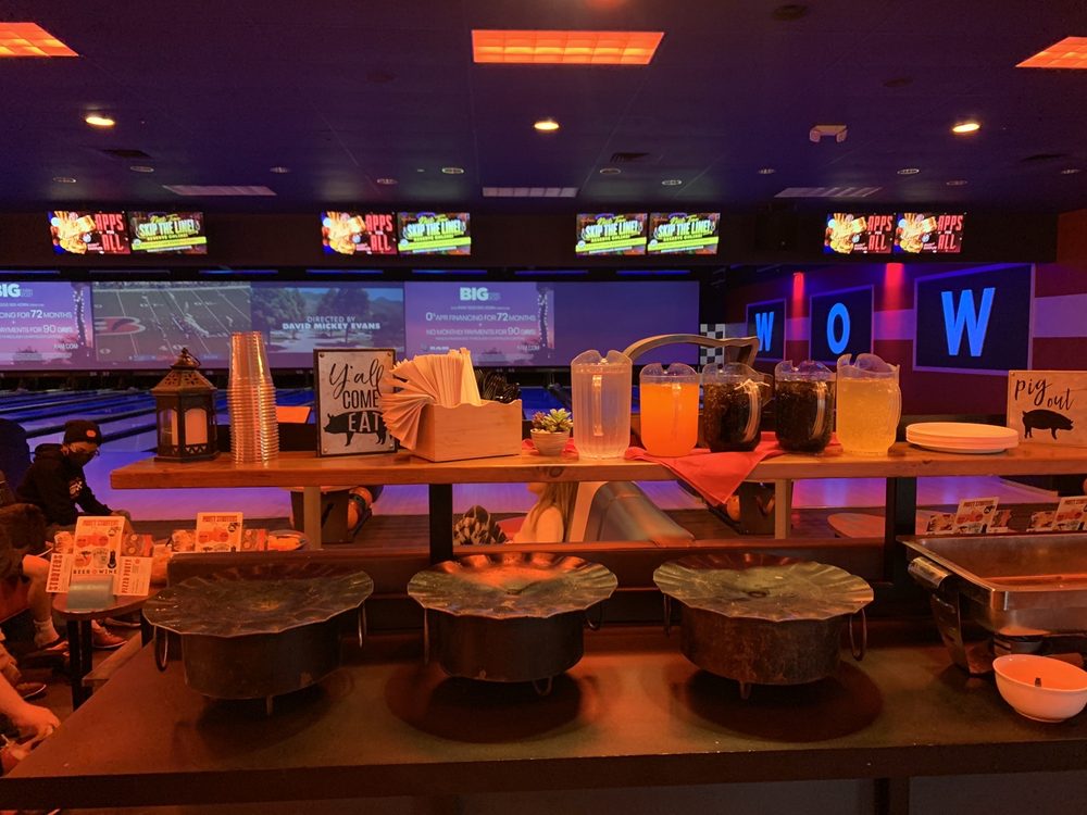 Excellent atmosphere. Big screens at the end of the lanes to watch the sports events while enjoying a game of bowling. Food is great. Great menu. Love the pizza and wings. Excellent arcade area. Good times all around.