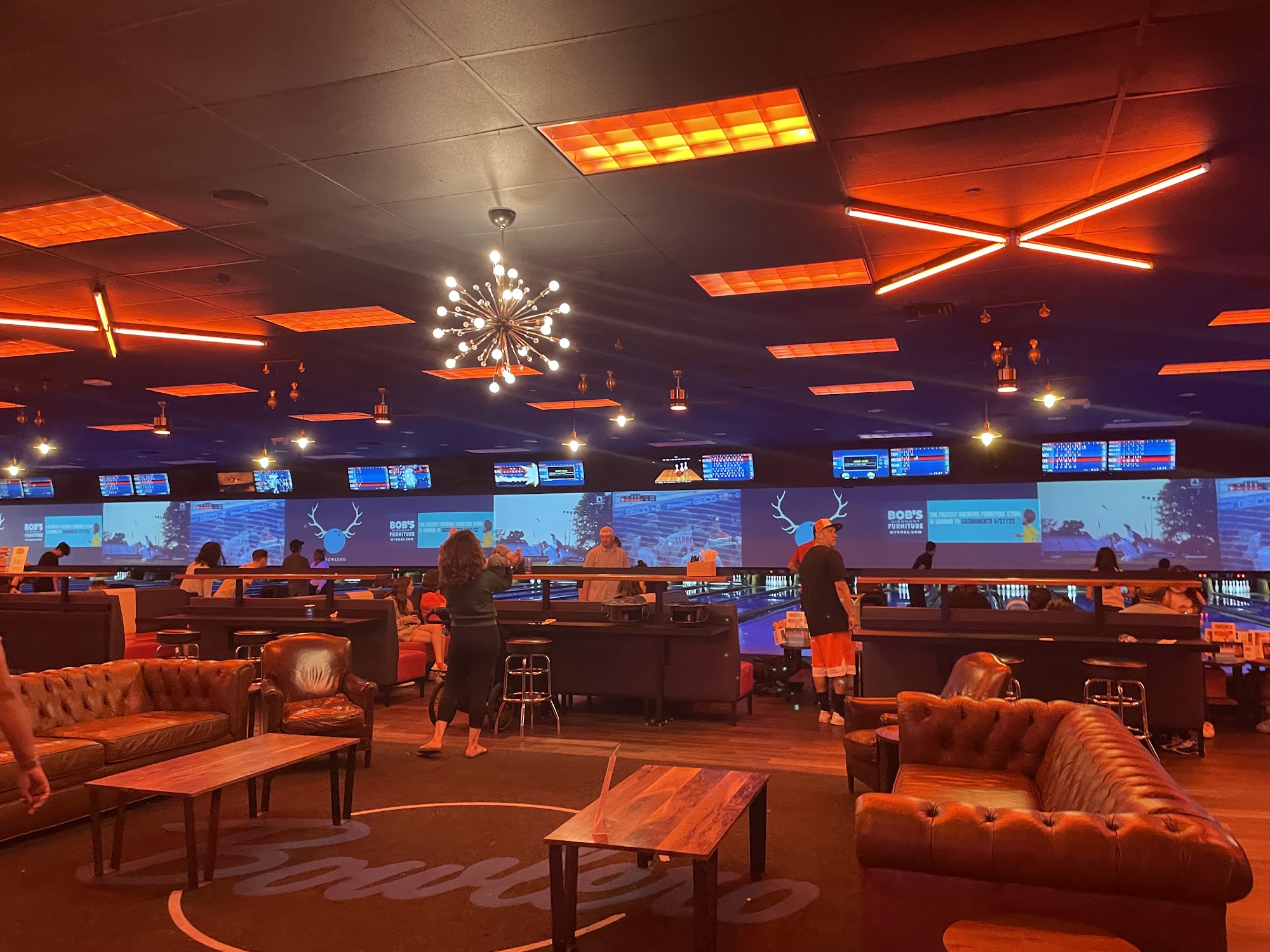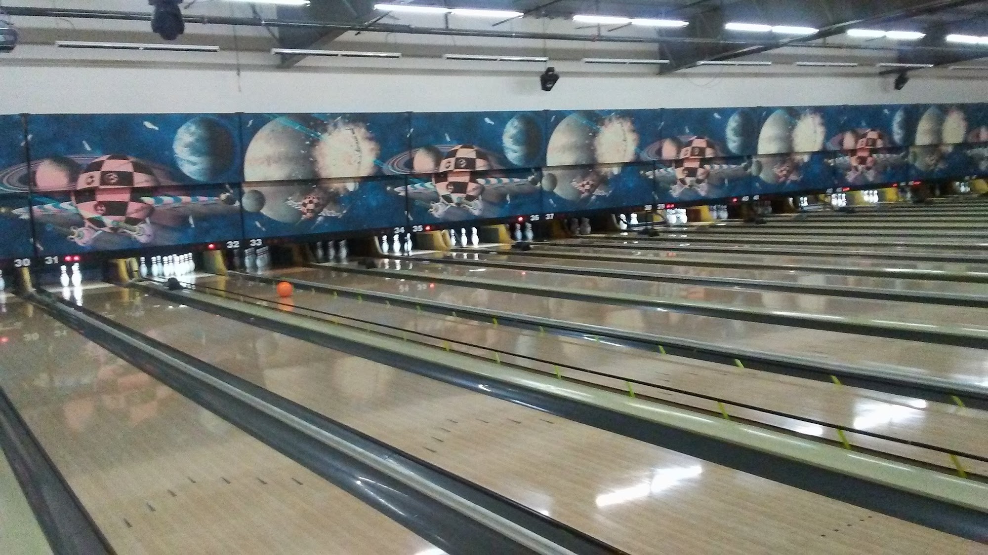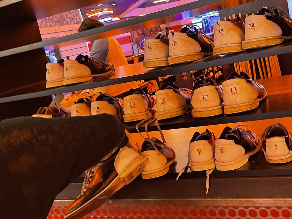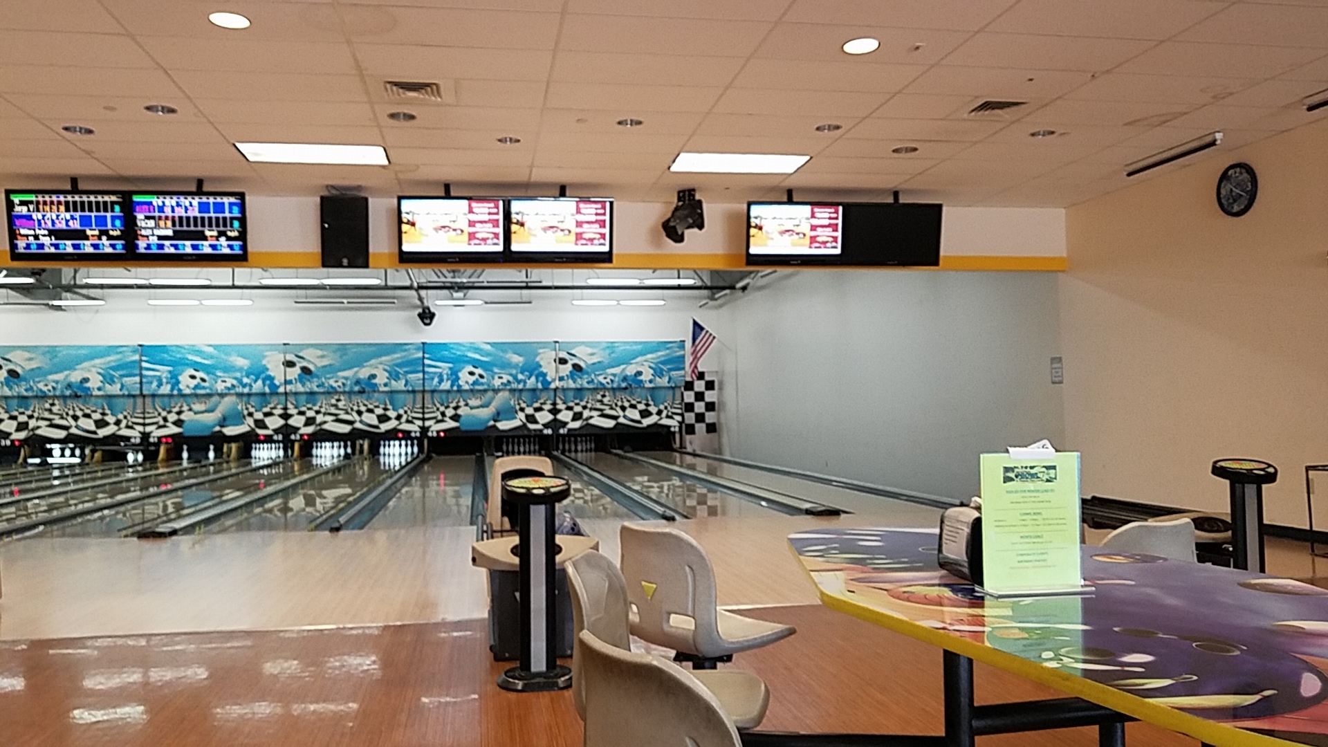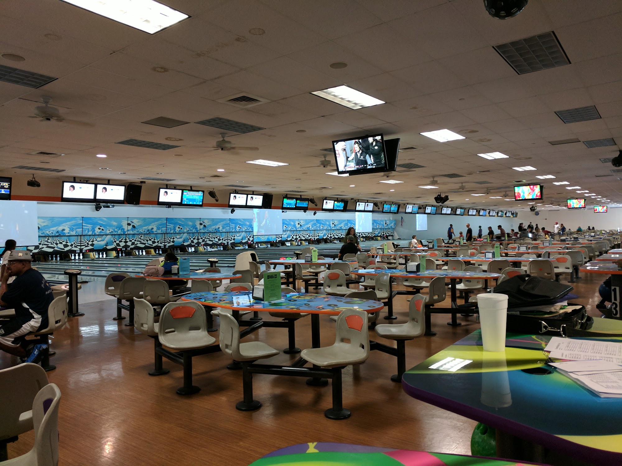 Excellent atmosphere. Big screens at the end of the lanes to watch the sports events while enjoying a game of bowling. Food is great. Great menu. Love the pizza and wings. Excellent arcade area. Good times all around.