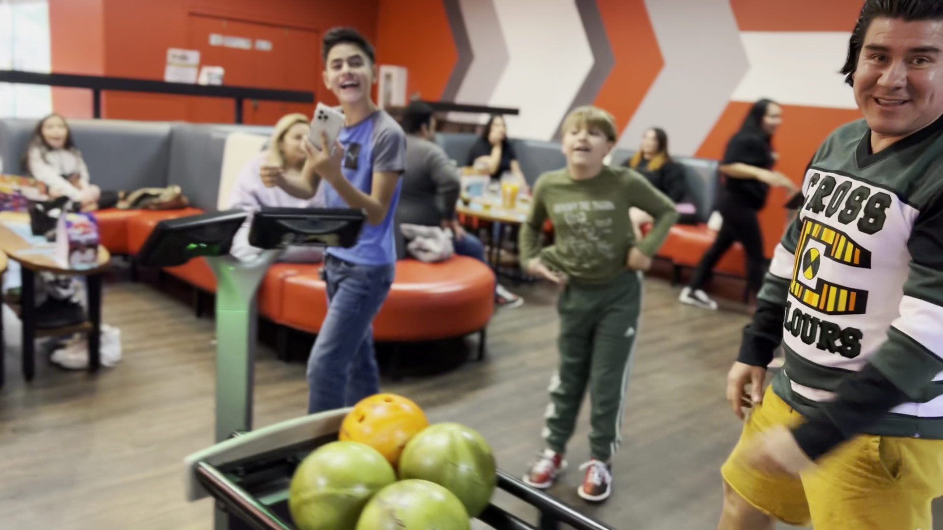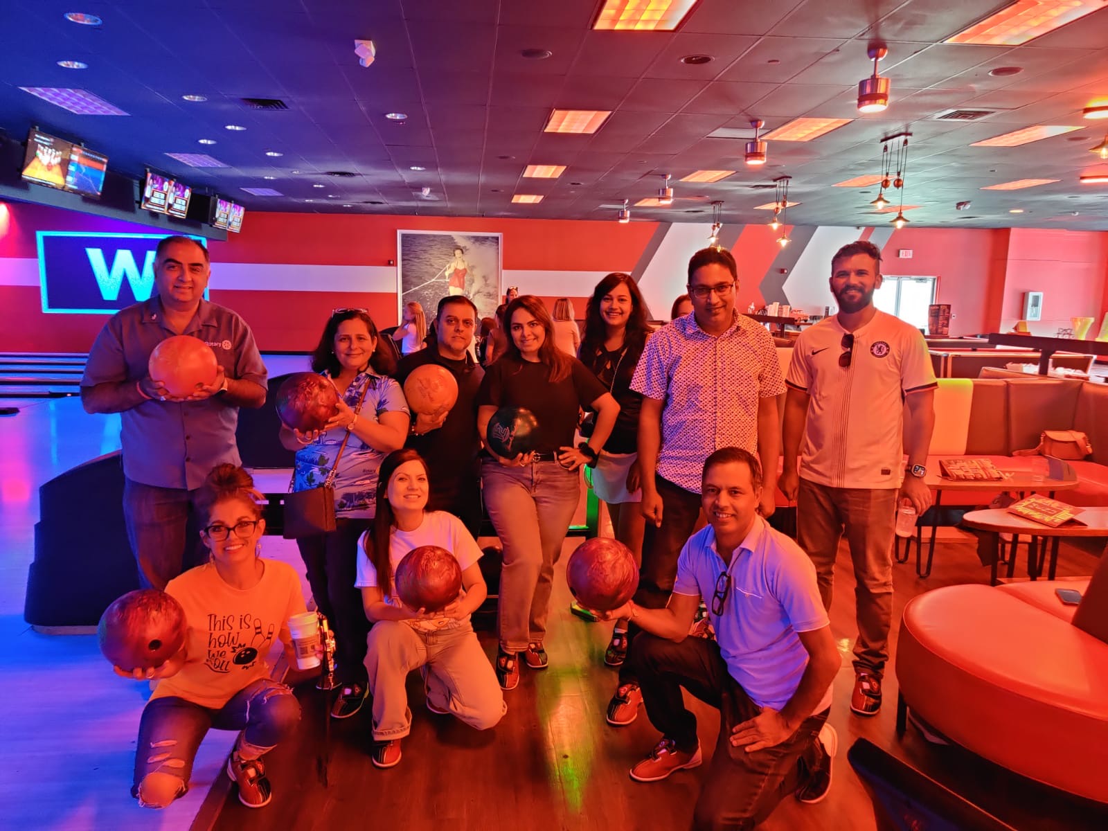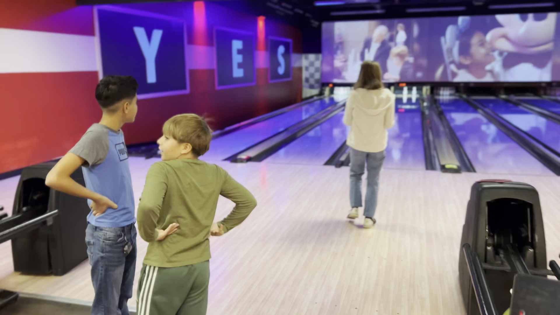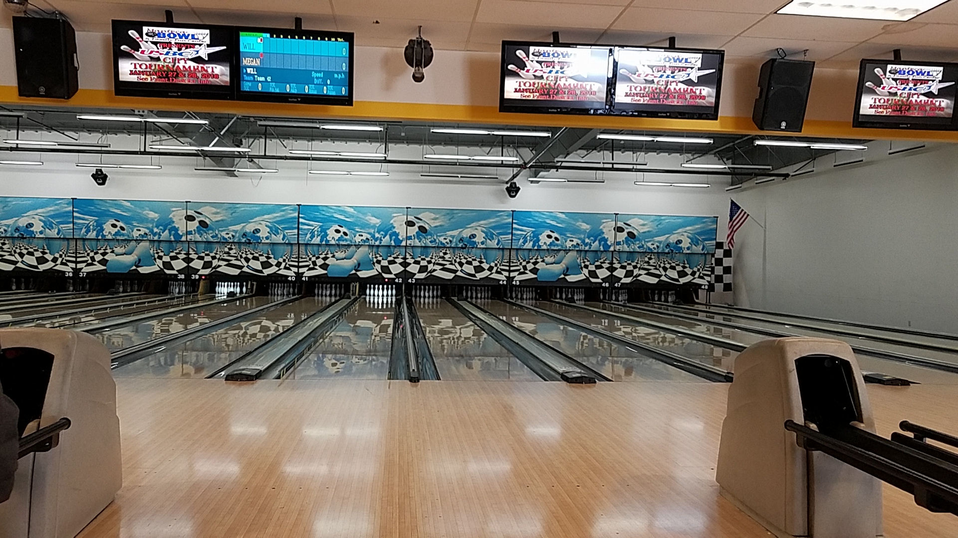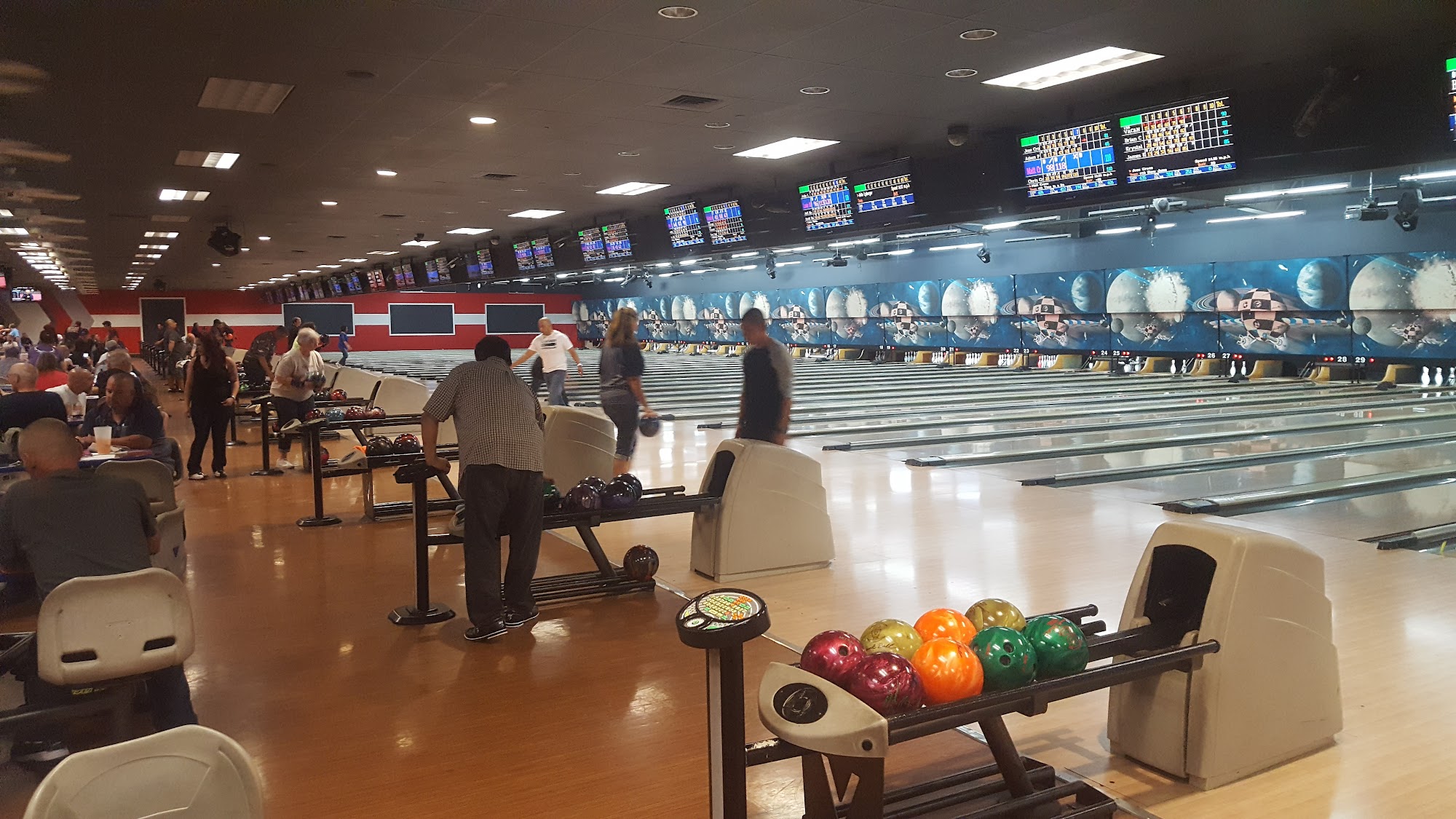 Excellent atmosphere. Big screens at the end of the lanes to watch the sports events while enjoying a game of bowling. Food is great. Great menu. Love the pizza and wings. Excellent arcade area. Good times all around.