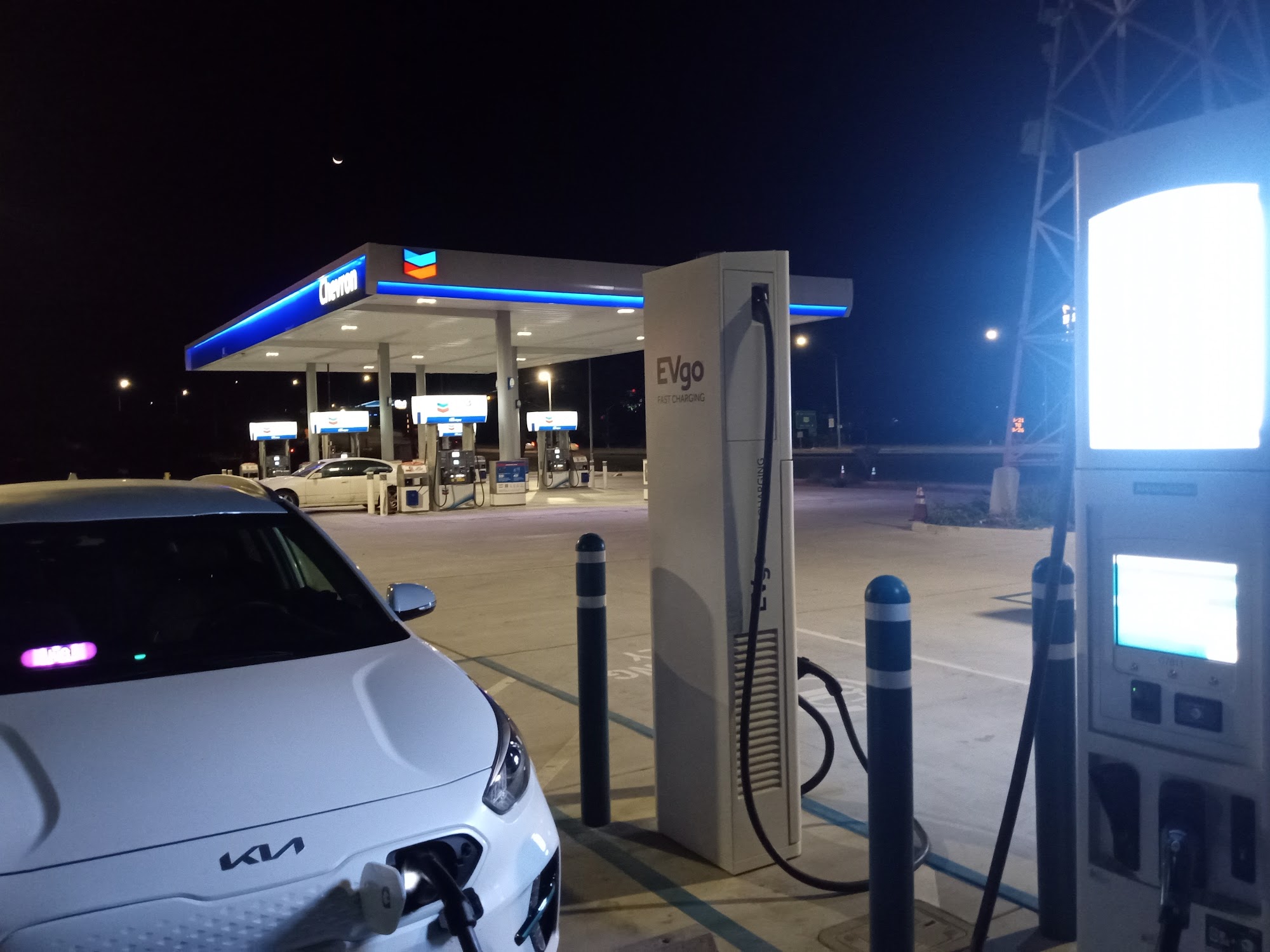 This is a charging station at a gas station, a rare spot offering trash cans, air, water, and food. It is very well lit and provides clean restroom facilities. Chargers are 80kW max, with speed varying by stall. There is a little street on the side to park and rest. Beware of the traffic light with cameras at the exit.
