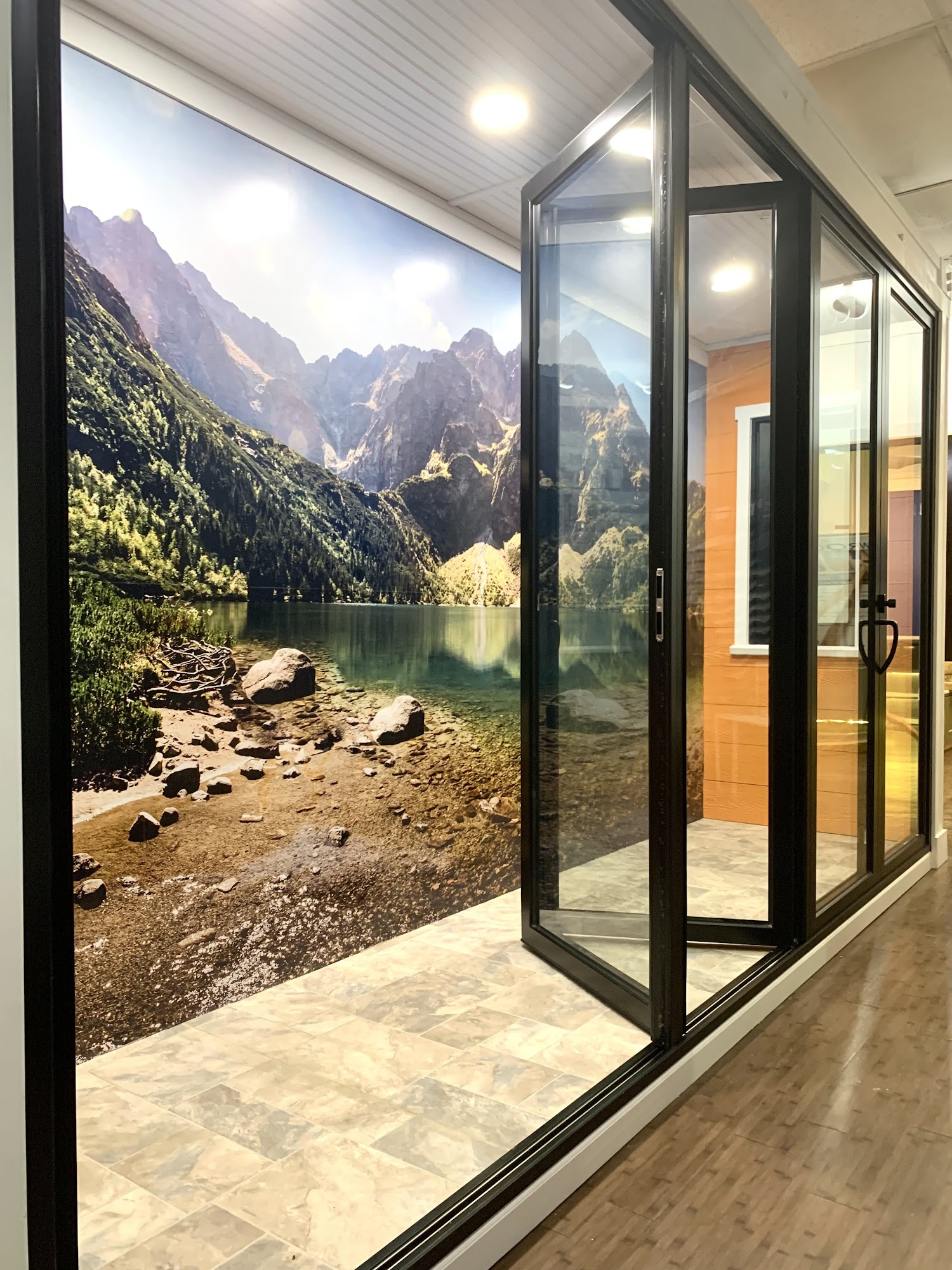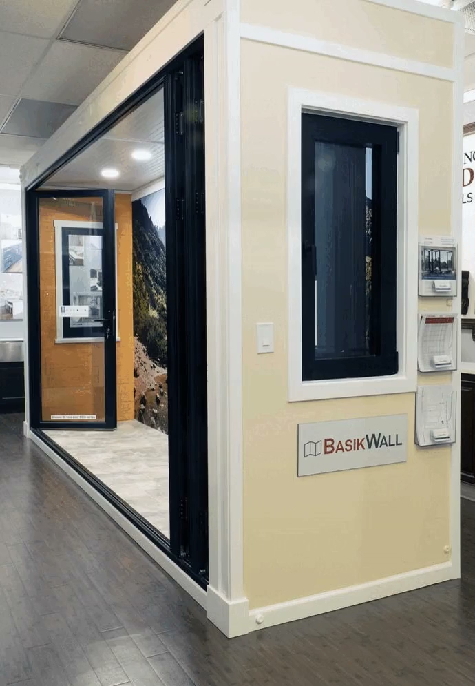 We installed high-quality and stylish BasikWall doors and windows in our cabinetry showroom. The bi-folding door (with 5 panes) looks very sleek and is a great product to open up the room to nature. The European-style tilt-and-turn windows give the rooms a refreshing look and added functionality.