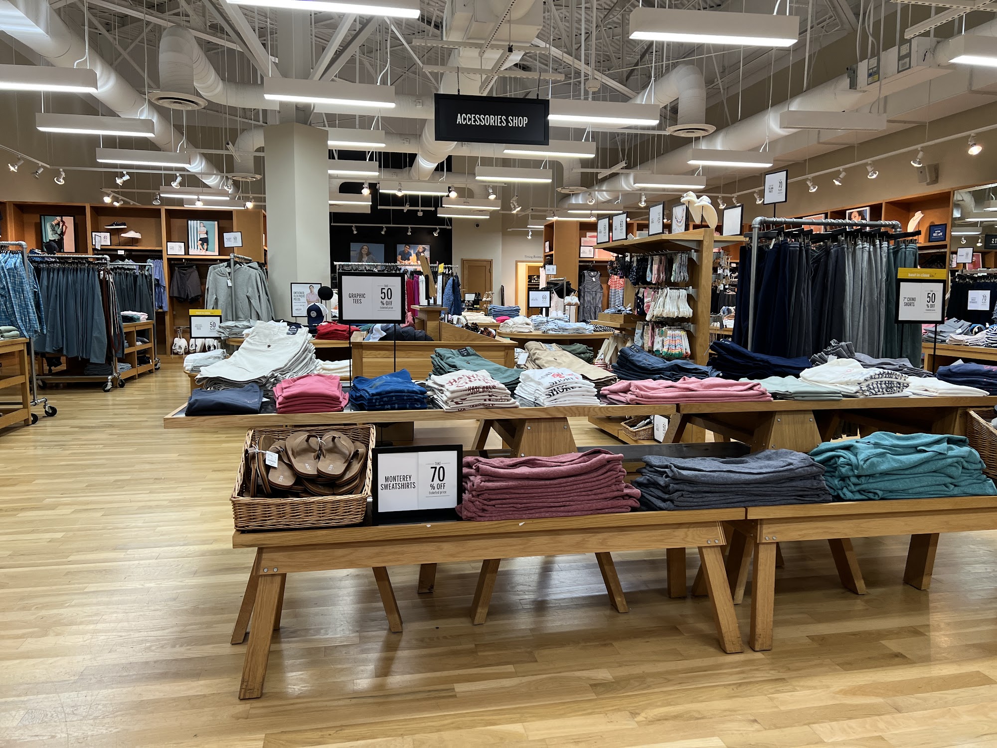 Great quality khakis. I bought a couple of sweaters that ended up pilling which is disappointing considering the price regardless that it's the factory store. Staff were friendly and knowledgeable about difference in regular and petite sizes.
