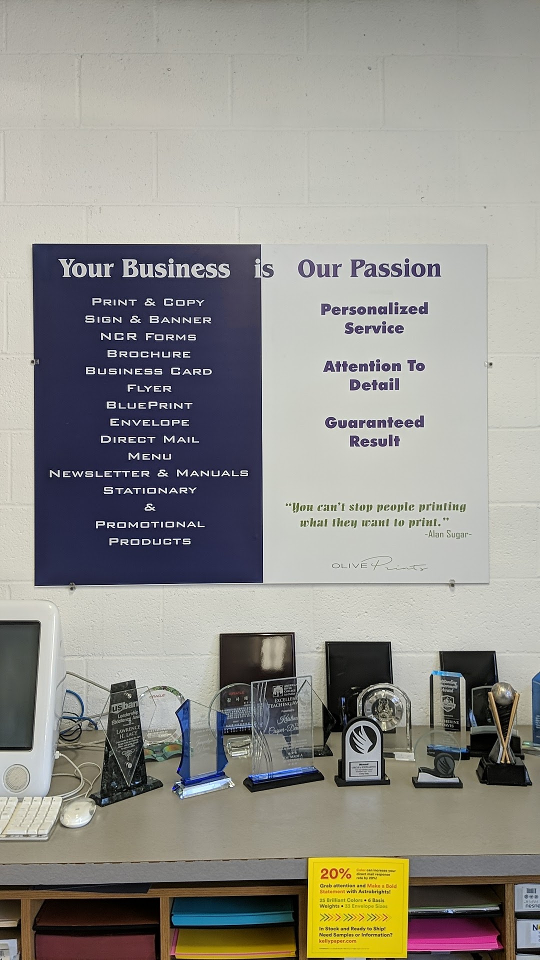 A quaint little print shop for all your printing and business needs. We can help with forms, brochures, flyers, signs, poster, blueprint, and more. If your business depends on it, depend on Olive Prints!