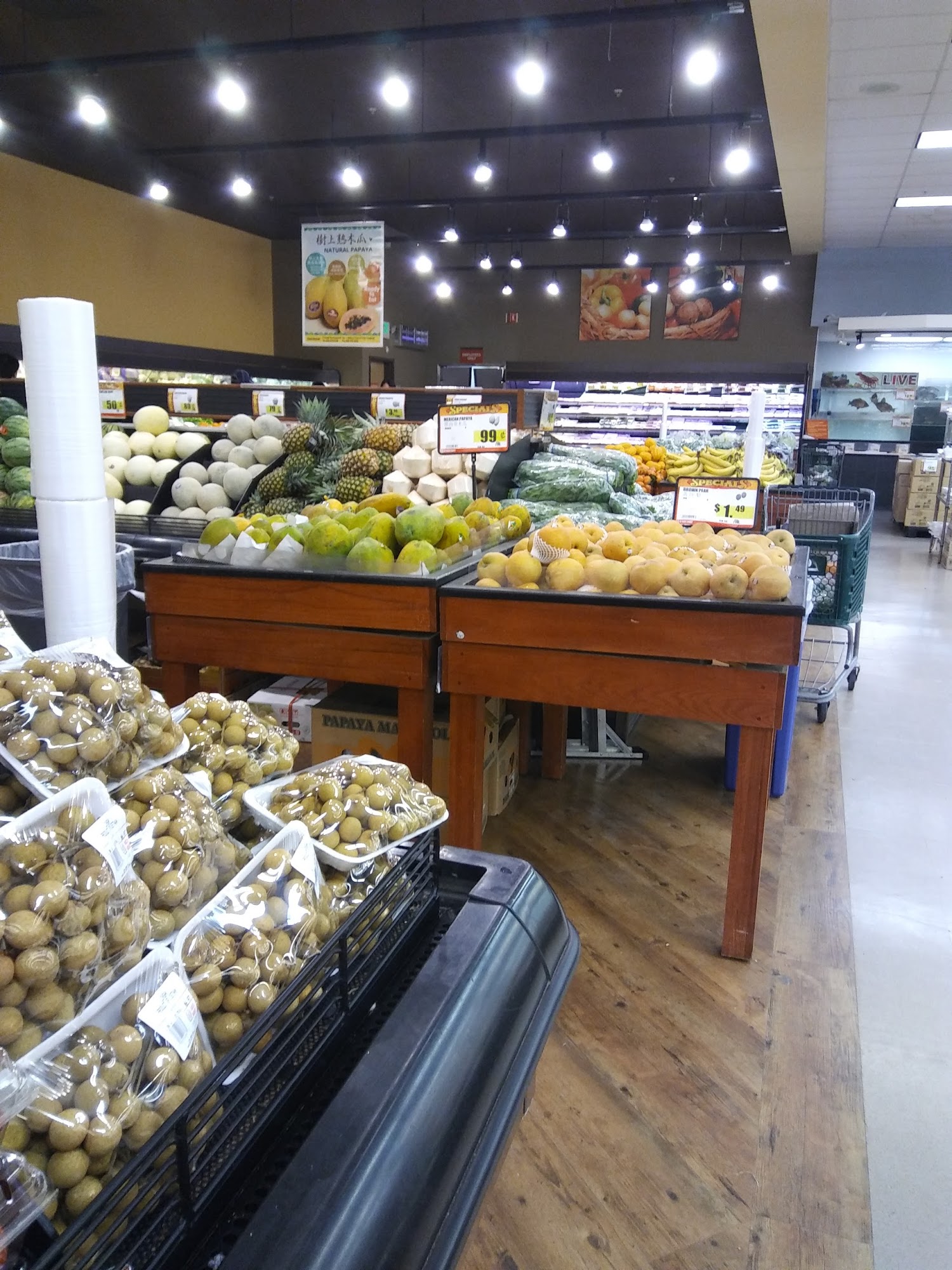 99 Ranch Market offers a great selection of Asian foods, including a wide variety of exotic fruits, vegetables, meats, and seafood. The store has fresh and high-quality produce, meat, and seafood, making it a popular choice for customers. While some of the staff may not speak fluent English, customers can communicate using gestures and pointing. The prices are generally good, and the store has a Taiwanese-style background music that adds to the authentic experience. The hot food section often features multiple vegetarian options, and the dim sum section is a highlight, with delicious veggie buns that sell out quickly. The store and parking can get crowded, especially on weekends.