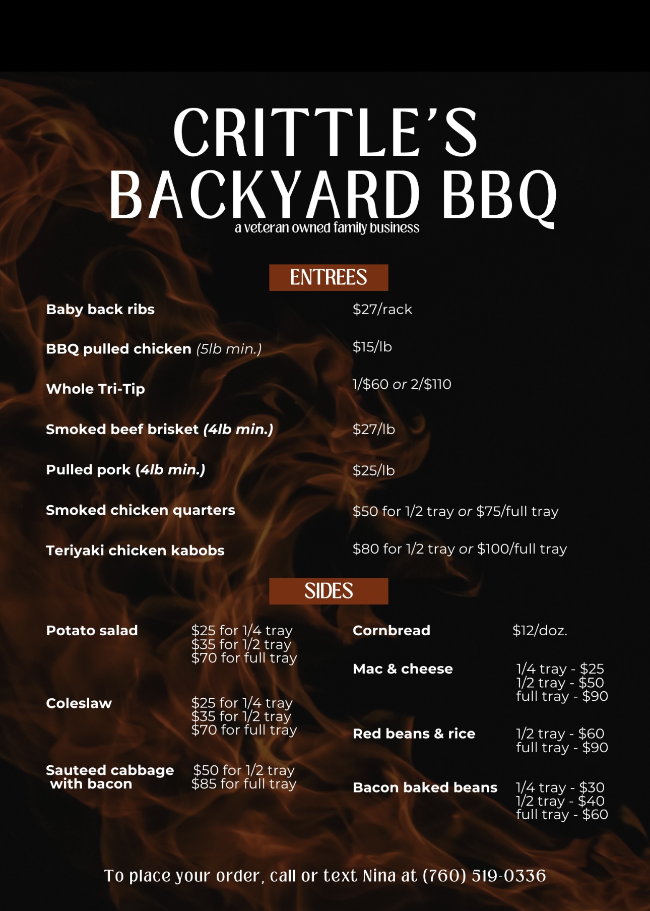 Crittle's Backyard BBQ serves the best small business food with amazing and top-notch barbecue. The smell sweeps you off your feet. Their robust flavors deliver every time with mouthwatering pulled pork, smoked brisket, barbecue chicken, and delicious chicken teriyaki kabobs. Sides include incredible mac and cheese, bacon baked beans, and corn muffins. They also have amazing baked goods and sweets. The food is steaming hot, ridiculously delicious, and the best ever tasted. The owners are very sweet, nice people, providing absolutely incredible service with perfect communication, making everything easy from ordering to pick-up. They are amazing to work with for catering and last-minute orders. Highly recommended for everyone.