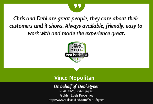 Chris and Debi helped us every step of the way in our journey to home ownership. Thanks to their hard work we'll be moving into our dream home! Thank you to Debi and Chris and the Golden Eagle team!