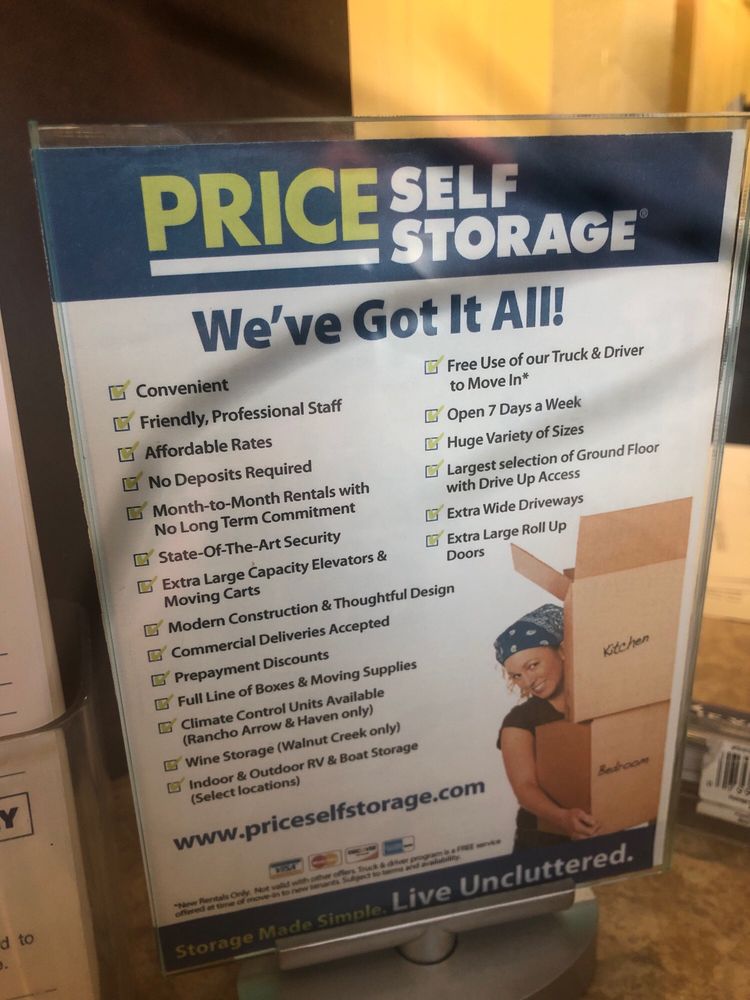 Price Self Storage in Norco features all drive-up units for ultimate easy access. We offer a large variety of unit sizes and RV, boat, and parking spaces with extra-wide driveways and turnarounds. This clean, well-lit facility features unit sizes from 5'x5' to 20'x30', with state-of-the-art security including personal computerized gate access and 24-hour recorded video surveillance. We offer month-to-month leases, competitive rates, and no deposit required. We provide courtesy carts to make your move easier, and our professional resident managers can assist you. We have personal and business storage solutions to fit any need or budget. Storage Made Simple. Live Uncluttered.