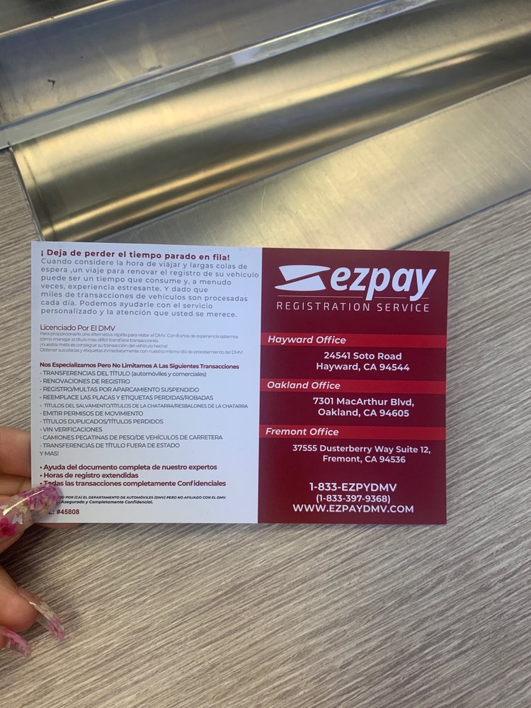 EZ Pay Registration Services is highly recommended for vehicle registration and title transfers. Customers appreciate their quick, efficient, and friendly service, often praising the staff for their professionalism and helpfulness. Many reviews highlight the convenience of visiting EZ Pay instead of long lines at the DMV, with some customers able to get their titles and registrations processed in just a few minutes. The staff, especially Alejandra and Ishmael, are noted for taking the time to explain fees and paperwork, making the process smooth and stress-free. The business also offers significant savings, with customers reporting lower costs than at the DMV. Customers frequently mention how EZ Pay resolves DMV issues quickly, sometimes in just one day, and how their support team is caring and considerate. Overall, EZ Pay stands out for excellent customer service, efficiency, and affordability, making it a trusted go-to for vehicle paperwork needs.