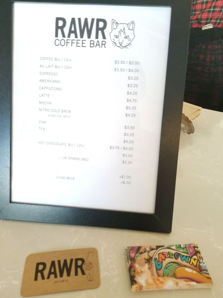RAWR is a charming cat-themed coffee shop connected to a cat shelter. It offers a simple menu with good tea, especially jasmine, and a variety of vegan snacks and treats. The shop also sells cat goodies, toys, and even raw cat food, supporting the care of the cats. Visitors can order drinks and enjoy them in the small sitting area with a view of "cat town," a cozy space where cats are well-respected and cared for. The staff is friendly, helpful, and creates a calm environment, making it a perfect place for both relaxing and spending time with the cats. Entry costs $12 per person, and the money helps take care of the cats, who are the main focus of the place. Many visitors find it difficult to leave without adopting a cat. Overall, RAWR is a beautiful place for cat lovers to enjoy good drinks, treats, and the company of adorable cats.