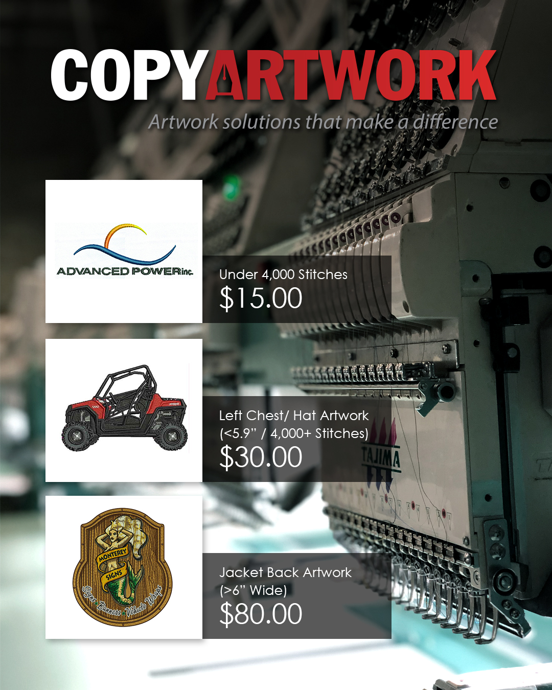 Welcome to Copyartwork.com! We are an American based company that offers artwork, vectorizing and digitizing services. We can take whatever artwork you may have available and recreate it in a clean, vectorized format so it is ready for a wide variety of printing purposes.