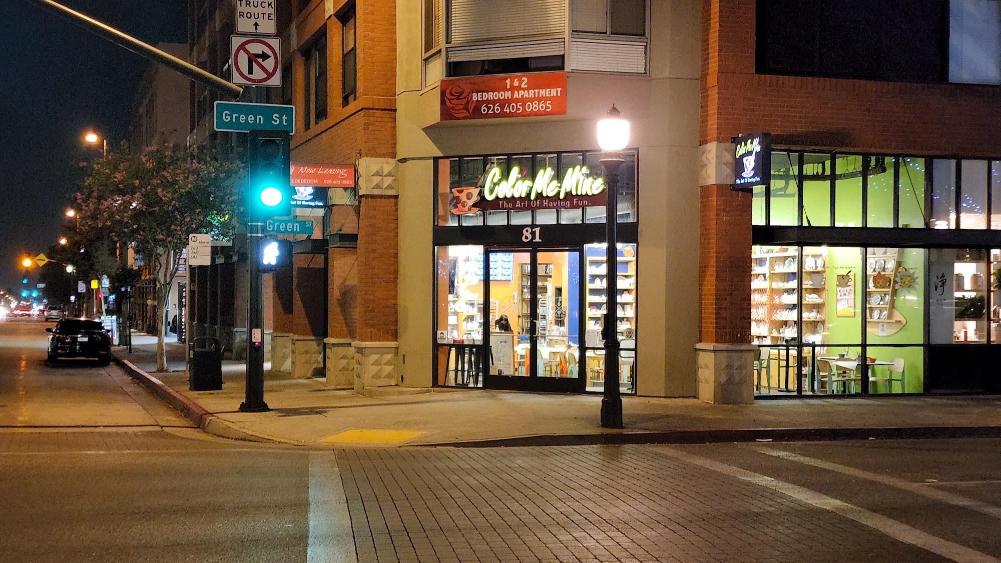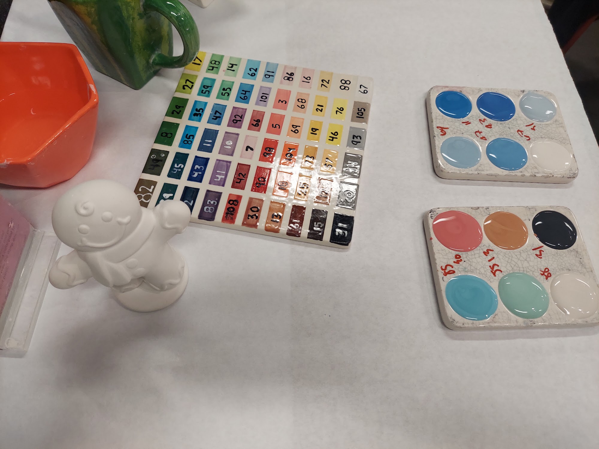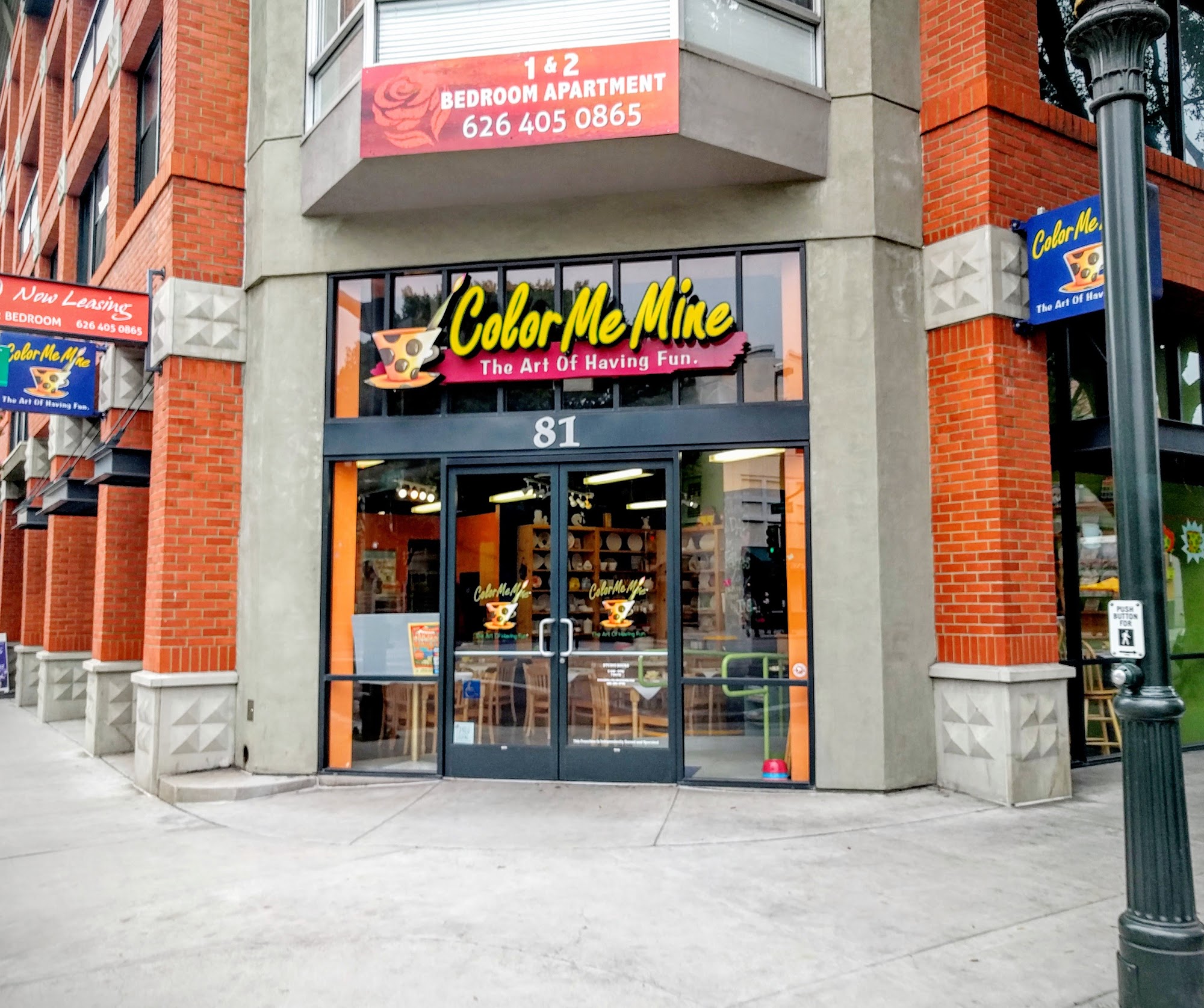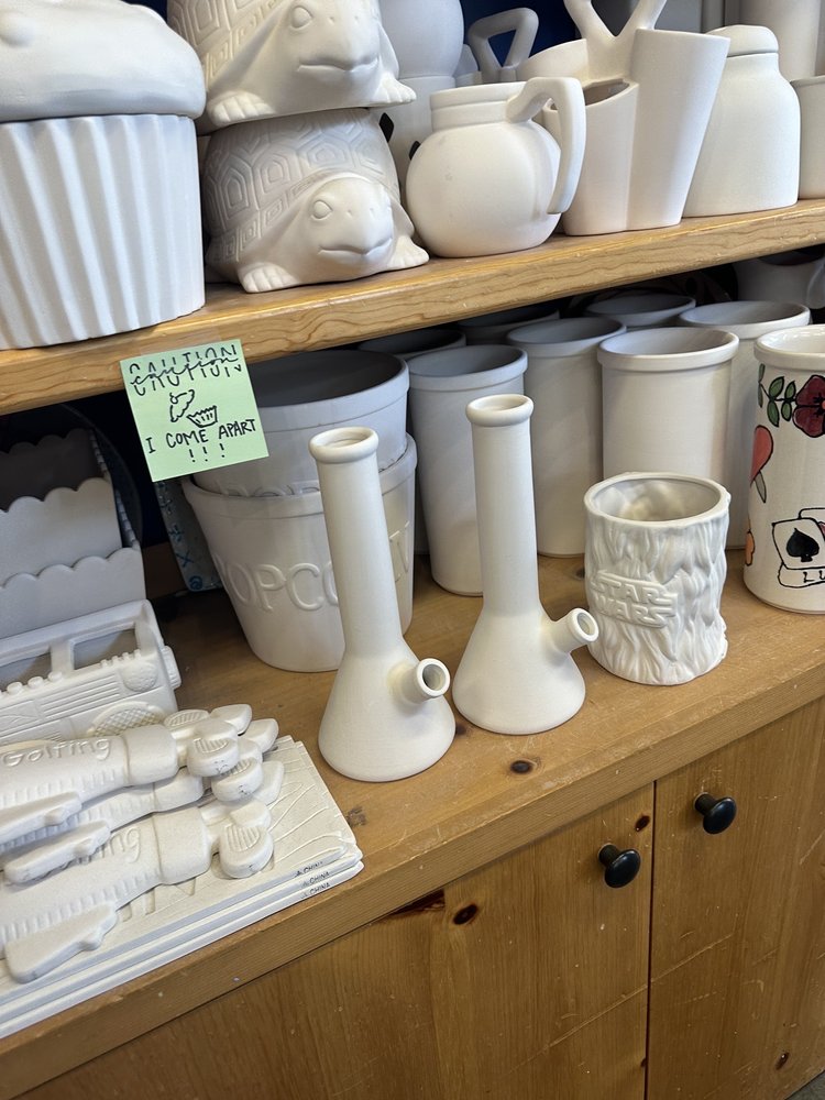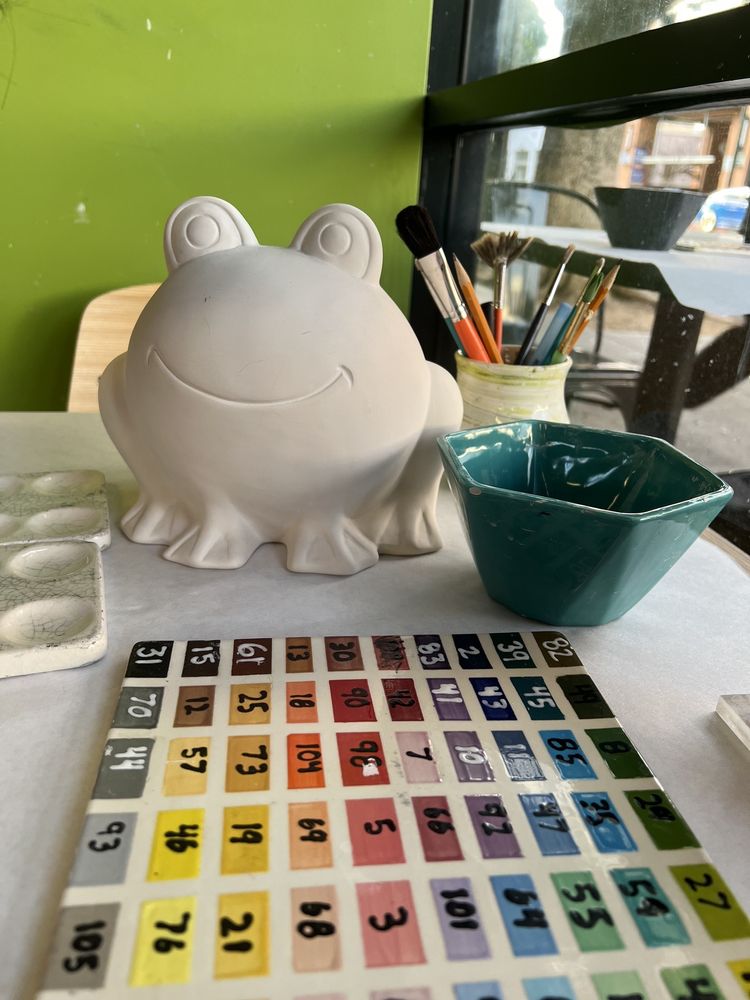 My favorite color me mine location. Park in parking lot catty corner, or pay a $10 for closer parking. Or metered parking nearby. You can have curbside pick up when your creation is ready!