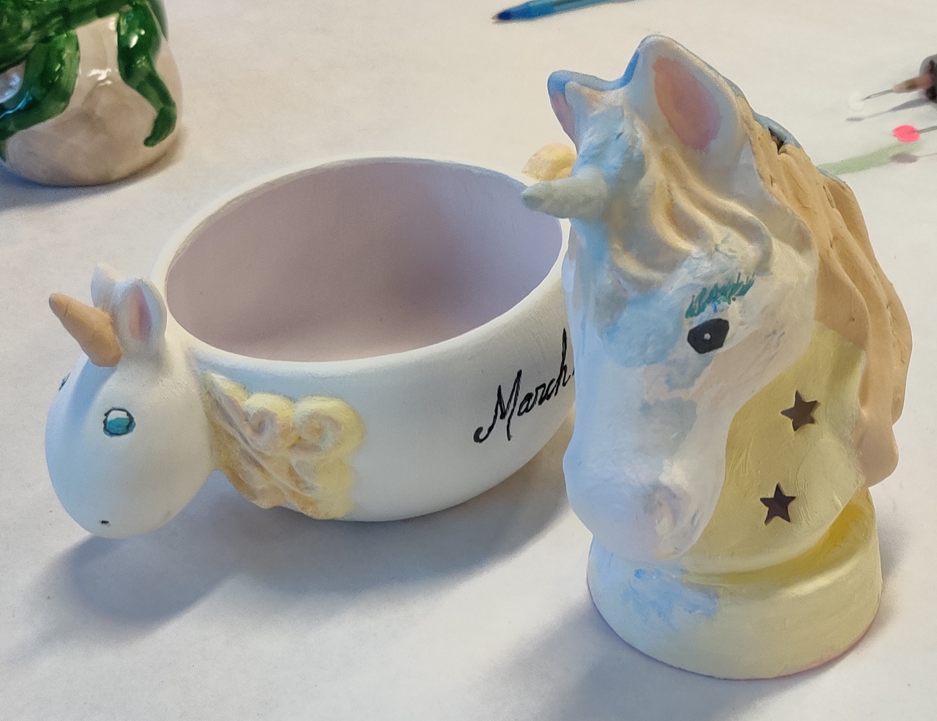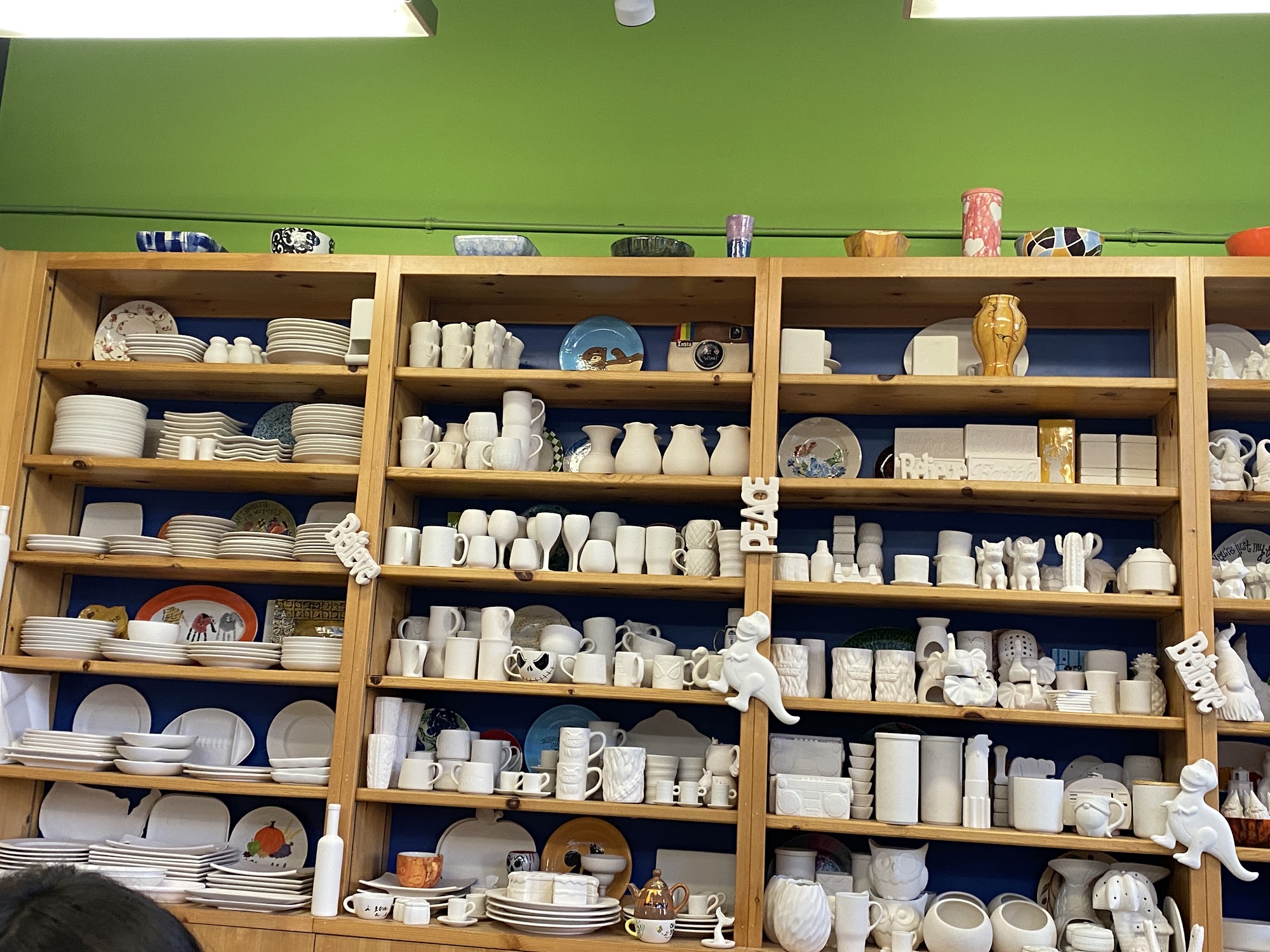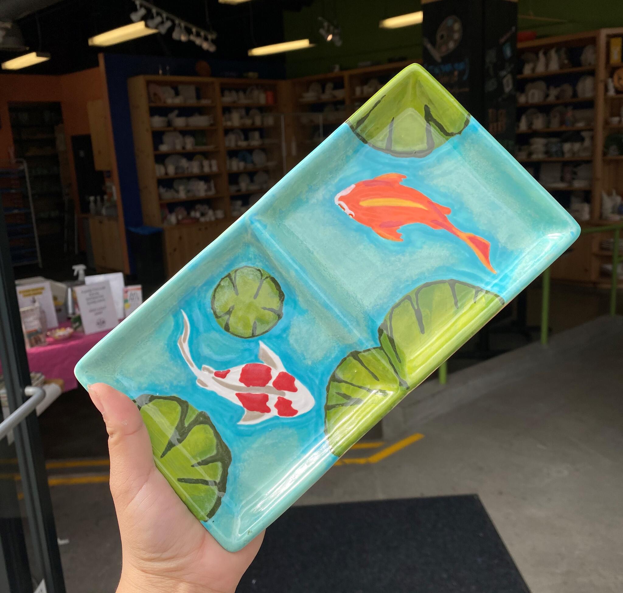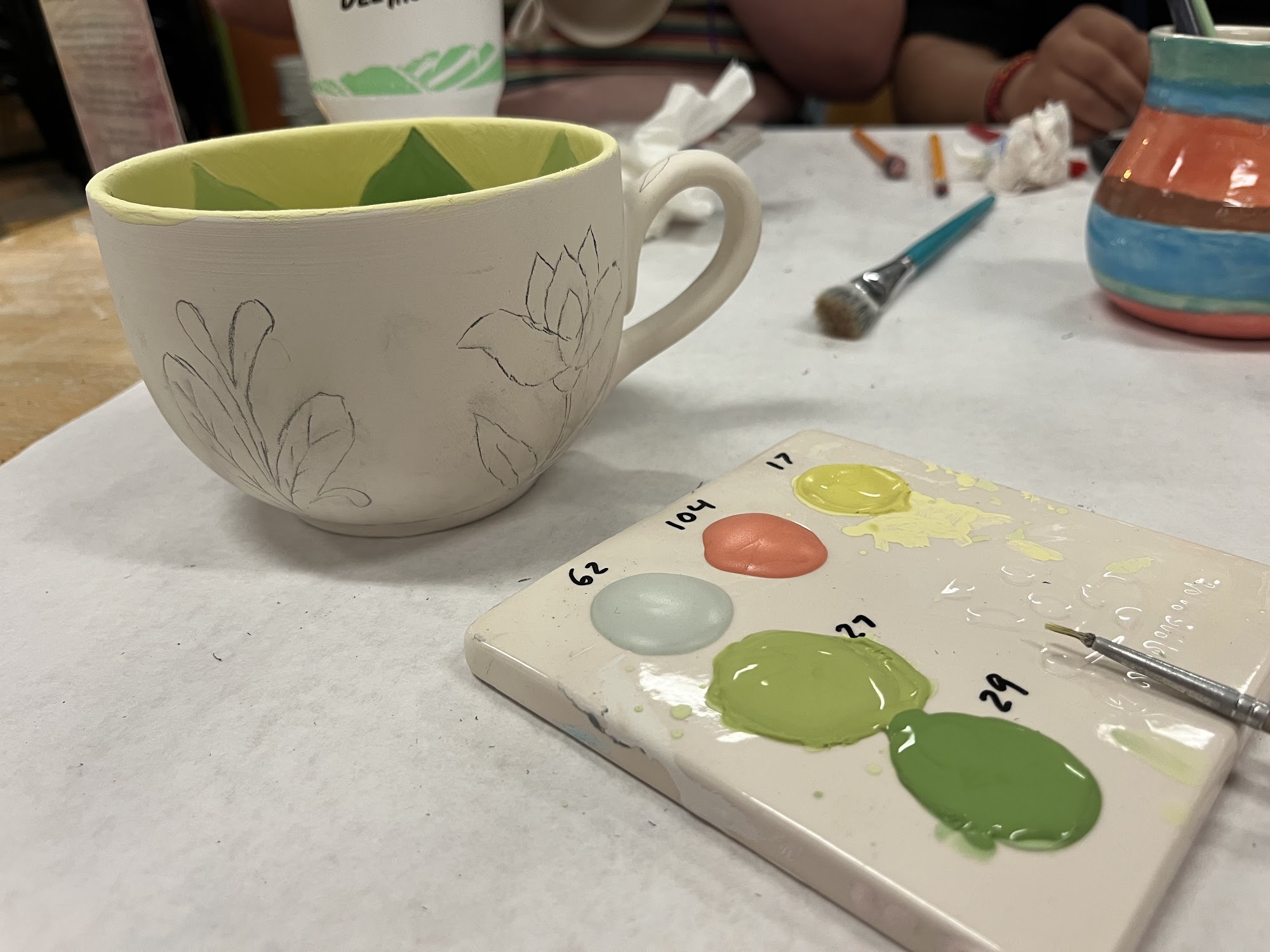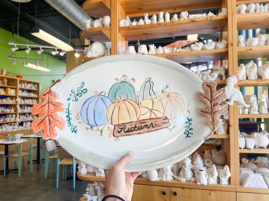 My favorite color me mine location. Park in parking lot catty corner, or pay a $10 for closer parking. Or metered parking nearby. You can have curbside pick up when your creation is ready!