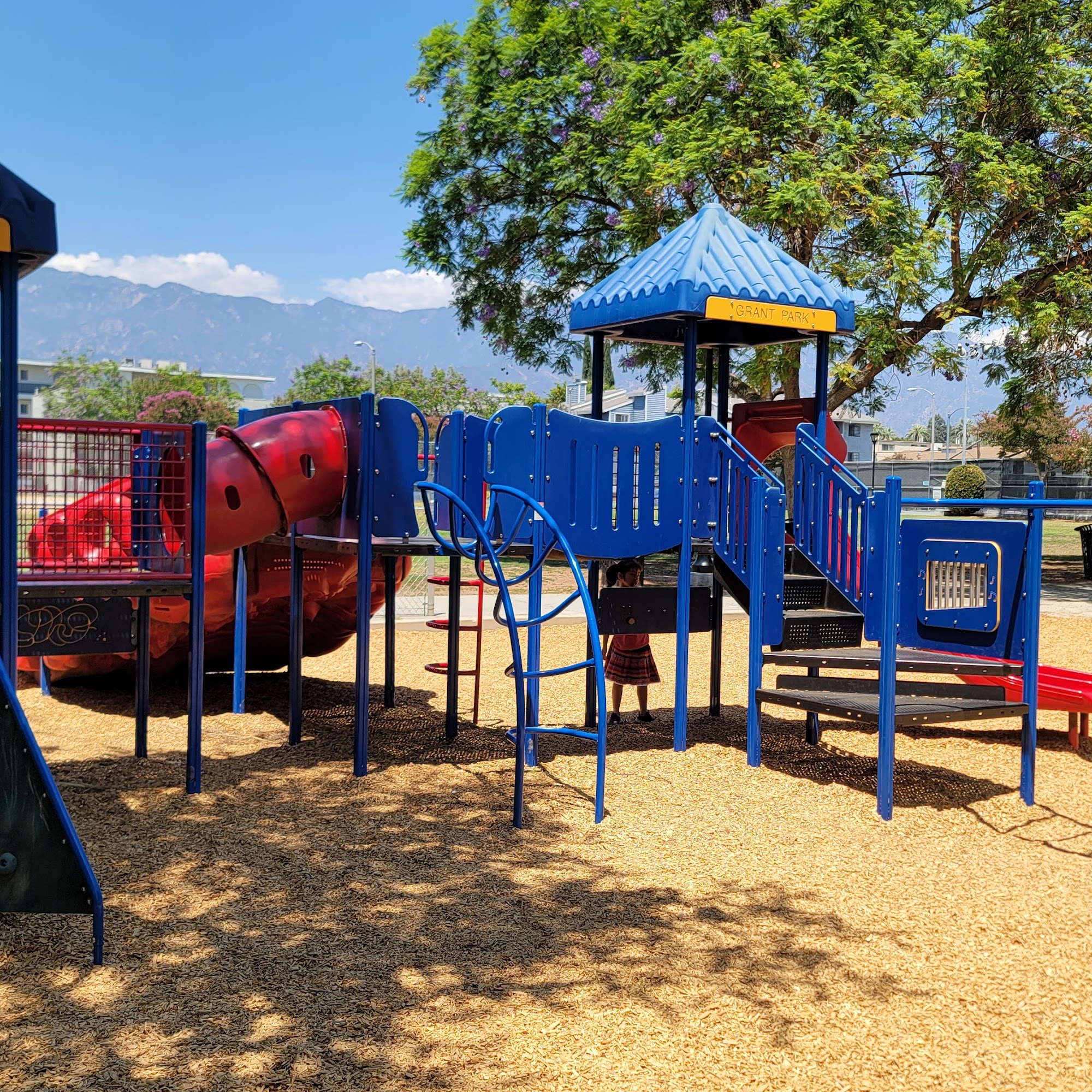 Grant Park is a lovely and extremely well-maintained neighborhood park. It offers a great jungle gym and large playground for kids, as well as baseball and softball fields, basketball courts, and tennis courts. The park provides nice big green spaces, picnic tables, and shaded areas. It is dog-friendly, with green grass areas, a dog-friendly water fountain, and poop bag dispensers. The super clean bathrooms are fully stocked and have baby changing tables. There is also a refillable water station. Conveniently, Ginger Corner Market is right across the street. The park features a beautiful view of the mountains and offers two-hour street parking.