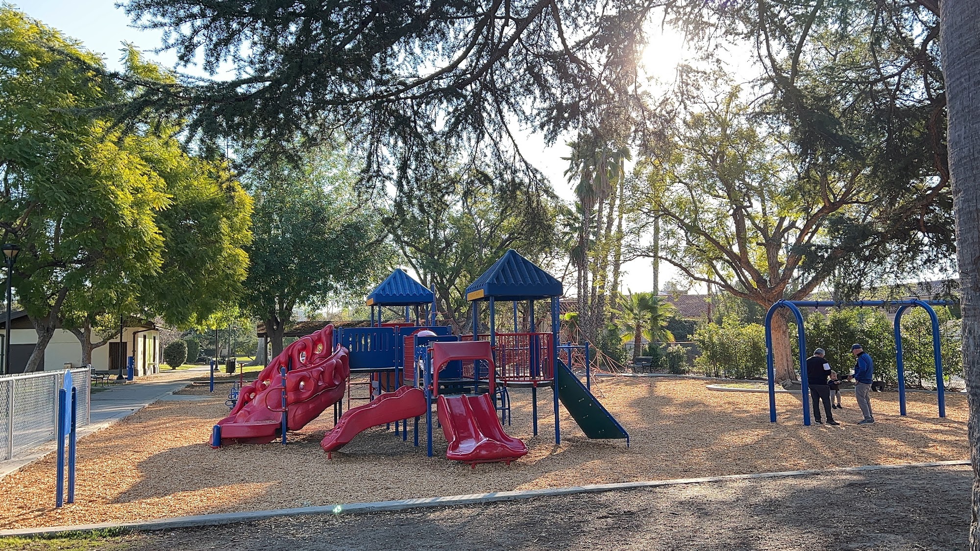 It have a play ground for children basketball and tennis courts and restrooms picnic area dog friendly