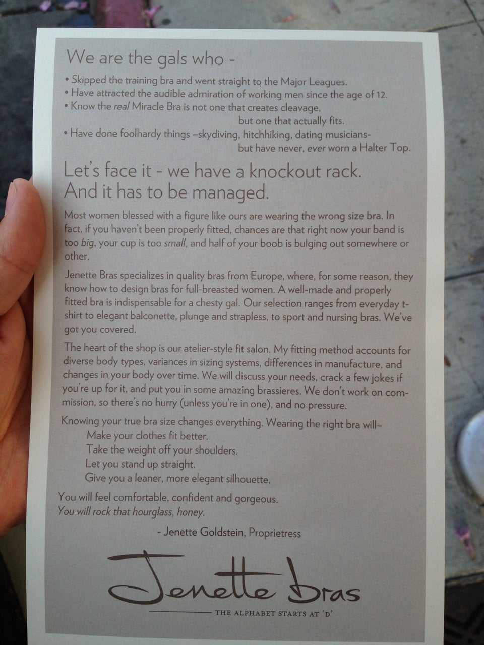 Amazing experience. The only store that I have ever been to, that caters to women with bigger breasts and has multiple choices in my size (I can never find anything at department stores). The girls who work at the store are so nice and helpful!Jenette Bras! Great work!