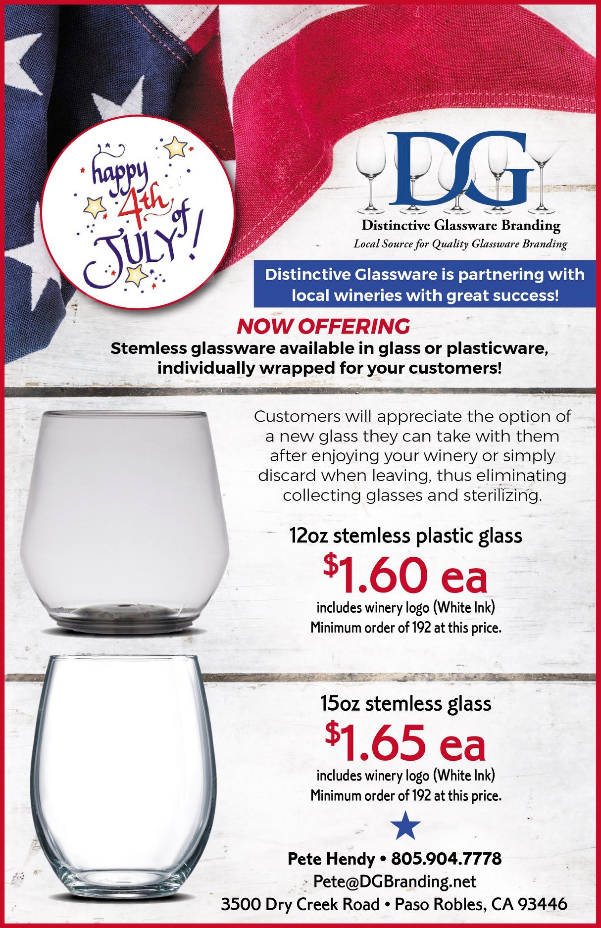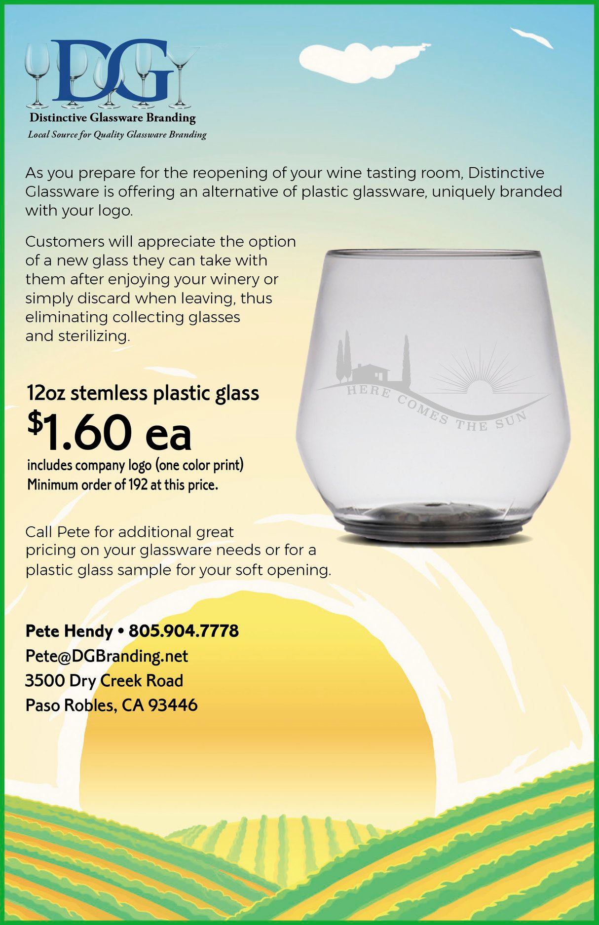 Distinctive Glassware have met all our needs with exemplary service. They are very knowledgeable and are easy to work with. This company will definitely be who I continue to call when I need to order glassware with our company logo. Paula O. Paso Robles Inn & Steakhouse