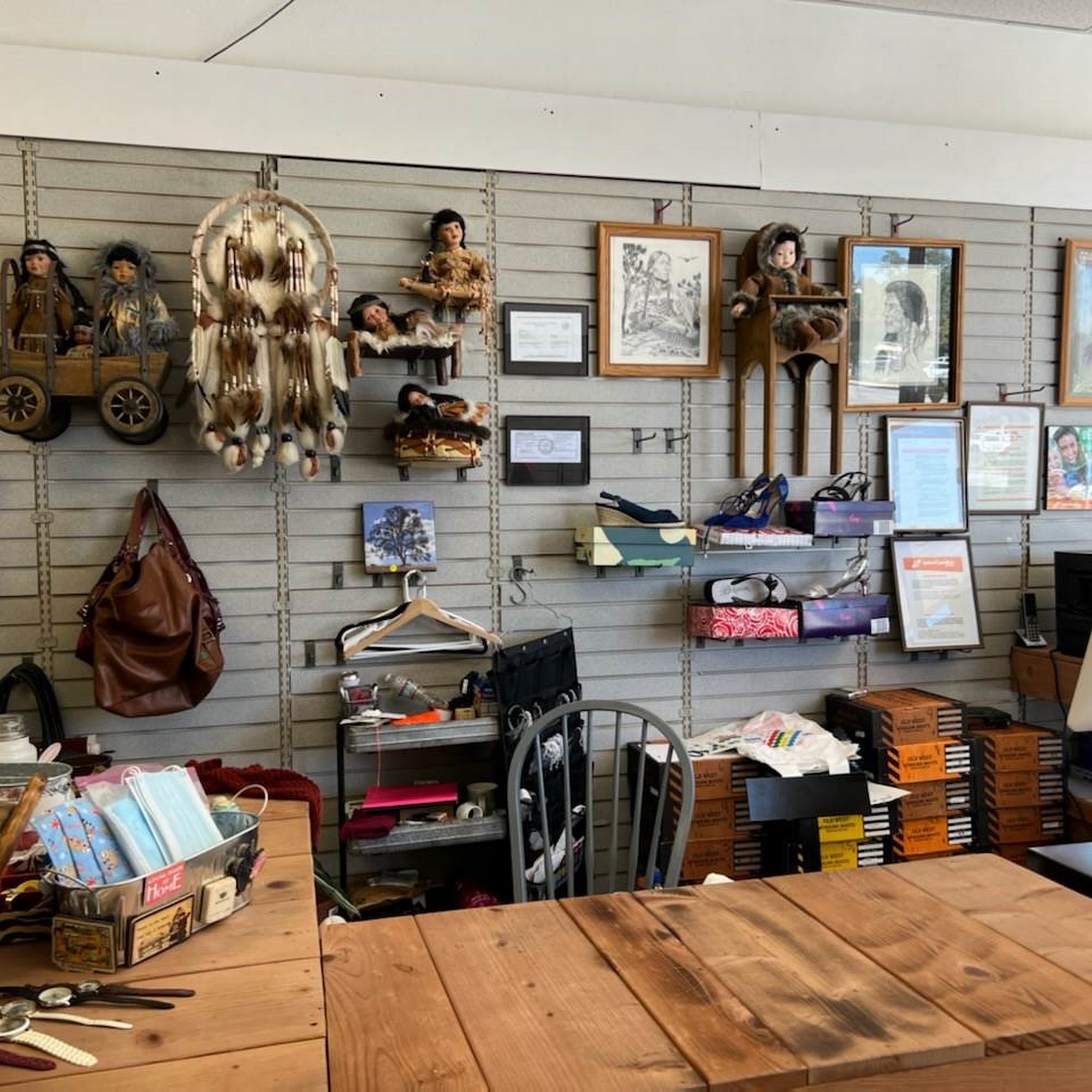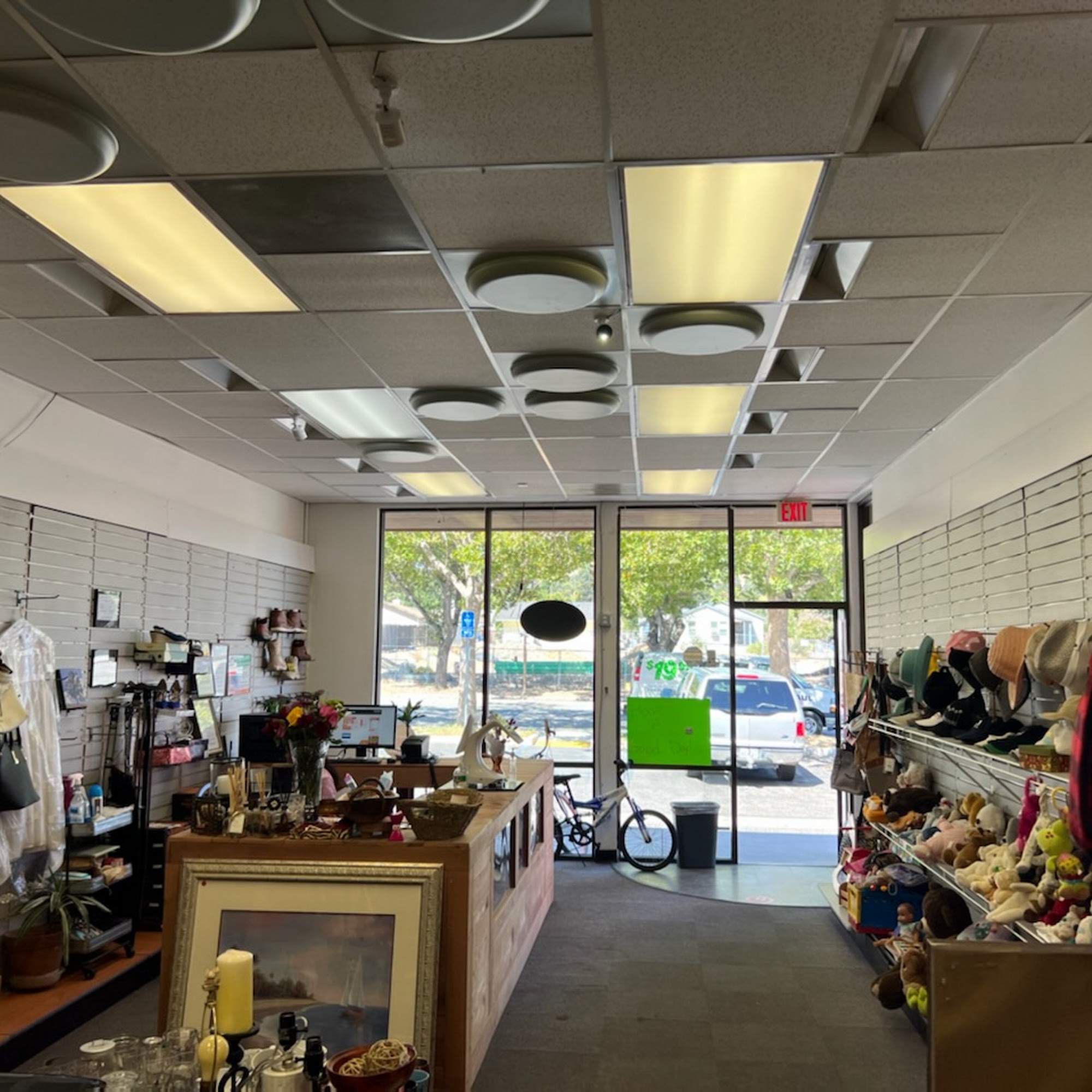 Nice selection of men and women’s clothing: men’s clothes, jeans, jackets, large assortment of ties, shoes, athletic wear, all low priced items. Various household items, books, many puzzles, and some furniture. Organized and clean! Large assortment of lamps.