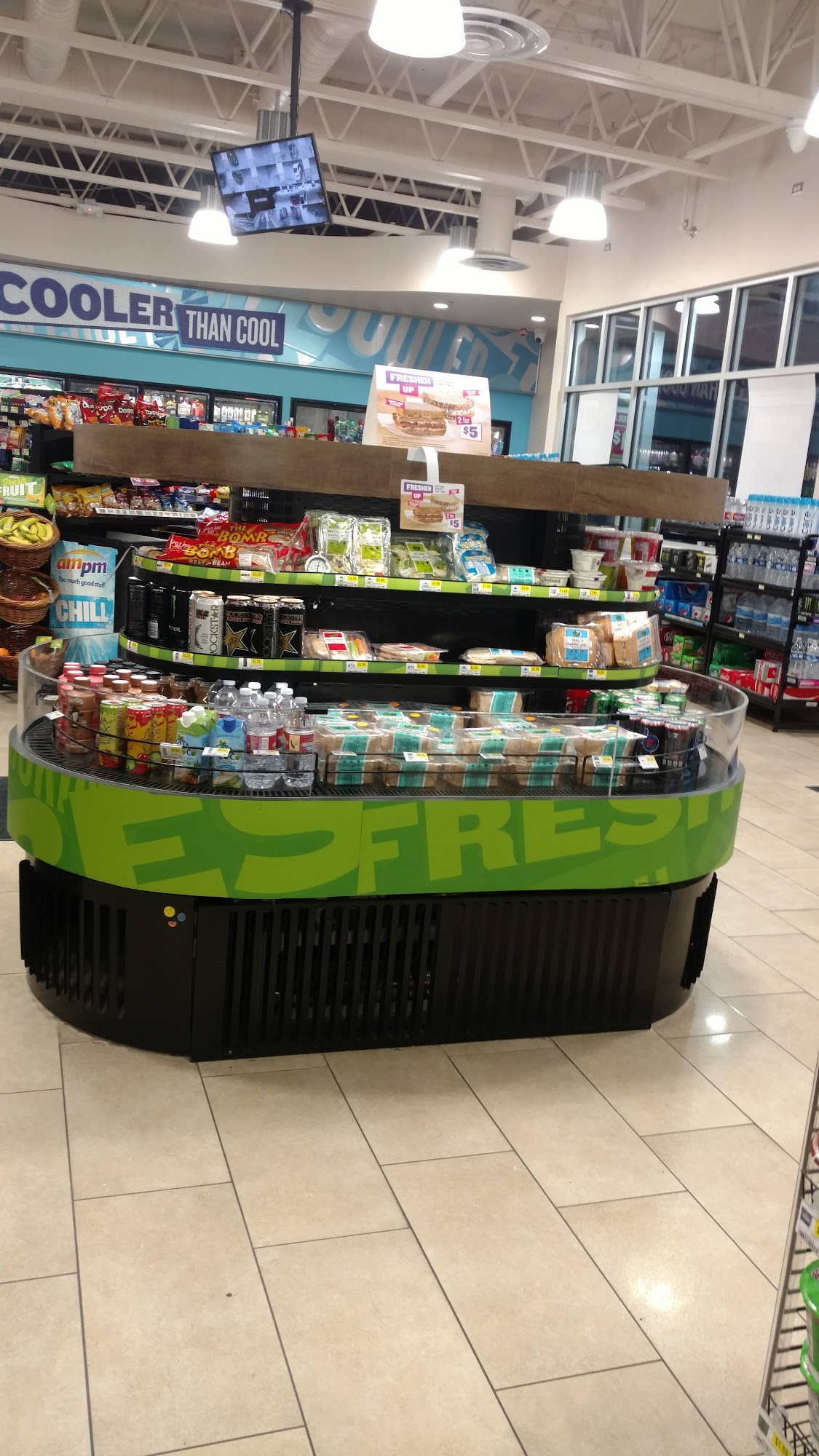 AMPM is a 24-hour corner store and gas station, known as the home of Too Much Good Stuff. It serves a spectacular variety of snacks and drinks around the clock, with quality ingredients and bold flavors. It is a go-to stop for convenient, tasty food at an exceptional value, including recommended items like the Sausage Egg & Cheese Croissant. The store is decently sized for drink and snack needs, with a large lot for gas pumps. The staff is understanding and welcoming like family. While the single entrance can be inconvenient, access to the main roads is easy. Payment is quick with tap pay available.