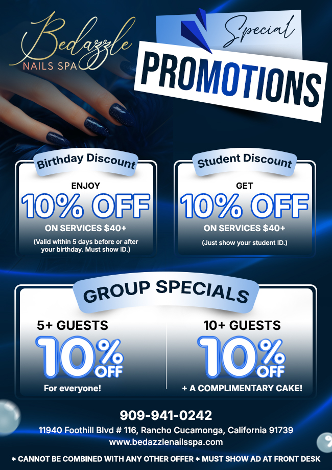 Bedazzle Nails Spa in Rancho Cucamonga, California, offers a unique beauty and wellness experience with a focus on natural organic services and result-driven treatments. The salon features a modern, luxurious atmosphere that prioritizes safety and comfort. Customers appreciate the skilled nail technicians, and many have expressed satisfaction with their services. One long-time client praised the consistency of their pedicures, always leaving happy with their toes, while another mentioned the friendly environment, highlighting the kind staff, especially Mimi at the front desk and Tonya. However, there have been mixed experiences regarding nail services. One reviewer noted that their nails were filed too thin, leading to sensitivity and breakage shortly after the appointment, which was seen as a waste of money. In contrast, another customer highly recommended Lani for her attention to detail, stating that her nails always look fantastic, even causing friends to compete for her services. While some customers experienced issues during the payment process, preferring cash or ATM use, Bedazzle Nails Spa remains recognized for its talented staff and welcoming environment, making it a popular choice for nail care despite minor inconveniences.