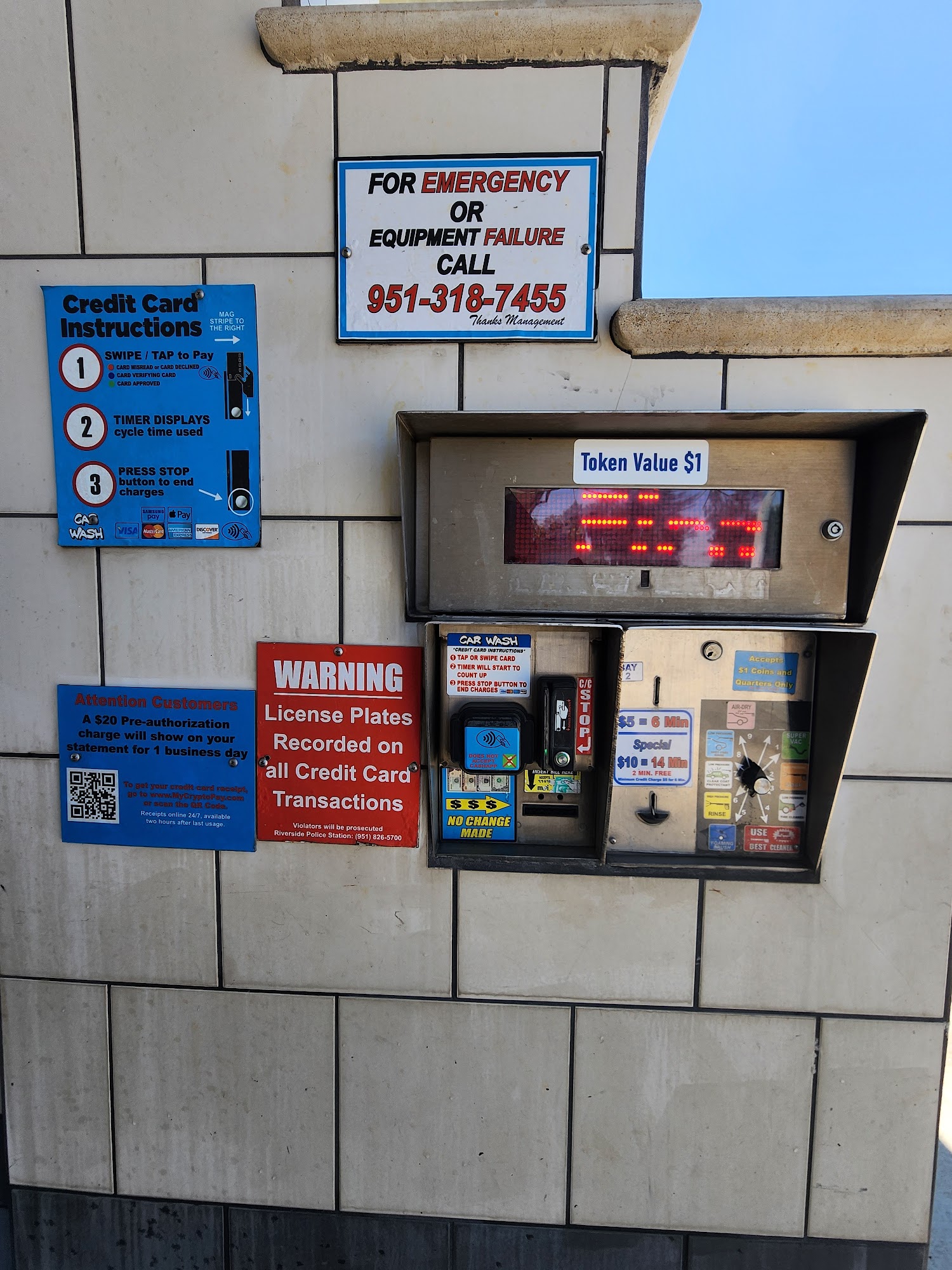 1$ Dollar Car Wash is the best car wash deal in town and an easy to use facility with all the amenities. It is a great place to wash your car, with a really spacious area to fit multiple vehicles, including oversized commercial vehicles in two dedicated bays. The price depends on how much time is spent using the equipment, typically between $15-$20 per wash. All machines accept debit and credit cards, coins, or tap to pay from a phone. Available equipment includes vacuums, low and high rinse water, spray on soap, tire cleaner and brush, blow driers, and bubble gum pine tree air fresheners. The timer stops automatically at 30 minutes, but users should press "Stop" to end the session sooner. The area is pretty well maintained with clean trash cans. Customers are advised to be respectful by keeping music low and consider wearing earphones. The business is responsive, with quick service for any issues. Overall, it is a highly recommended and awesome place.
