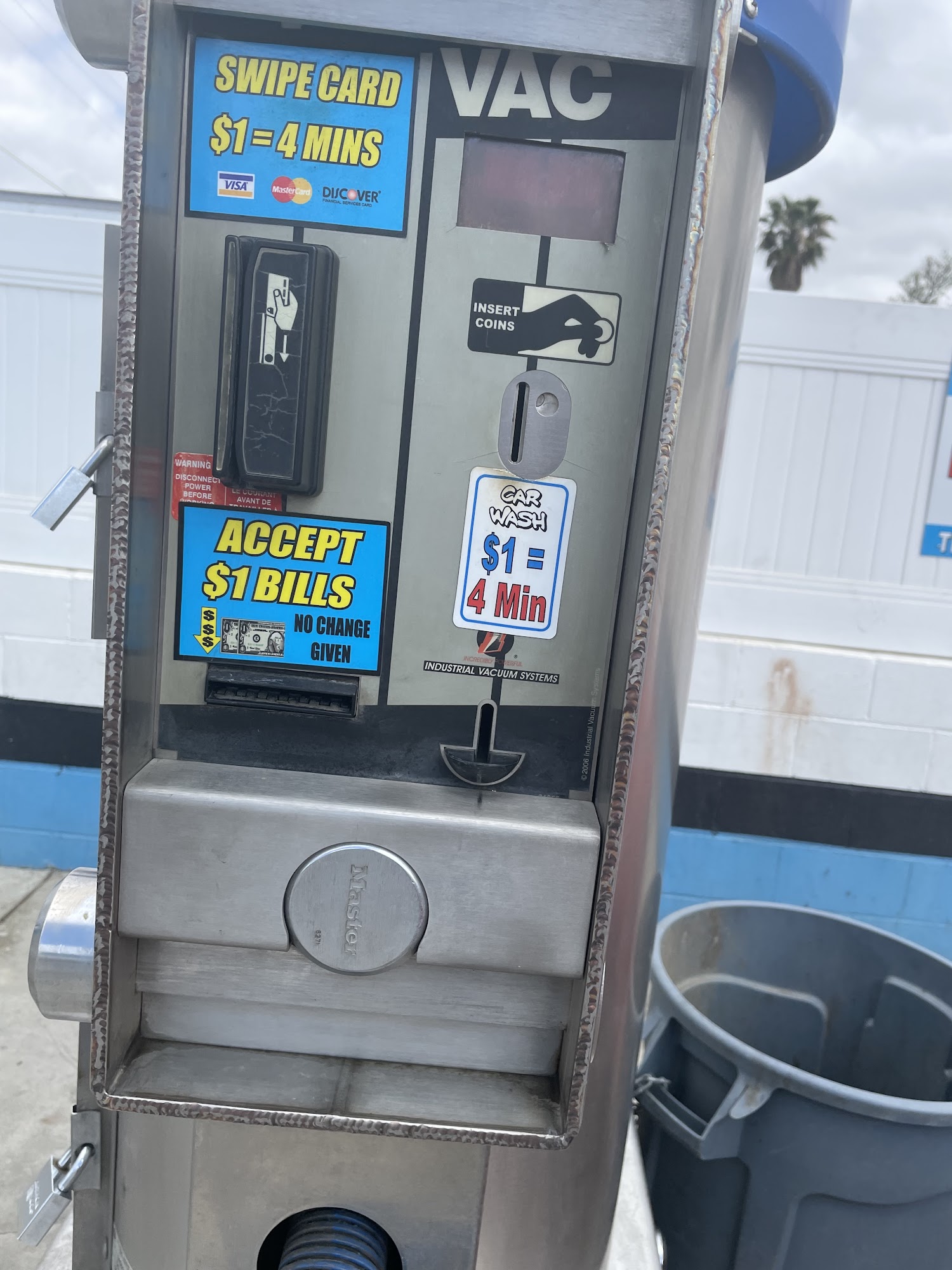 The name is misleading it 2 bucks for 4 minutes...don't use the vacumes away from the actual wash bays they have no suction use the one inside the bay.