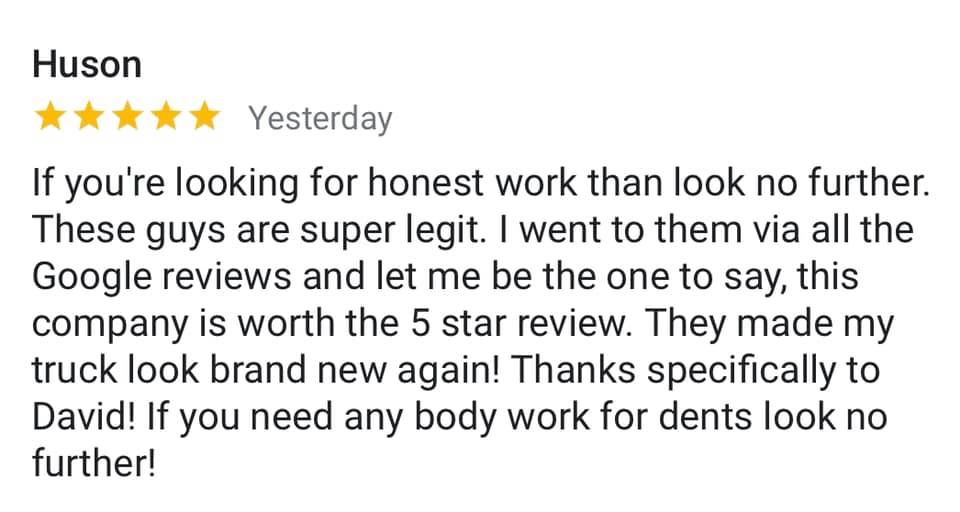My experience was GREAT! He was professional and the quality of work was superior. Extremely happy with how my car turned out. I will defiantly use DenTrix PDR in the future and i will recommending it to my friends and family.