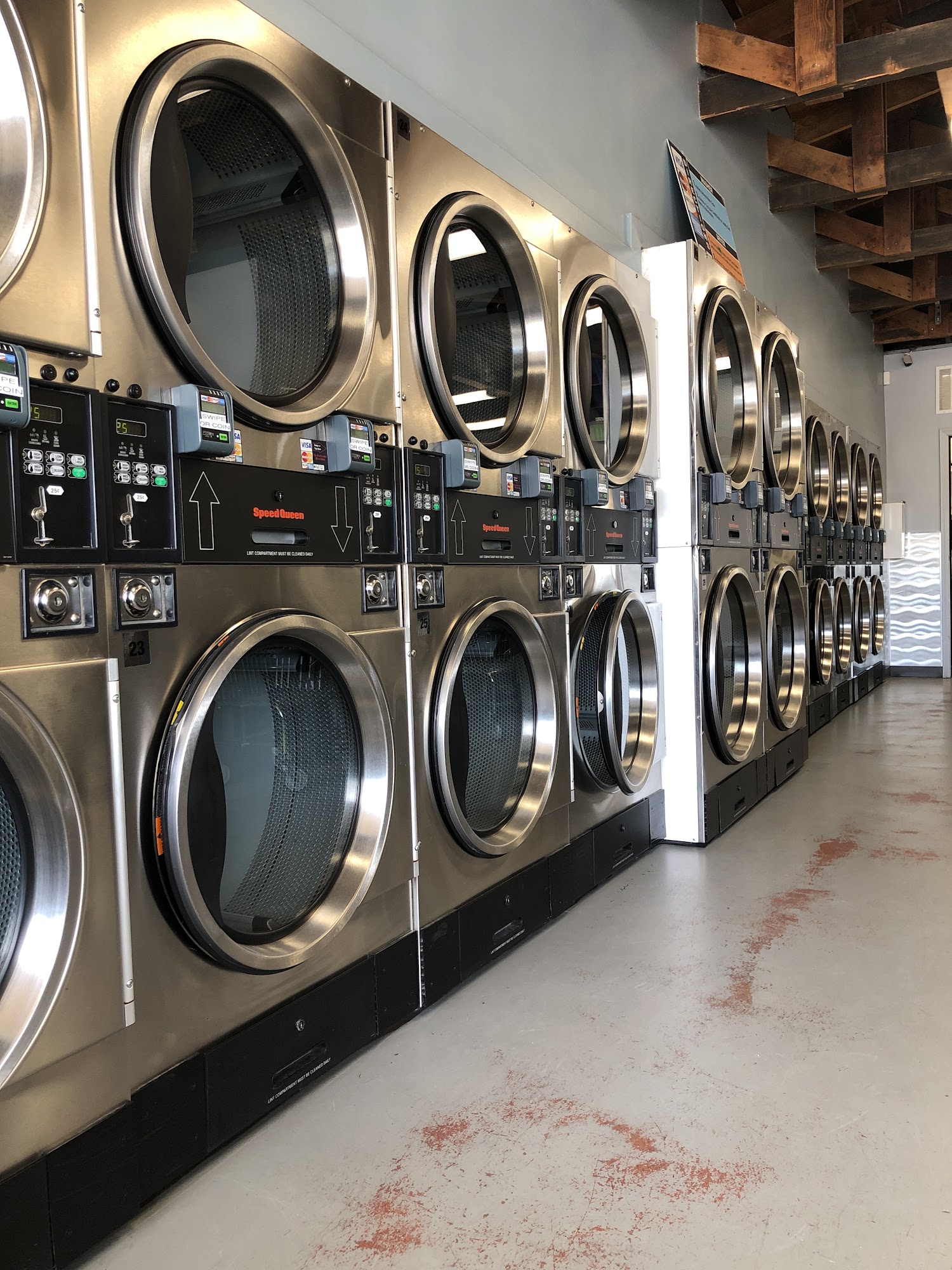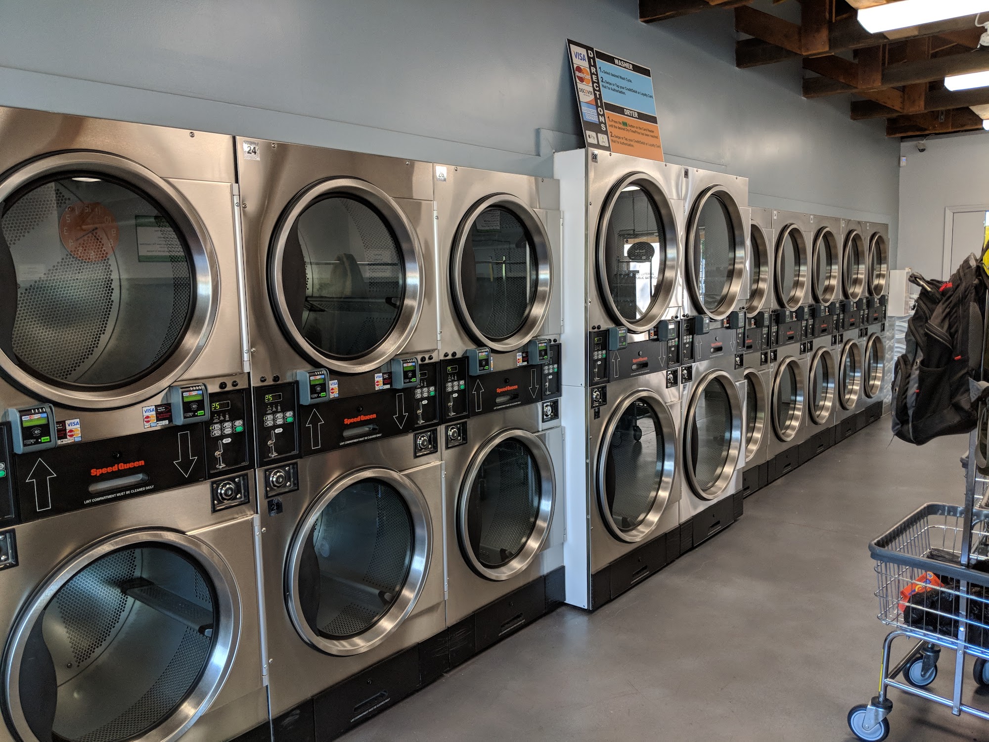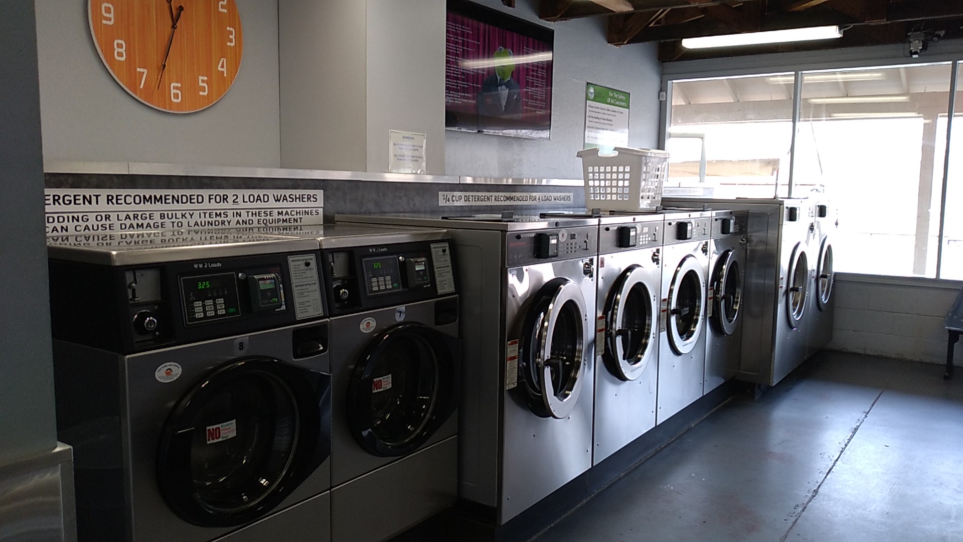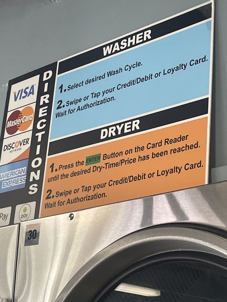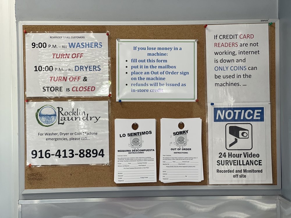 Clean, well-maintained laundromat with modern, highly efficient equipment that lets you wash and dry your clothes quickly. Bright and airy inside. Ample parking. Free WiFi. We sell soap and other laundry supplies on site. All machines take quarters, credit and debit cards, as well as Apple Pay and Android Pay. Change machine on site. Wash and fold service available. Open 6:00 a.m. to 10:00 p.m. every day of the year. Last wash starts no later than 9:00 p.m. We welcome you to Rocklin Laundry!