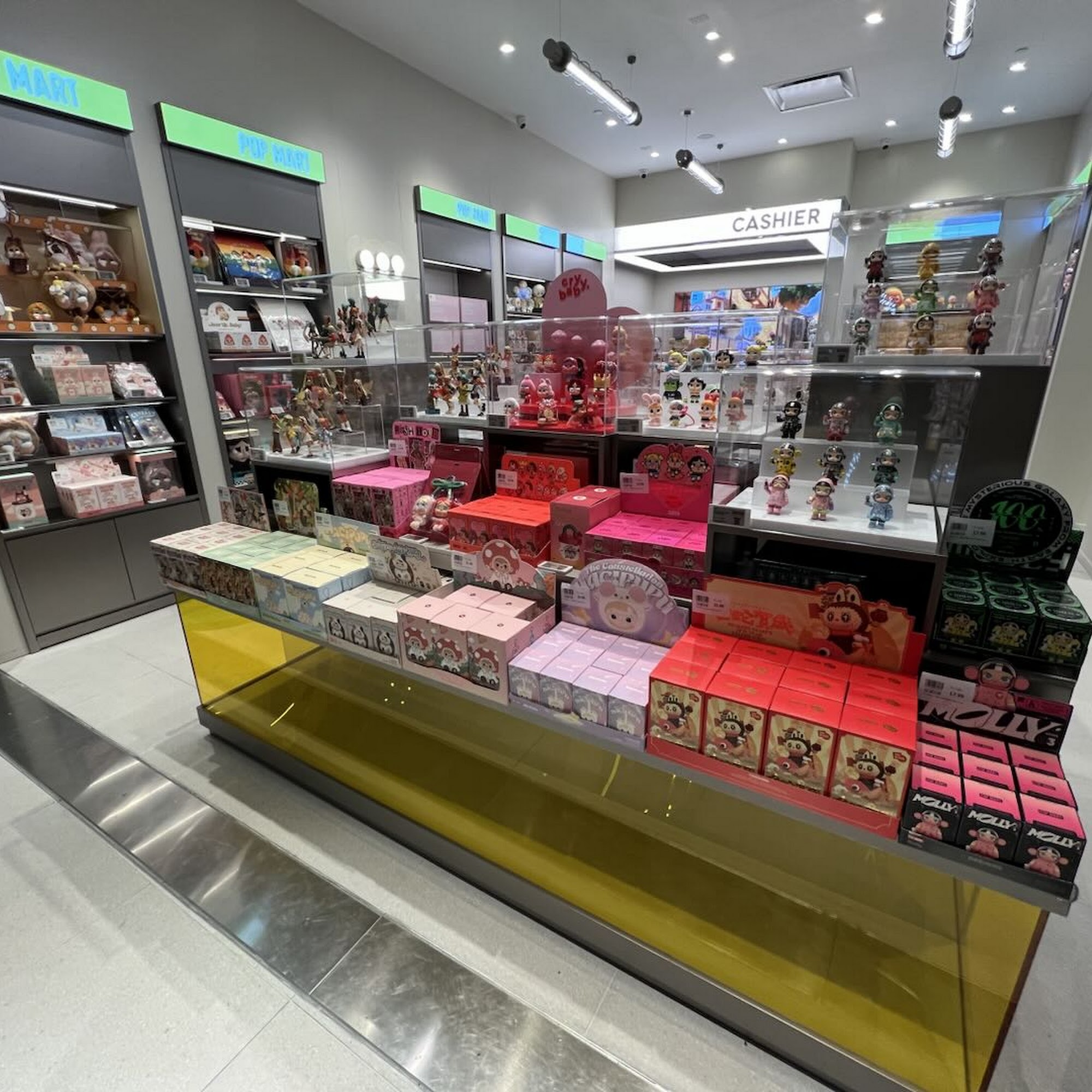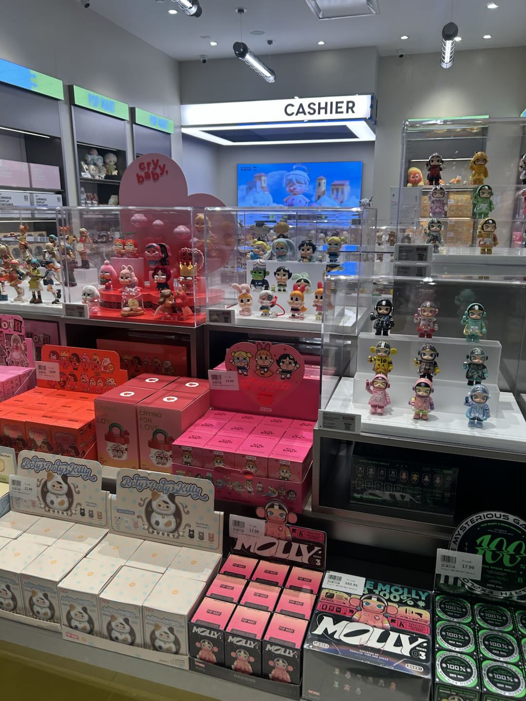 POP MART is a fun and cute store with nice displays. The space is small, so it can get very tight and crowded, and there is often a long line to get in. Staff are nice, excellent, friendly, helpful, and attentive. The selection is small, not very much stuff, and they do not carry the more popular items like labubus at the store. Prices are similar to online stores. It is a really fun place to shop in person.