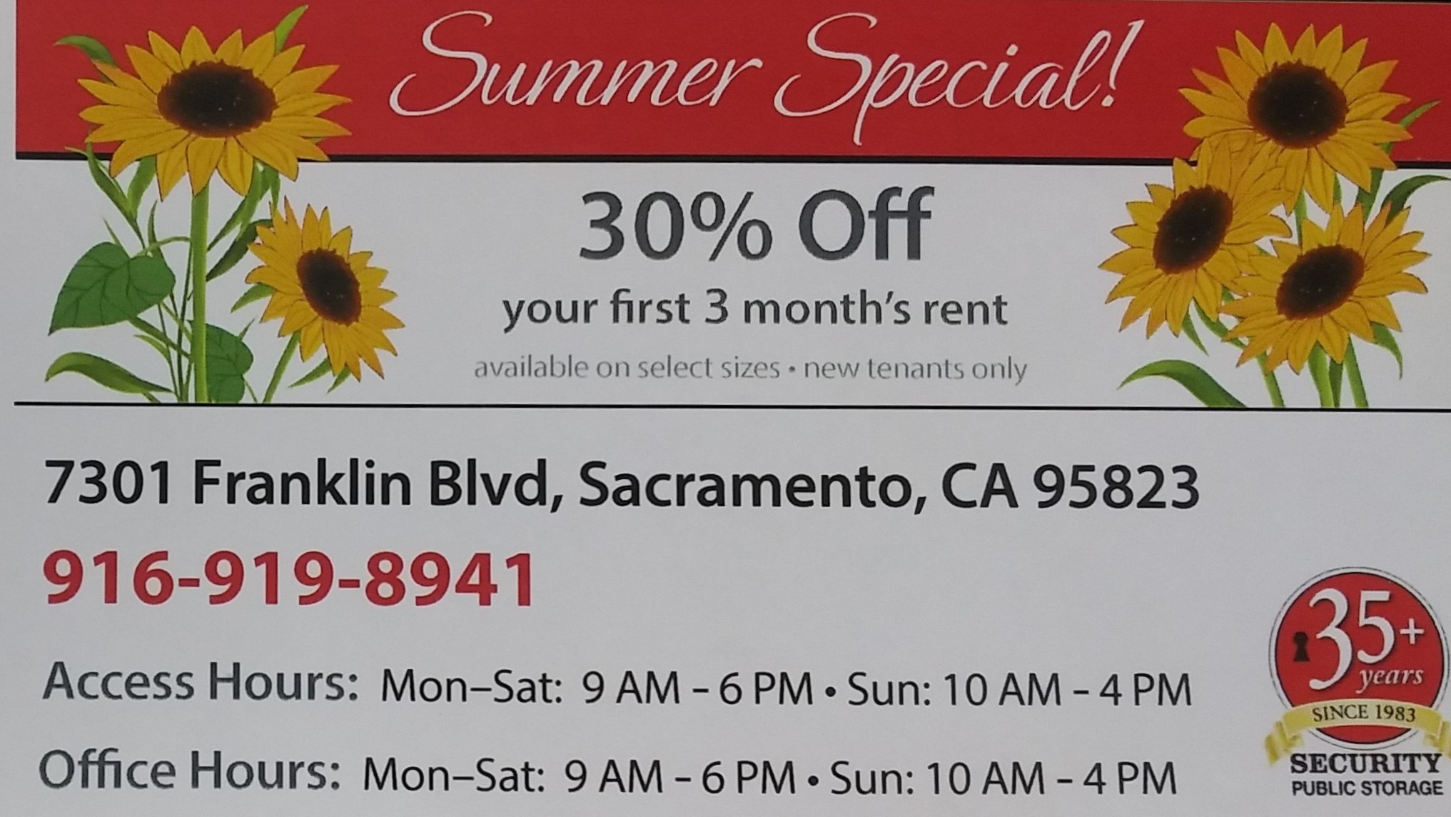 Security Public Storage in Sacramento, CA, serves the Sacramento metro area with four convenient locations. Our Franklin Blvd. facility, located in Southgate Plaza near Highway 99, is Northern California’s first all-enclosed, drive-thru self-storage facility. We offer both climate-controlled and traditional storage units, each with individual security alarms. Enjoy secure access with automated gate entry and 24/7 video surveillance. We also sell moving supplies like boxes, locks, and packing essentials. With no deposits, no admin fees, and competitive pricing, we make storage simple and affordable. Family-owned since 1983, we're committed to clean, secure storage. Reserve your unit online today!