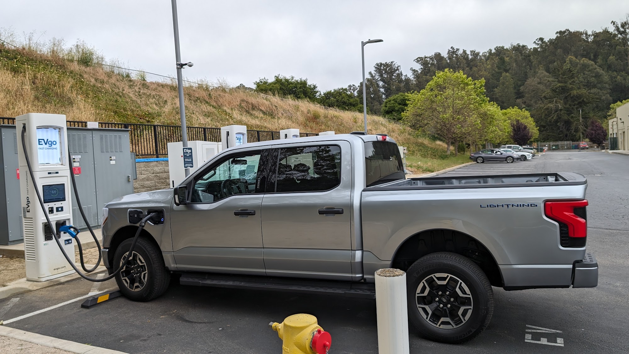 This is actually a very efficient charging station in the Prunedale Shopping Center. The chargers themselves are sort of hidden away which I think makes them less crowded and more available. My MACH E was able to get to 100 KW/hr and charged in no time! Places to eat with restrooms nearby as well.