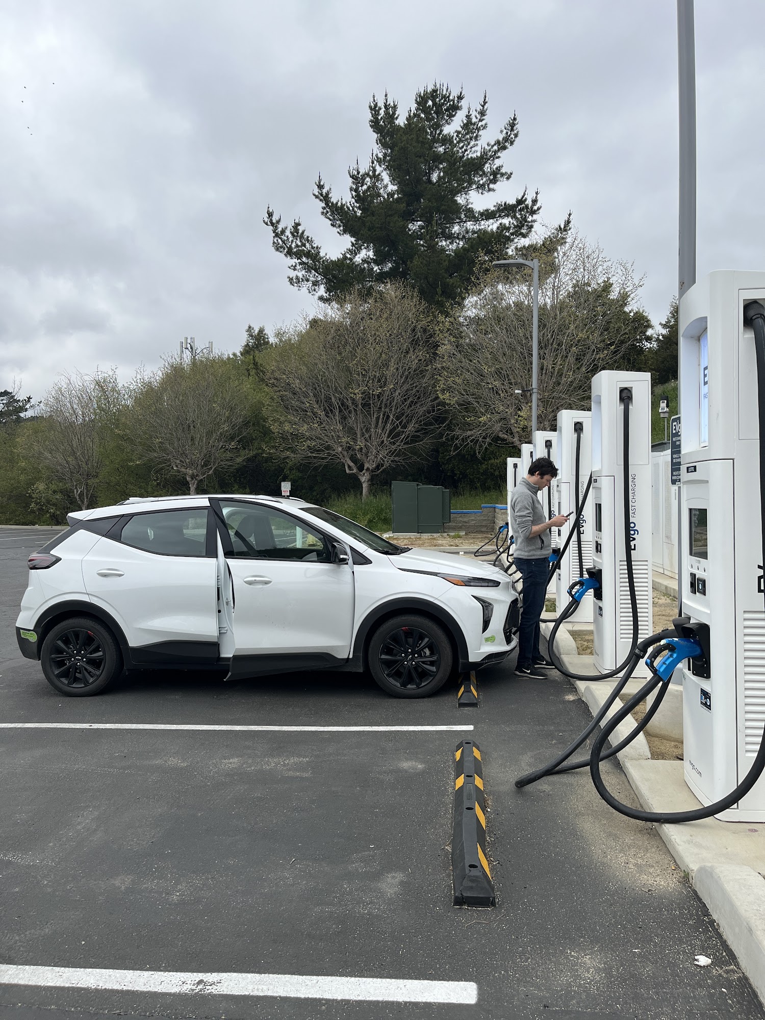 This very efficient charging station in the Prunedale Shopping Center are plenty of chargers hidden away and more available. The chargers are fast, new and really fast, with six chargers higher chances of one available. EV can reach 100 KW/hr or average around 40 kW. The area is safe with tons of lighting, clean and not messy. Nearby places to eat CVS, Mexican, Chinese, Subway and restrooms. The area is perfect for a road trip from N Cal to S Cal while you wait.