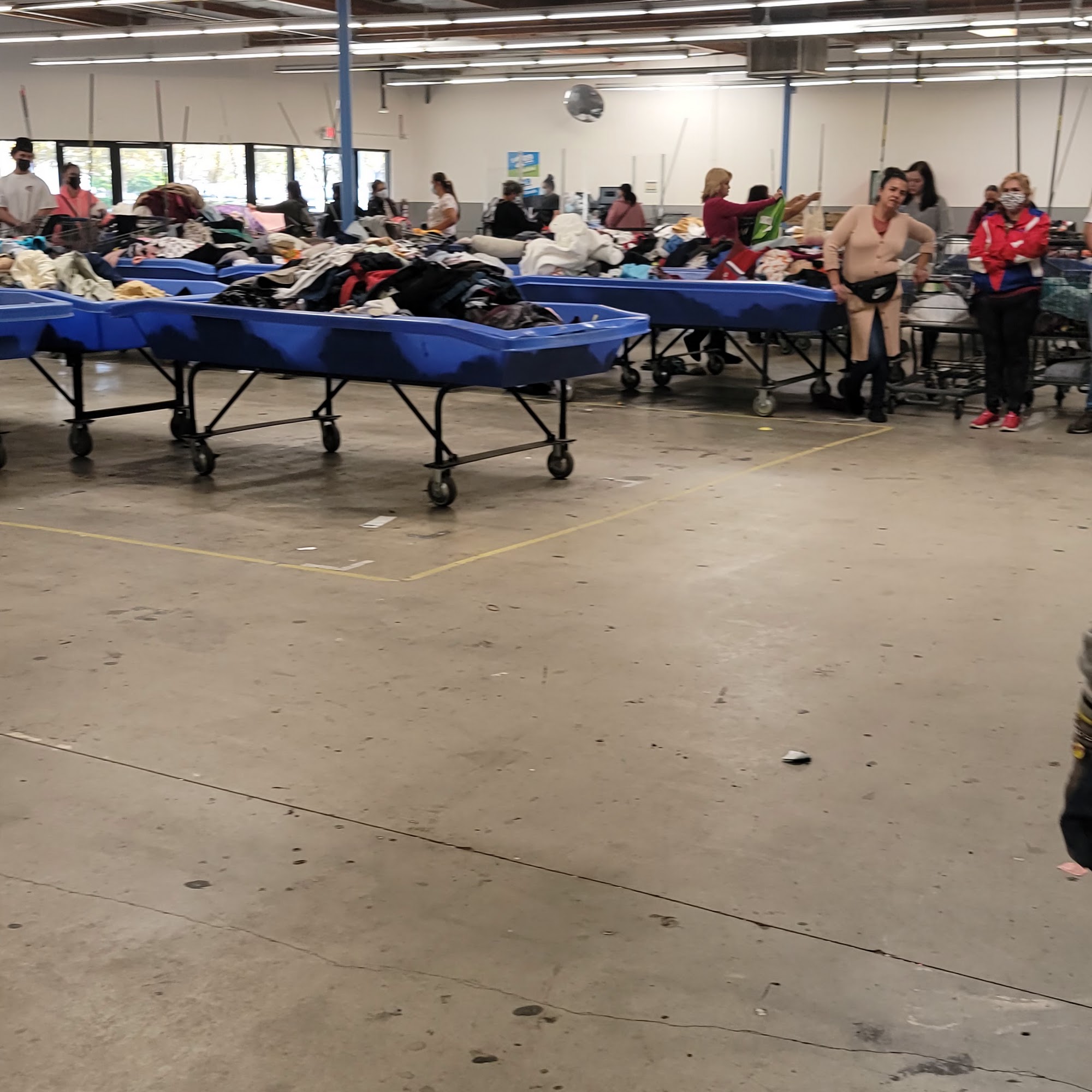 The Goodwill Outlet Store, commonly called "the bins," is a unique thrift shopping experience focused on bulk, by-the-pound pricing. The environment is consistently described as disorganized, messy, and dirty, requiring customers to dig through large bins to find items. The store is primarily filled with clothing bins, with some bins for toys, books, and blankets, though home goods are often considered invaluable. Hard goods and shoes are sometimes put away in the evening. The potential finds are a major draw. Shoppers report discovering excellent condition name-brand shoes like Jordans, clothes with new tags, and quality items such as leather jackets, cashmere sweaters, vintage blouses, and perfect-fitting jeans. Books and blankets have a flat, low price. The pricing structure is a key advantage, with clothing sold by weight at a very low cost per pound, significantly beating traditional thrift store prices. The store is not for everyone. It is recommended for resellers or those who enjoy the "thrill of the hunt," as finding specific items is rare. It is advised to allocate at least two hours for digging, to avoid late visits when no new bins are put out, and to be aware of specific location rules for new bin rotations. The store is also noted as not kid-friendly due to the chaotic and potentially dangerous environment. Despite the chaos, the staff is frequently praised as very welcoming, happy, well-organized, and polite. The parking lot is noted as big and clean. Customers advise that patience and thorough searching are required, but the low prices and occasional treasures can make the effort worthwhile.