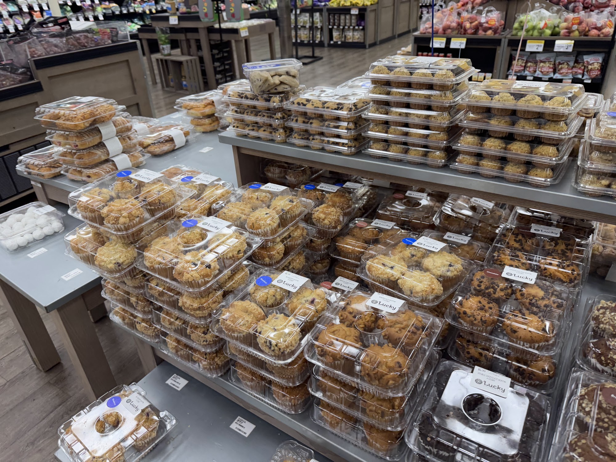 Lucky is a large grocery store with a huge selection of everything, including quality produce, bakery items, and a good selection of products. The deli offers delicious hot and zesty chicken wings, fresh cooked meatloaf, chicken, and ribs. Sales are good most of the time, and there is a clearance section. The store has self-checkout stations, though sometimes the system has issues. While some customers find everything very expensive now, others note it has very good prices and is better than other markets. It is a favorite store that some customers miss.