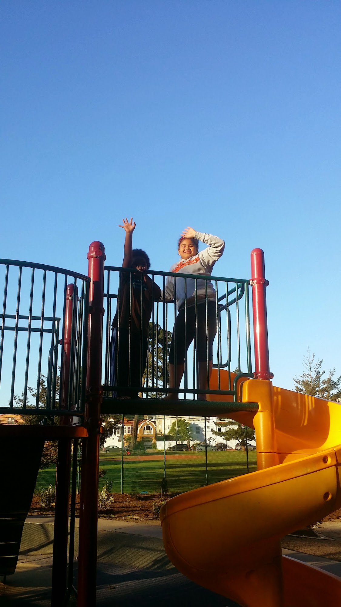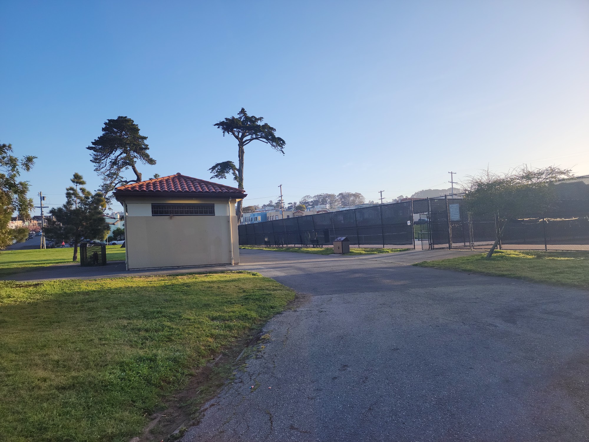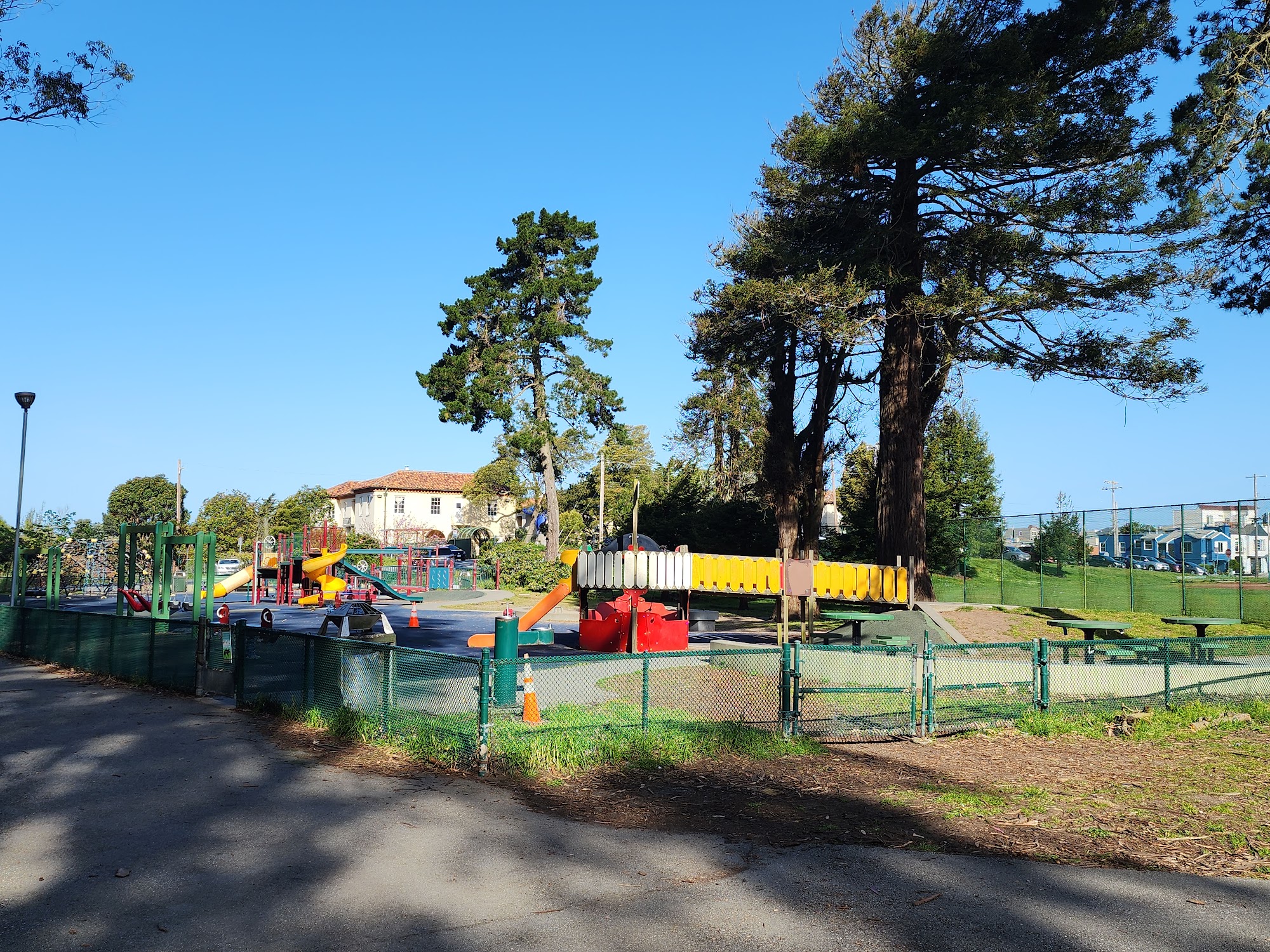 Ample parking, restrooms, closing gates, tiny tots and primary school sized equipment. Perfect soccer pitch with multiple goals for shared practice space. Nice tennis and basketball courts in between field and playground. Clean, colorful with mosaics and full of friendly locals.