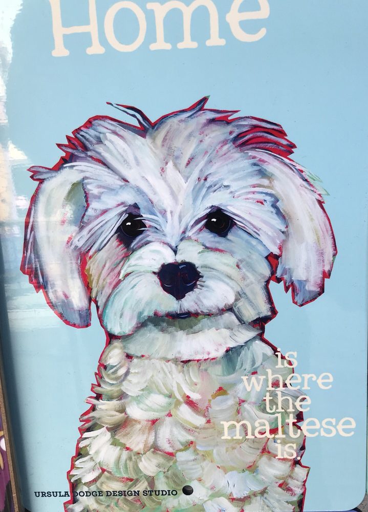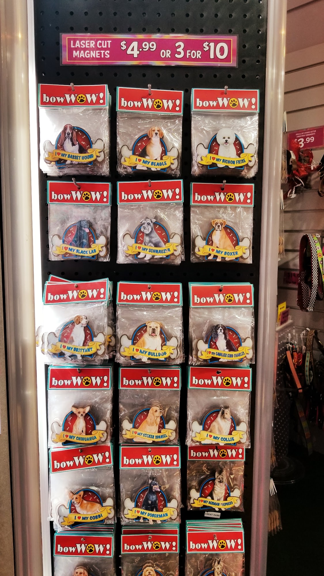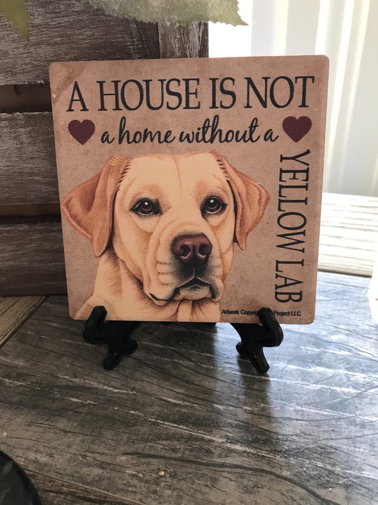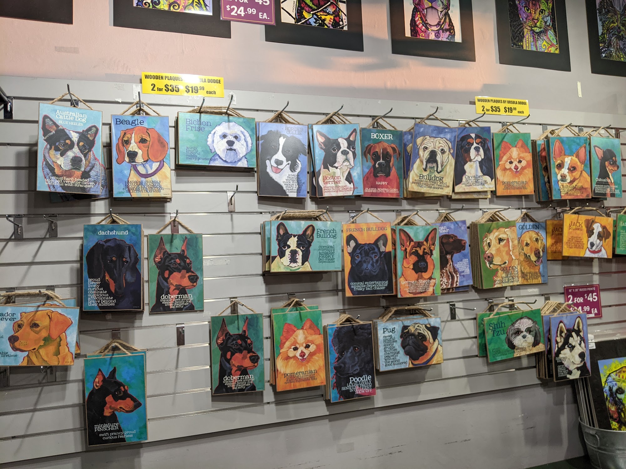 There is a wide variety of dog-related products available, including signage, apparel, and decorative items.