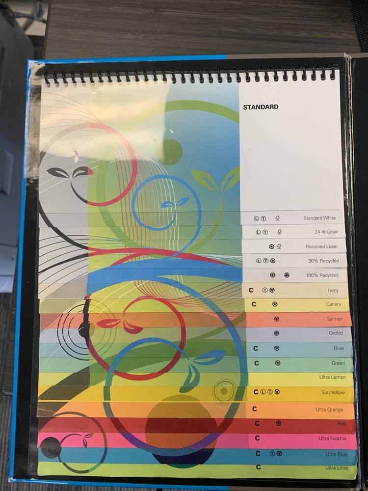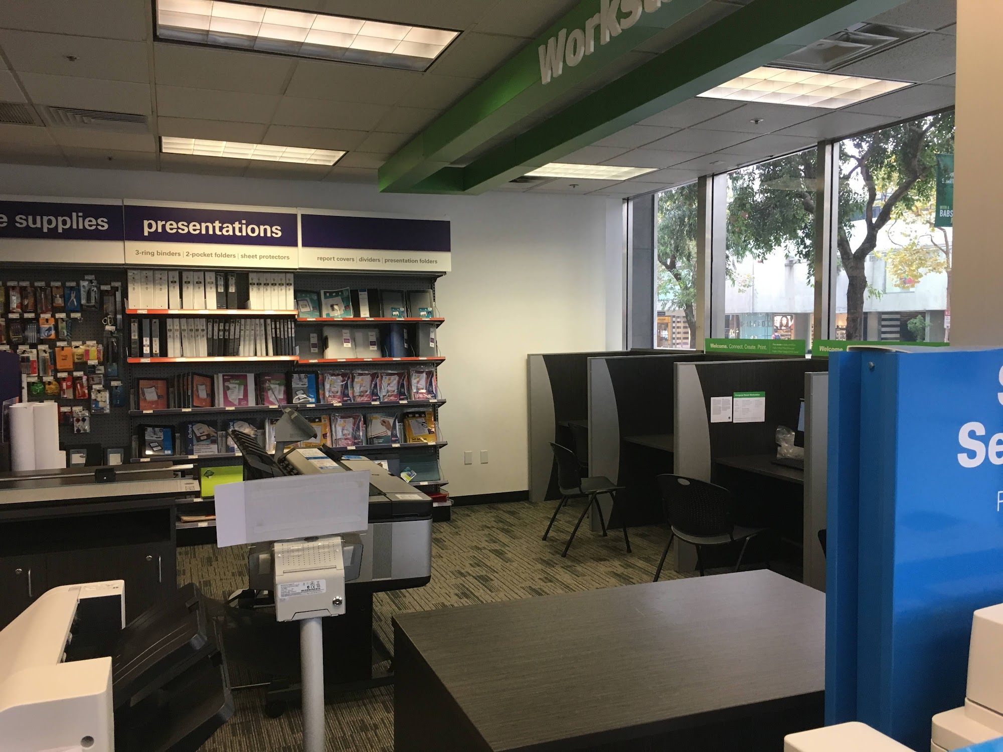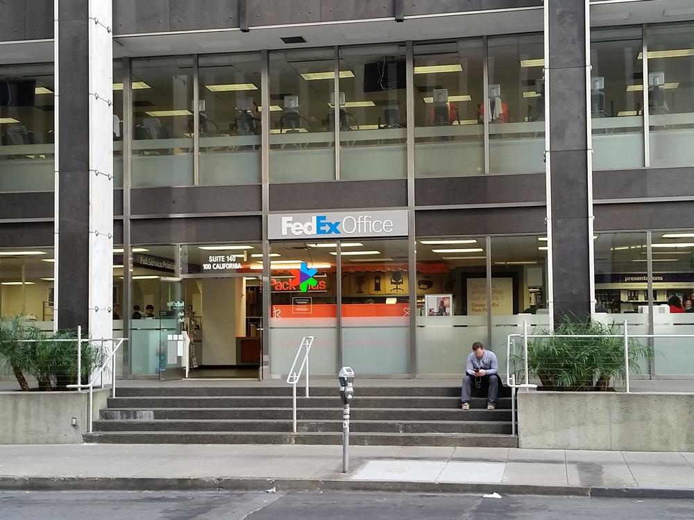 Right at the Drumm St corner of Four Embarcadero (they appear to have moved, judging from earlier photos). Friendly staff and easy printing via email. Cutter is available plus a limited but useful selection of office supplies.