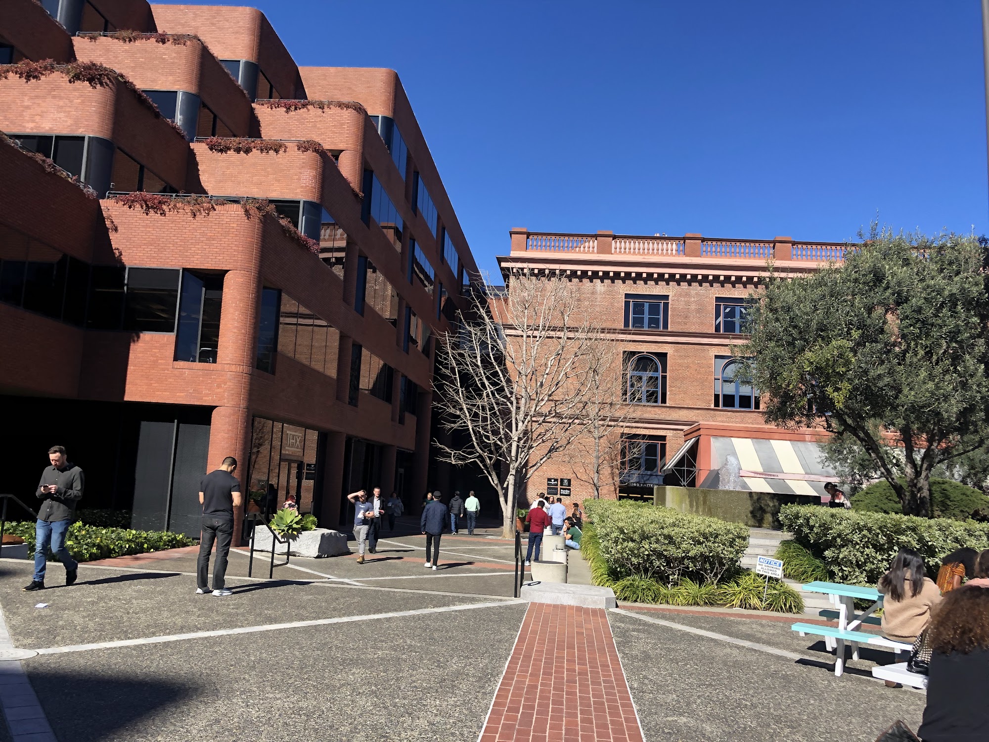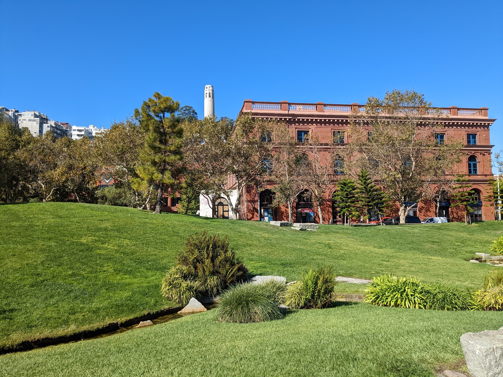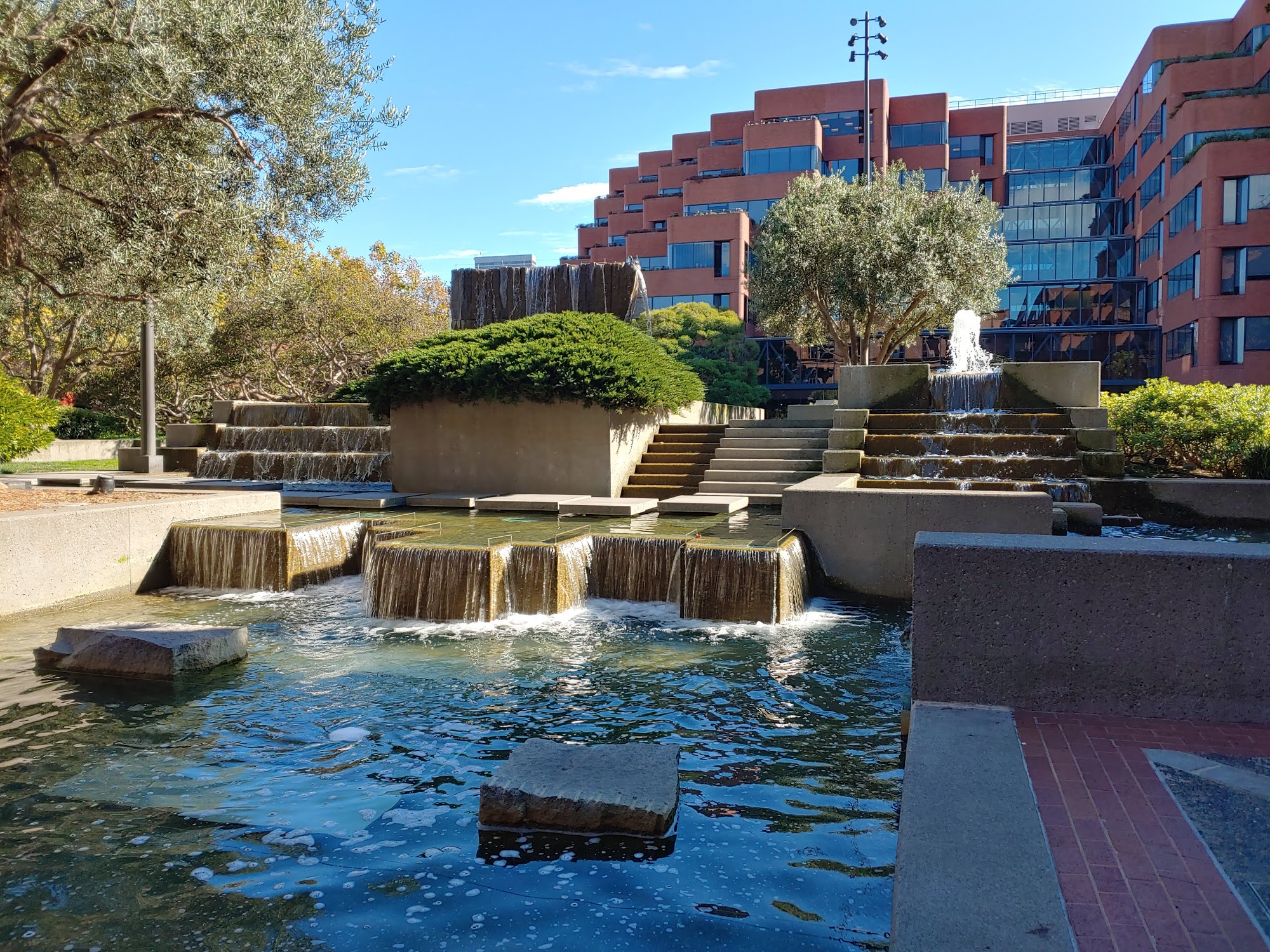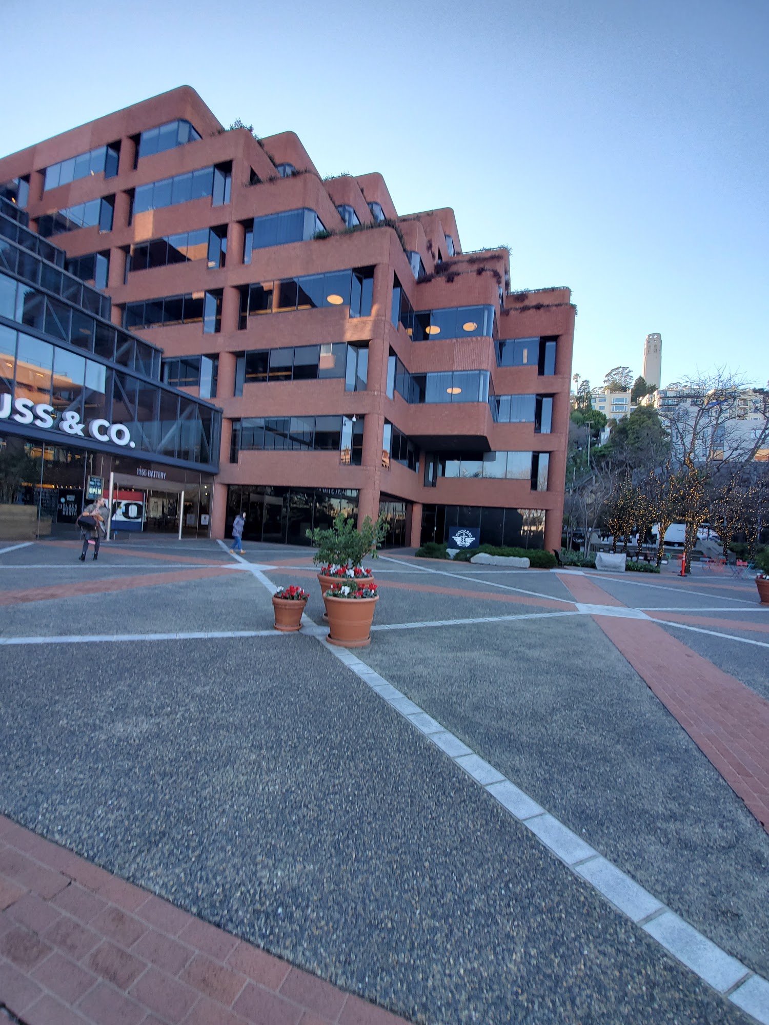Levi's Plaza in San Francisco is a peaceful and beautiful place that offers both a corporate and public space. It is the global headquarters of Levi Strauss & Co., designed in the 1980s with modern office buildings and lush landscaped areas that blend with the city's unique architecture. The plaza features flowing fountains, greenery, and well-maintained grounds, creating a calm, zen-like environment ideal for relaxing walks or quiet breaks. Visitors often enjoy the peaceful garden and scenic photo opportunities, especially with views of nearby Coit Tower. While the plaza is primarily a business center, it also serves as a public space with pedestrian-friendly pathways, outdoor seating, and occasional vendors and food trucks. The area has a family-friendly vibe and is pet-friendly, making it suitable for short visits or relaxing moments. There are shops around the plaza, including a boutique-style Levi’s store with friendly staff and a good assortment of clothing at normal prices. The store, which recently reopened in October 2025, is a must-see, especially with the Levi’s History Center opening in November 2025. Previously bustling with activity and businesses, the plaza has become quieter since the pandemic, with fewer shops and closed restaurants. A weekday food truck offers a convenient and affordable option for visitors. Overall, Levi's Plaza is a notable landmark in San Francisco—a serene oasis that combines modern design, natural beauty, and a touch of history, making it a great spot for relaxation and exploration.