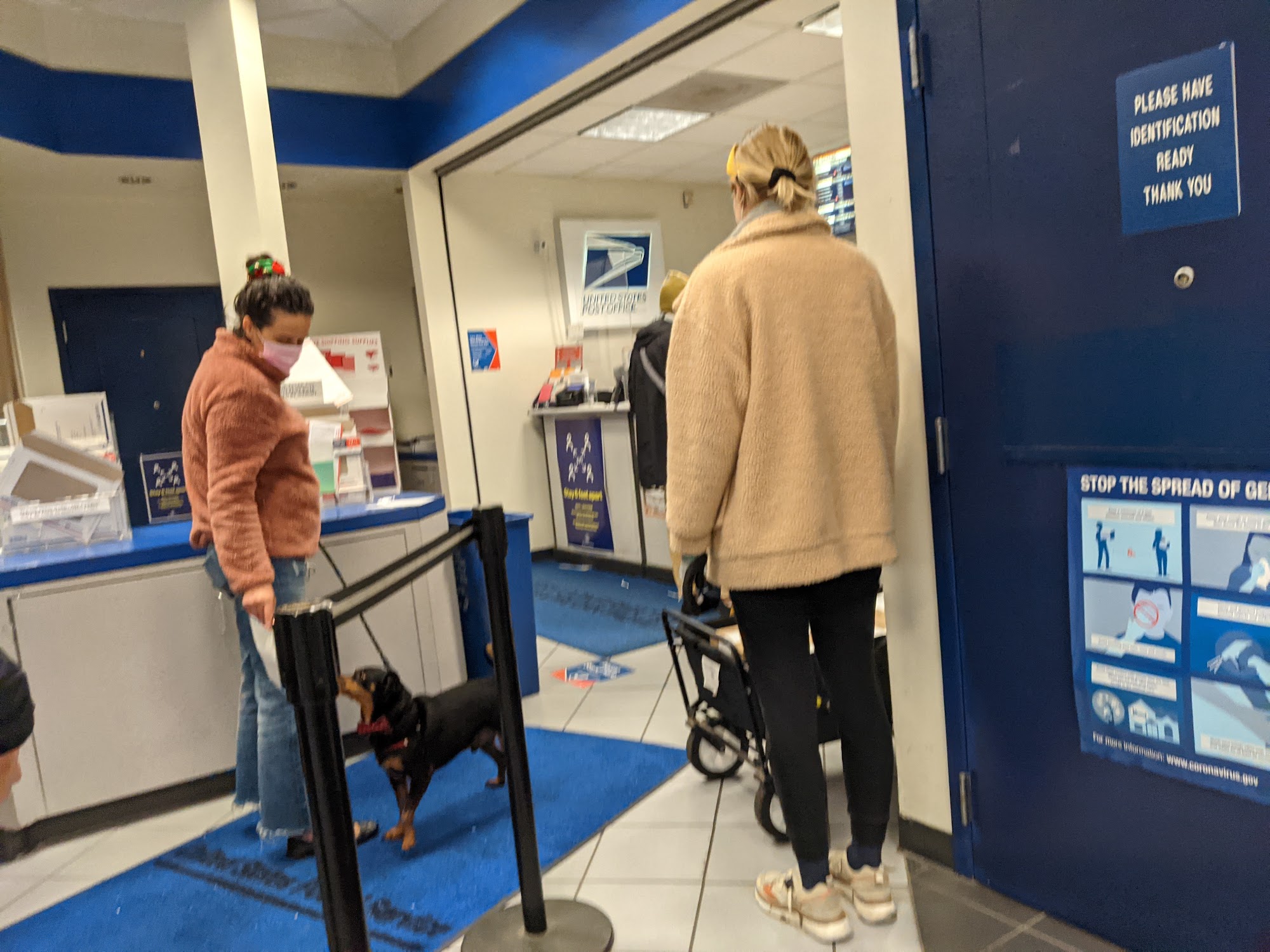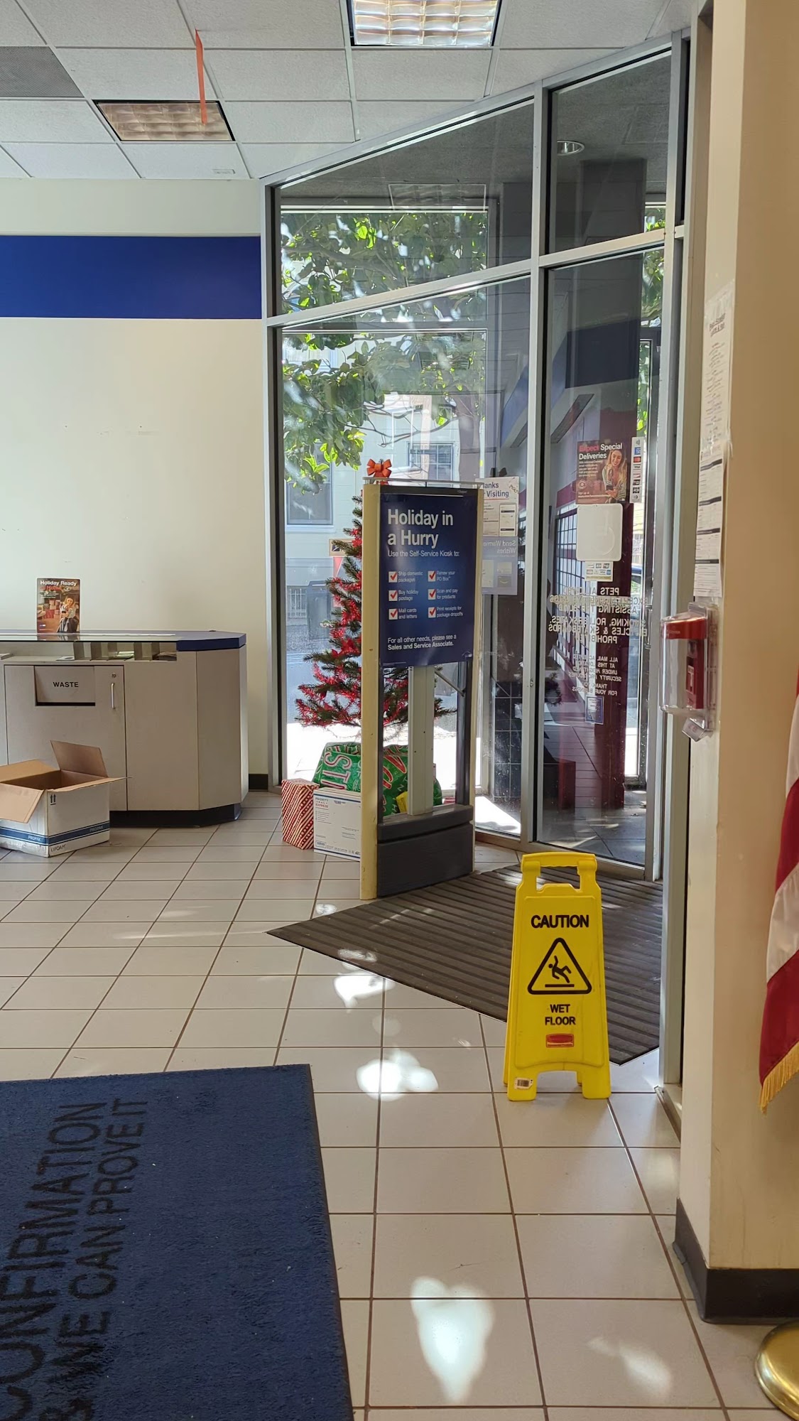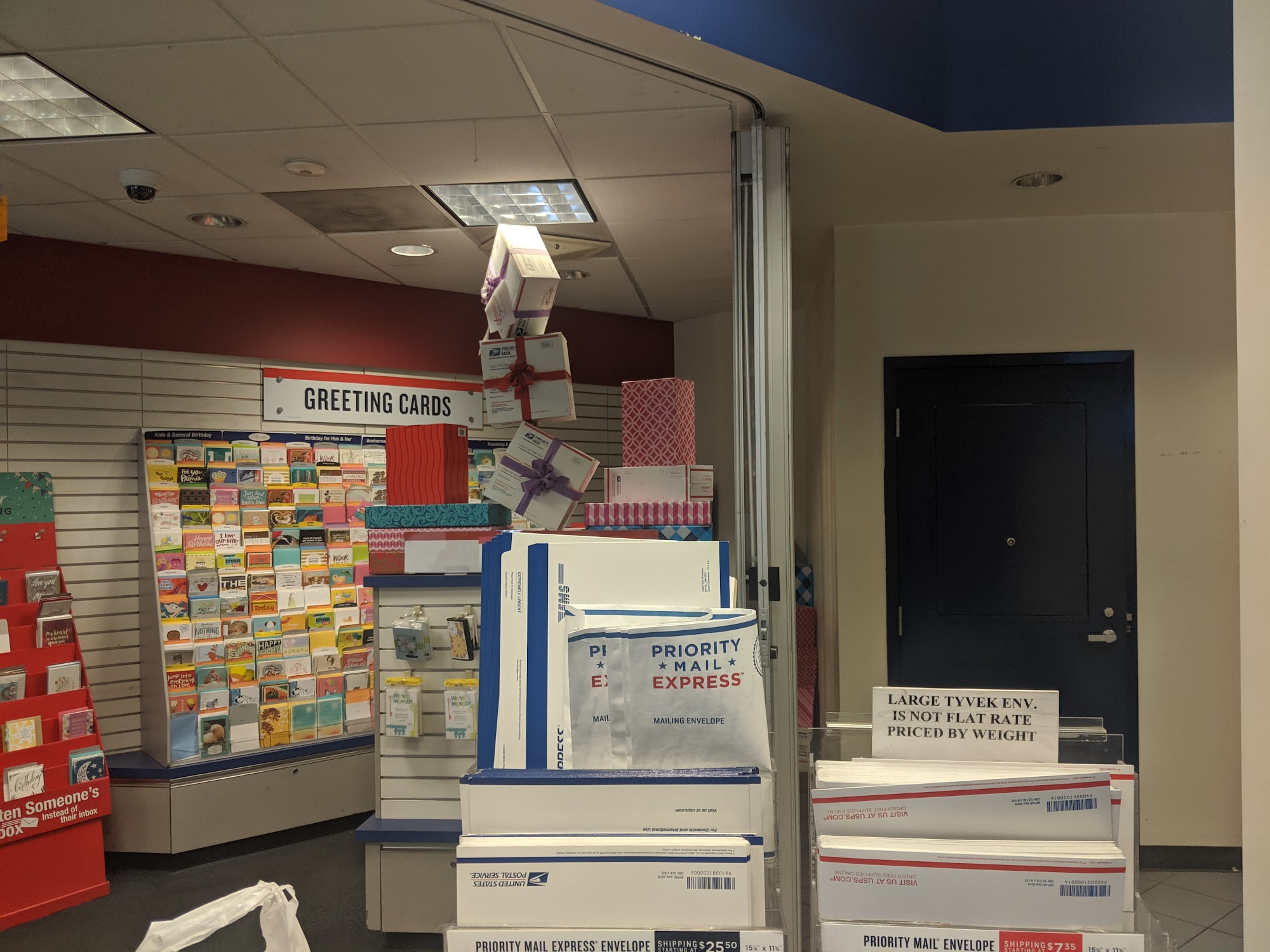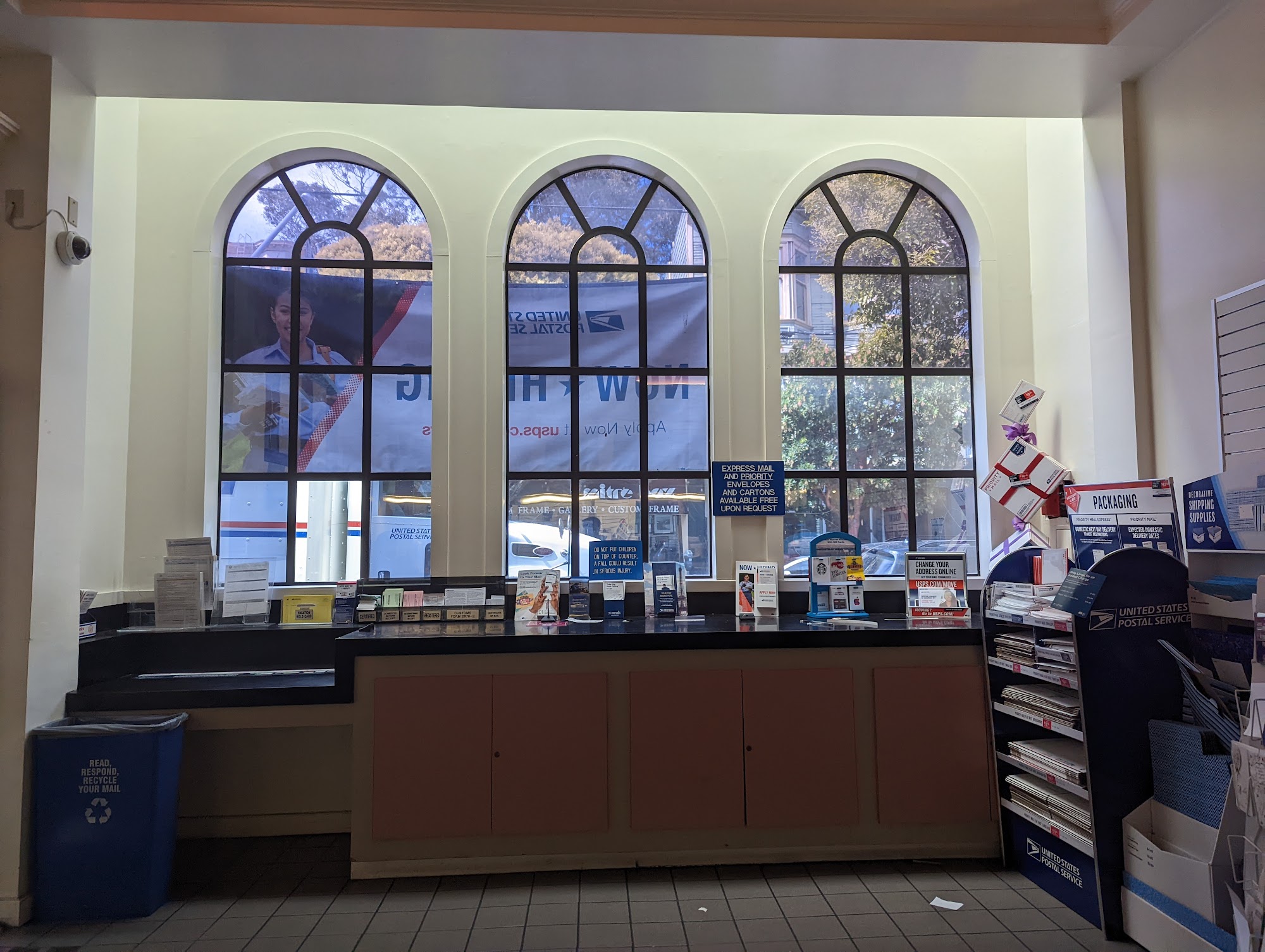 Staff areā¦., lines are manageable most days, everything you could want in a post office is there. Plenty of mailboxes outside.