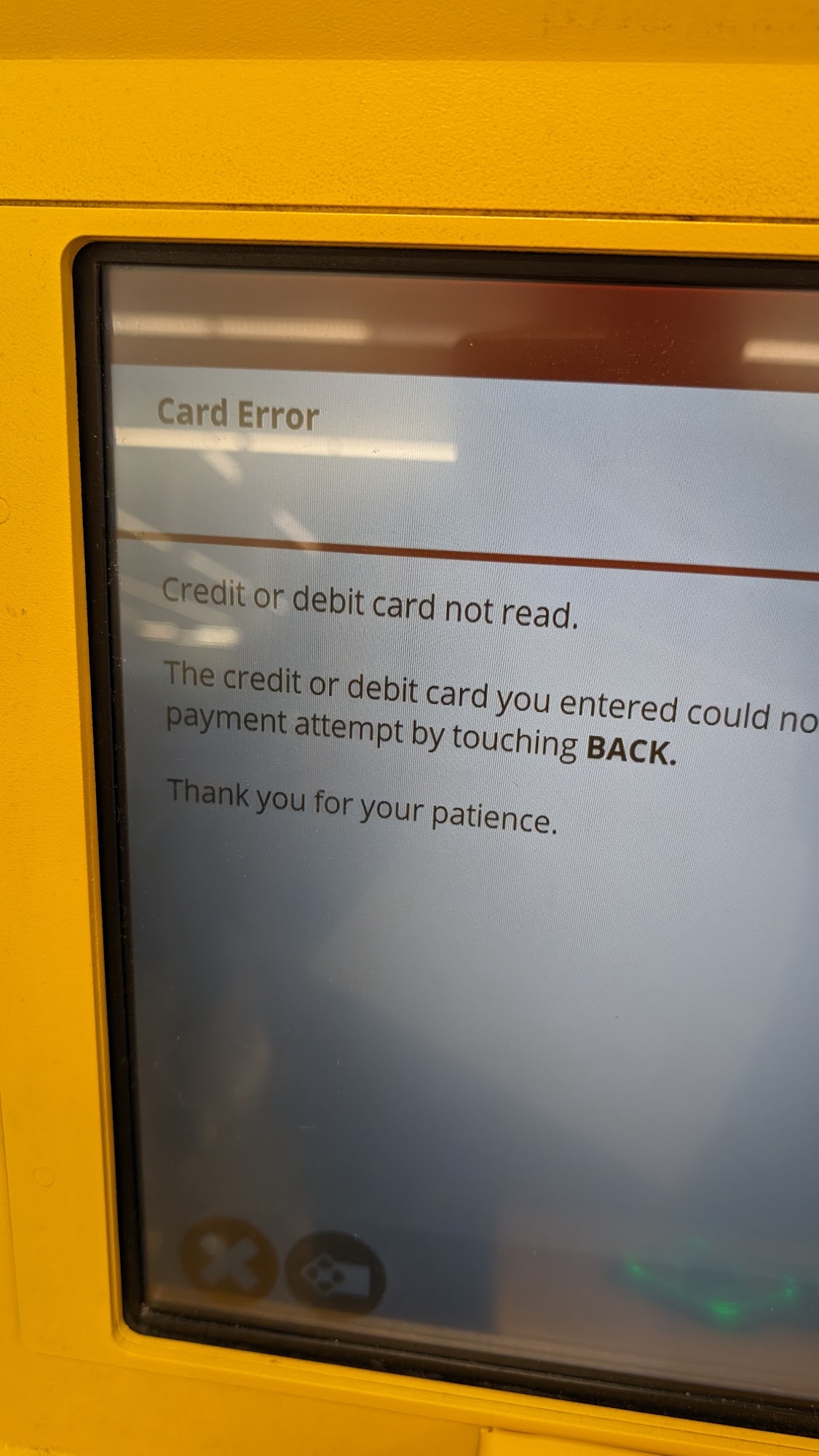 First the bar code doesn't work then spent 10min entering all the information manually then tried two different cards but the payment card reader doesn't work either. I don't know how old this is but it's broken already