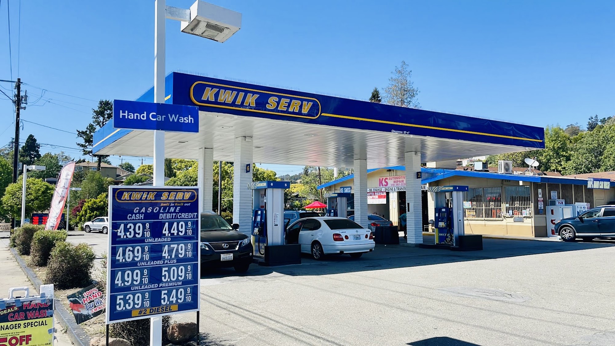 Kwik Serv is a well-organized and clean business that offers a variety of services including gas, snacks, a mechanic, smog check, and hand-washed cars. The staff is friendly and provides fast service, often engaging with customers and making them feel welcome. The location features a wide selection of products and maintains a high level of cleanliness, which has improved recently under new management. Customers appreciate the convenience of the one-stop shop, with options like a small convenience store and additional facilities. Overall, Kwik Serv is known for its friendly atmosphere, cleanliness, and helpful service.