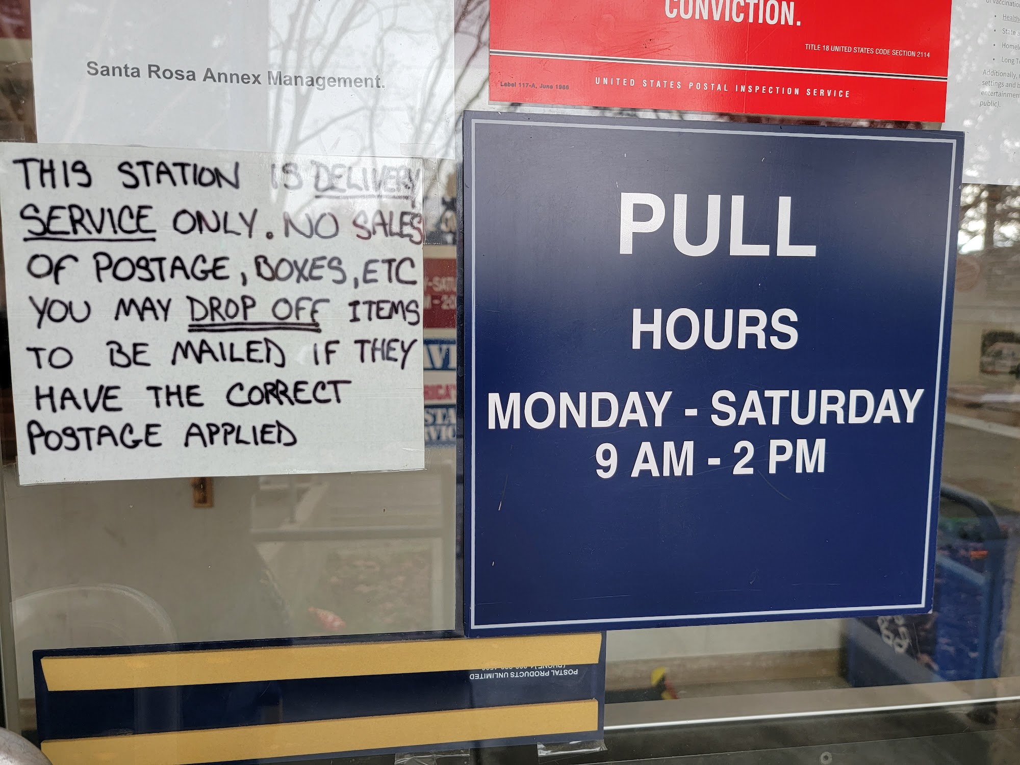 I've never had an issue with this post office anex. The location is what it is, but the service has always been awesome! I've been visiting this location for pick ups and prepaid drop offs for 10 years now. Just ring the brass bell! :)