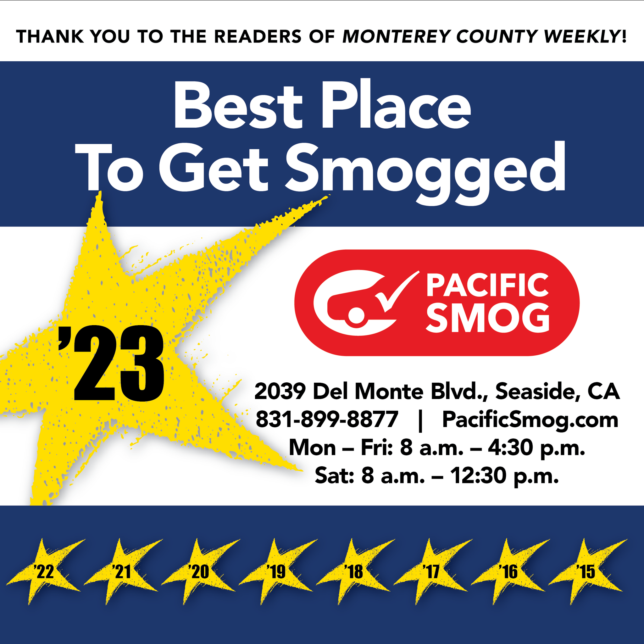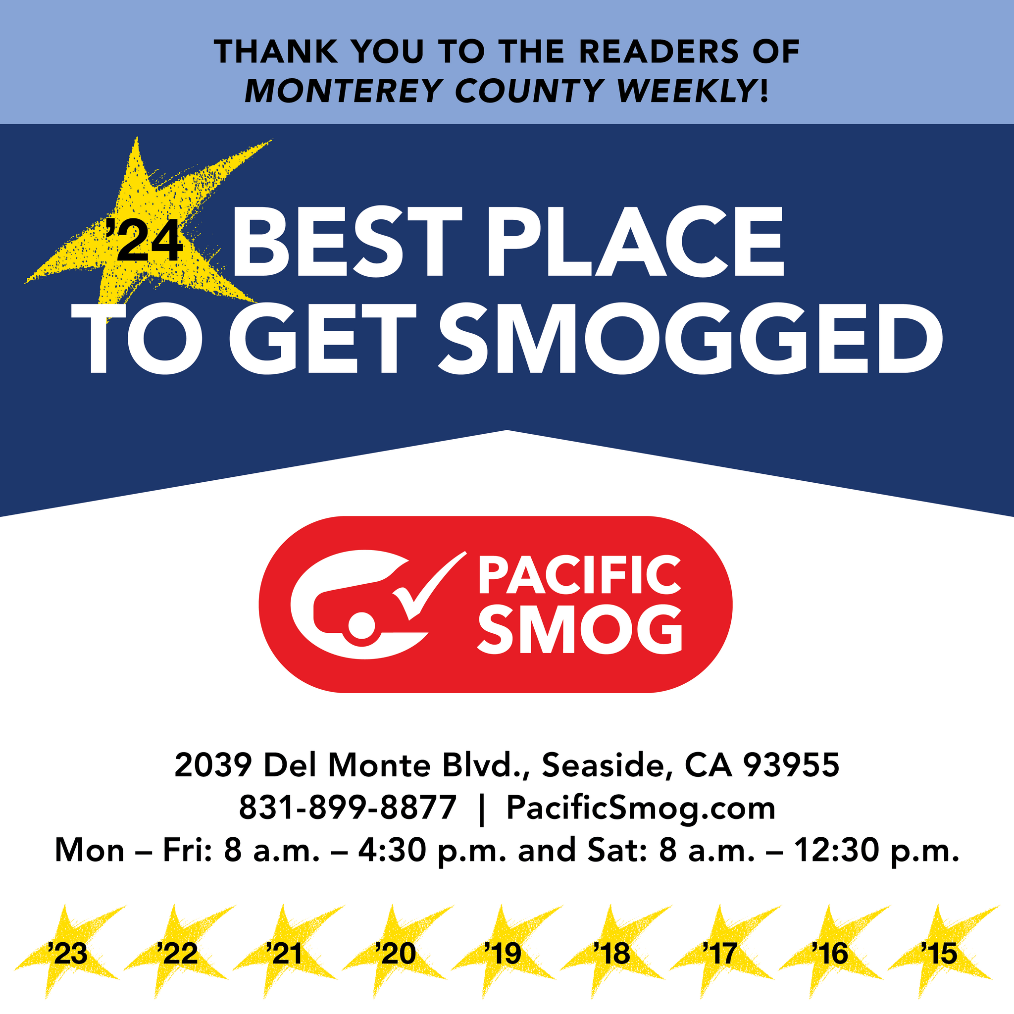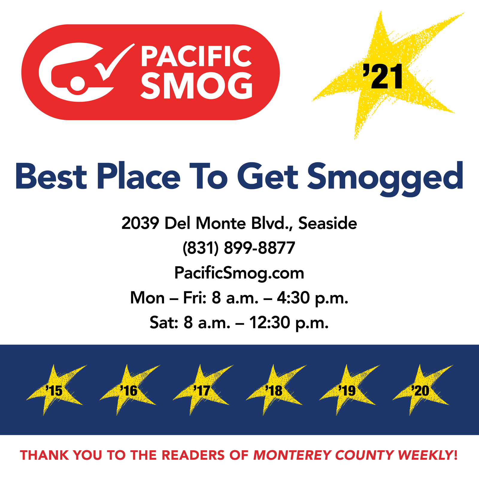 Pacific Smog, located in Seaside, CA, has been a family-owned smog testing facility since 1991. Known for its fast, efficient, and friendly service, this state-licensed Test Only station offers emission testing to vehicle owners across Seaside and nearby areas. Customers appreciate the quick turnaround, often completing tests in under 10 minutes, without the need for appointments. Walk-ins are welcome, except for RVs, which require a call ahead. The staff is praised for their professionalism and excellent customer service, making the testing experience pleasant. Additionally, the business enjoys a convenient location and a welcoming atmosphere. With fair prices and a commitment to quality, Pacific Smog has earned a reputation for reliability among its clientele, ensuring they will return for future smog testing needs. Business hours are Monday to Friday from 8 a.m. to 4:30 p.m. and Saturday from 8 a.m. to 12:30 p.m., with Sundays closed.