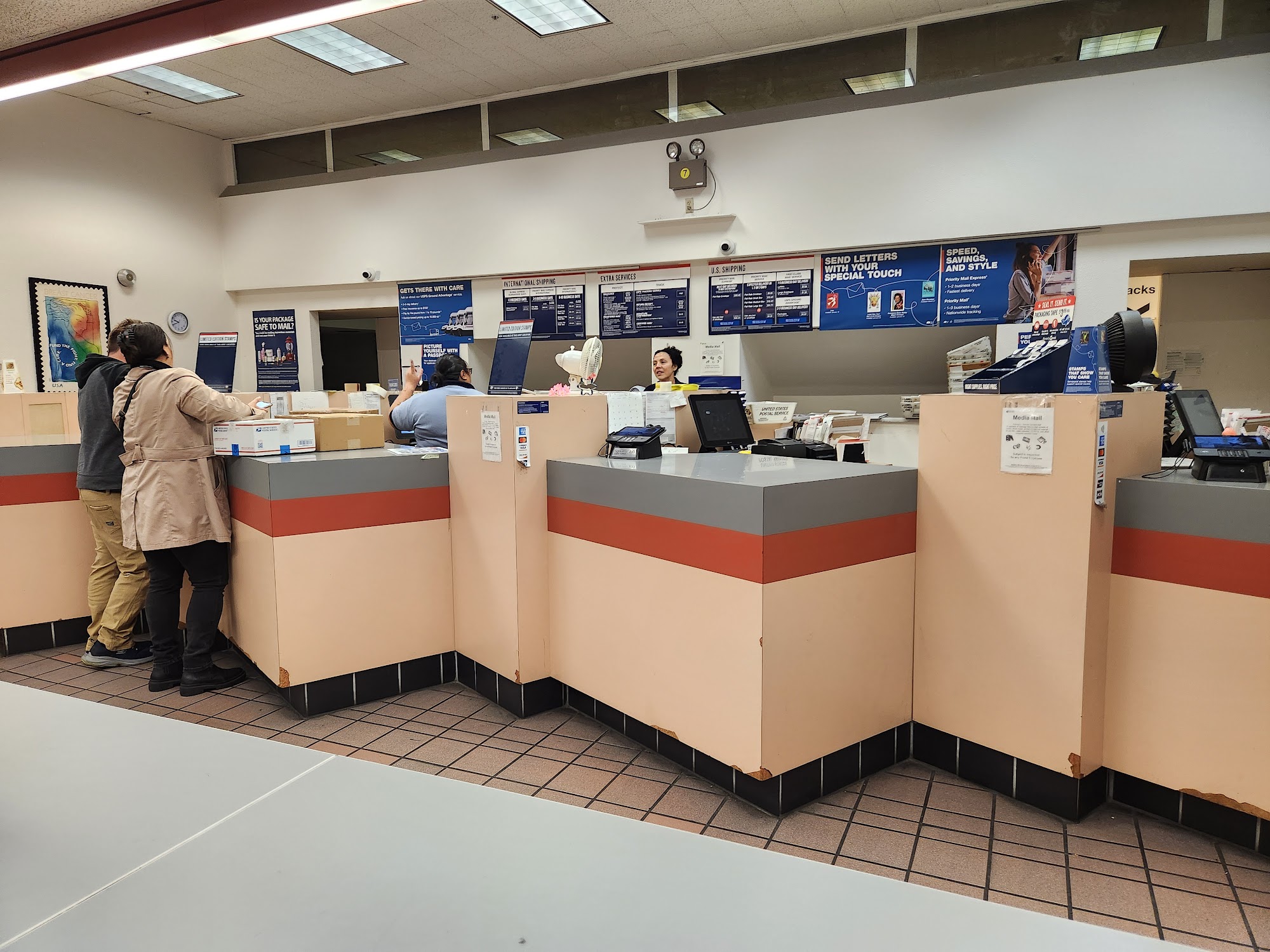 This United States Postal Service location is described as quick and clean, with friendly tellers who try to help customers save money. Reviews note the staff is responsive and helpful, with one instance of quick action to resolve a mail issue. The location is in a kind of run down area with lots of homeless people around. While generally efficient, some note the prices seem to change and occasional mistakes can happen, so it is advised to watch the transaction. Wait times are usually not long, though staff can sometimes take long with some people.