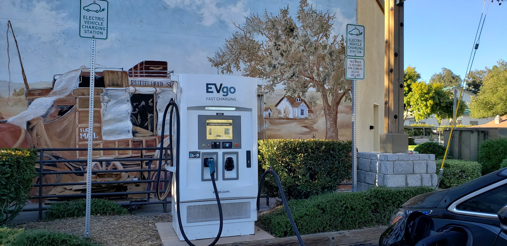 There is a fast charge station, and a regular charge station. They seem to work, however I tried each one and they don’t work with Tesla, even with the adaptor that you get through Tesla.