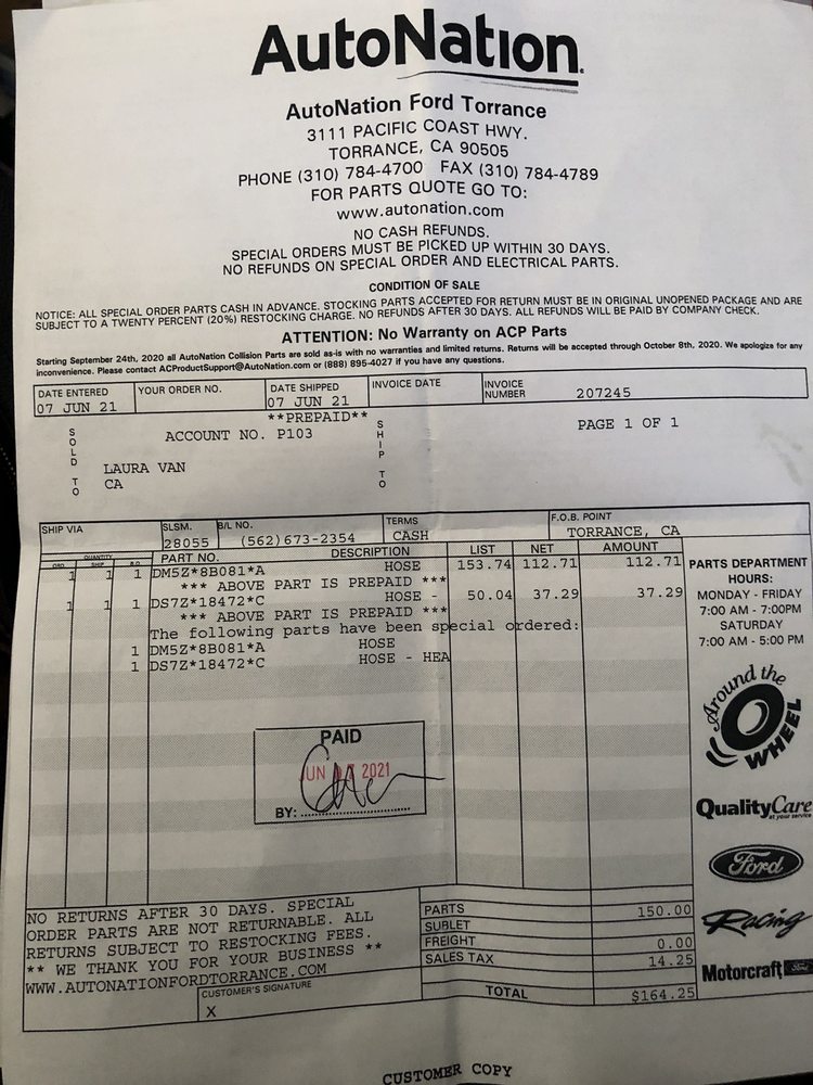 AutoNation Ford Torrance Service is always a pleasant experience for me. Advisors have always been attentive when i arrive and easy to work with. Never pushy or trying to up sale what my vehicle needs. Vehicle is fixed correctly and treated with care.
